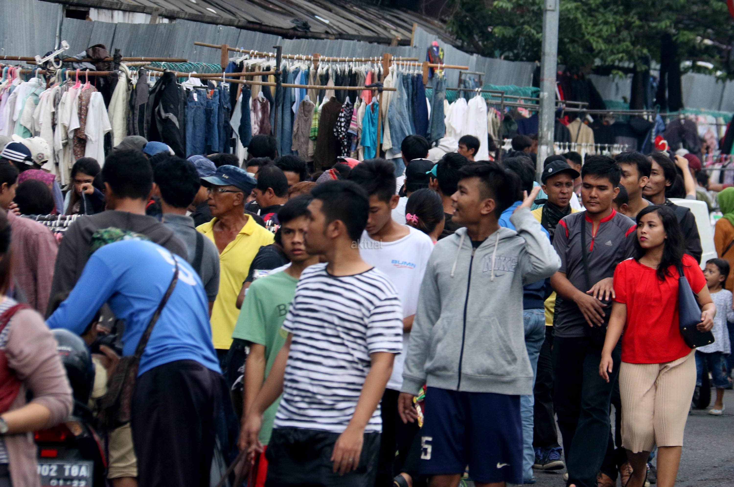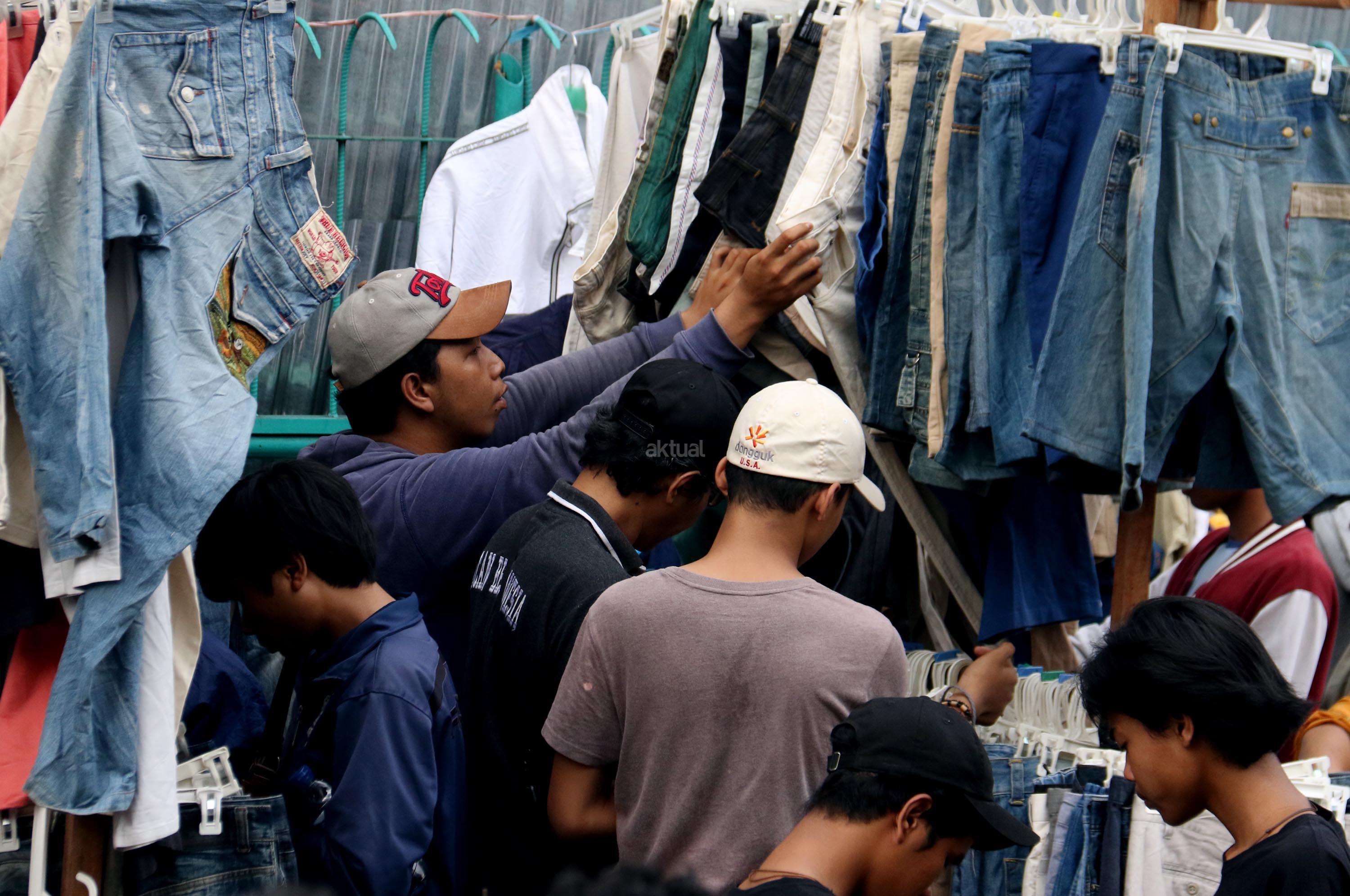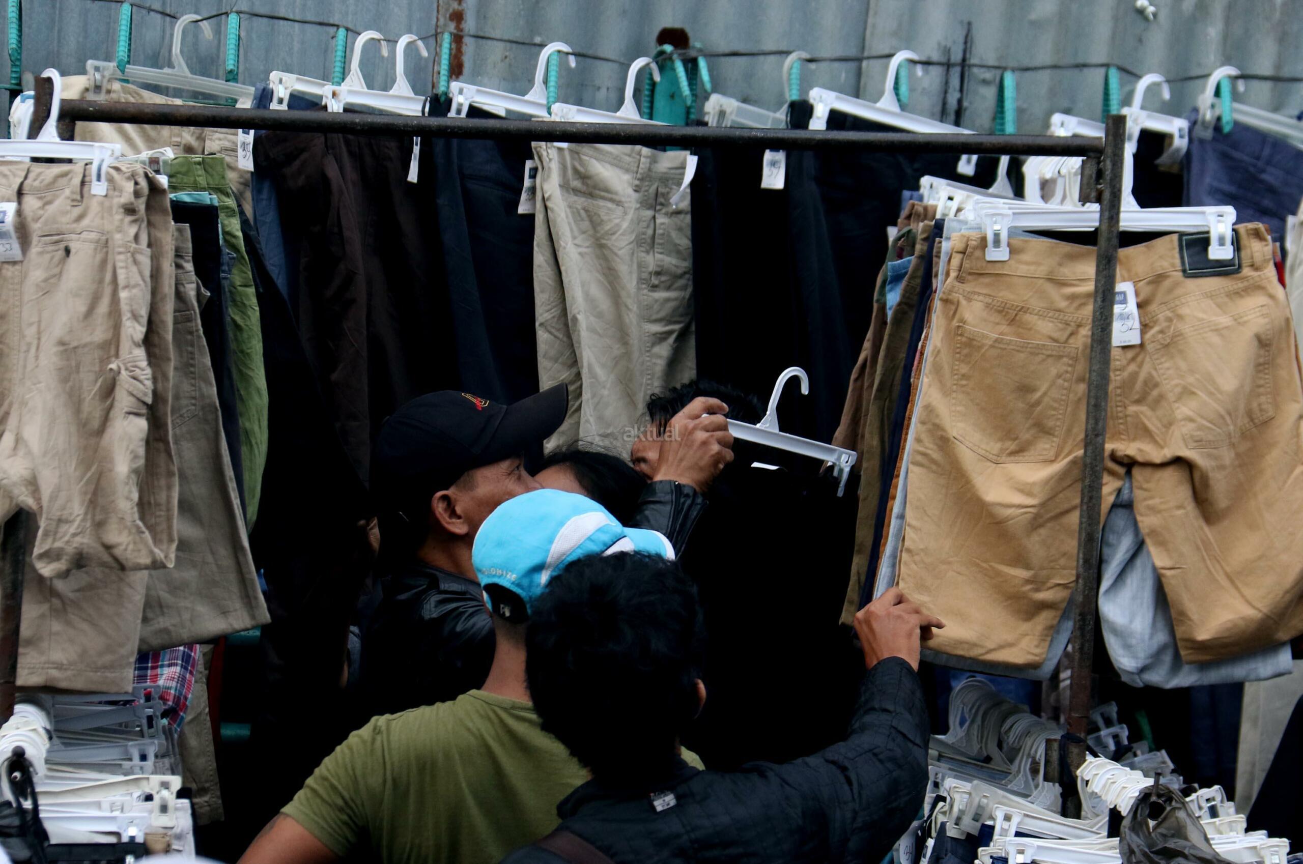 Menjelang lebaran ribuan pakaian bekas membanjiri di kawasan pasar Senen, harga baju yang dijual bervariasi mulai Rp 35000- RP 5000. AKTUAL/Munzir