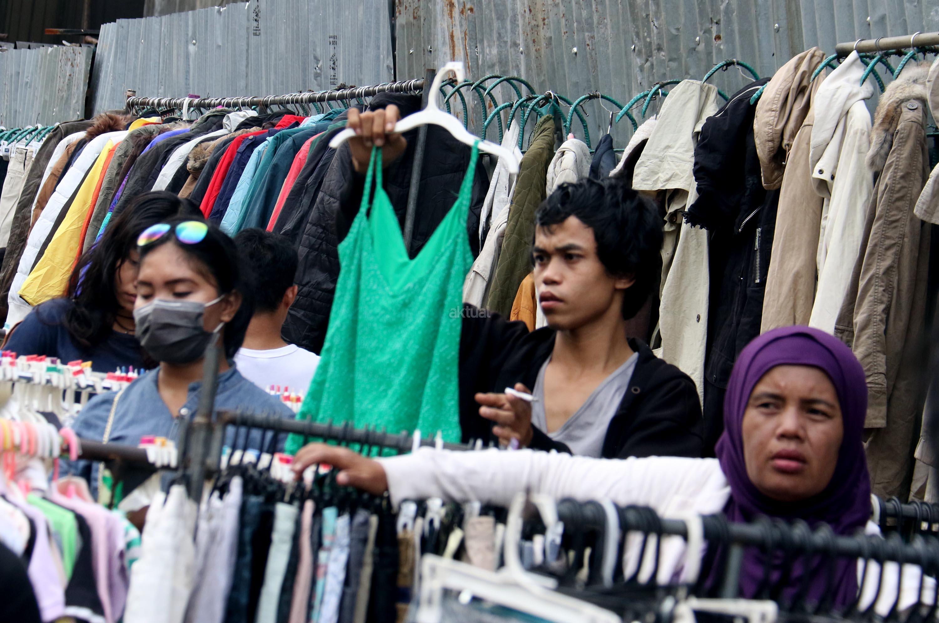 Sejumlah calon pembeli memilih pakaian bekas yang dijual di kawasan Pasar Senen, Jakarta, Sabtu (24/6/2017). Menjelang lebaran ribuan pakaian bekas membanjiri di kawasan pasar Senen, harga baju yang dijual bervariasi mulai Rp 35000- RP 5000. AKTUAL/Munzir