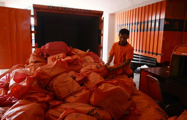 Menjelang lebaran pengiriman barang di Kantor Pos Besar Jakarta mengalami peningkatan, Jakarta Kamis(30/6/2016). Pengiriman paket pos menjelang Lebaran di kantor pos tersebut meningkat 20 persen atau mencapai 4000 paket setiap hari.