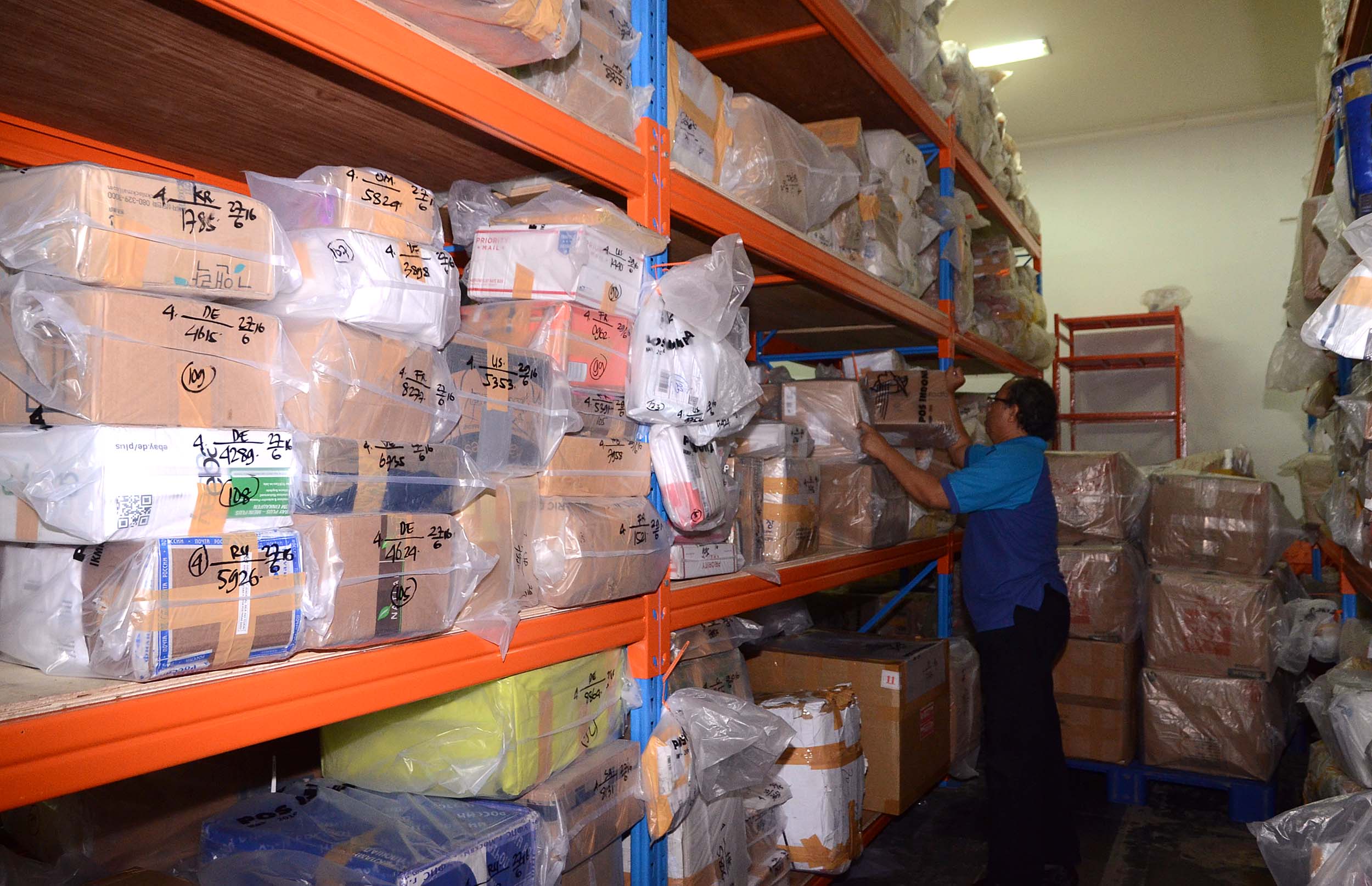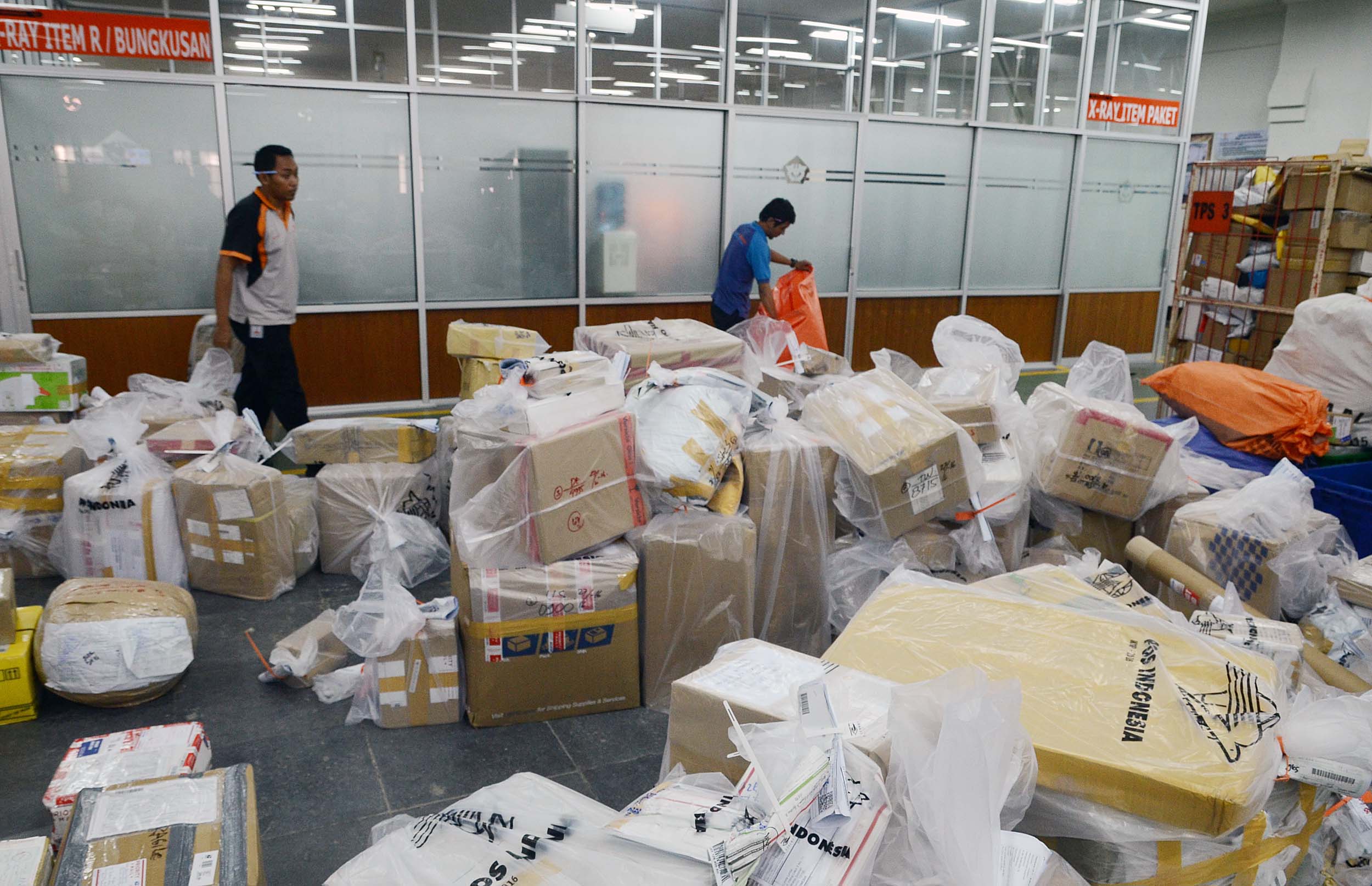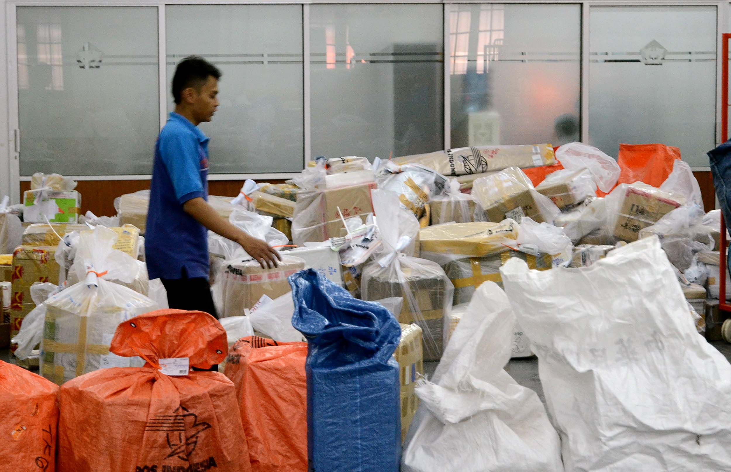 Tumpukan barang di Kantor Pos Besar, Jakarta, Kamis (30/6/2015). Pengiriman paket pos menjelang Lebaran di kantor pos tersebut meningkat 20 persen atau mencapai 4000 paket setiap hari.