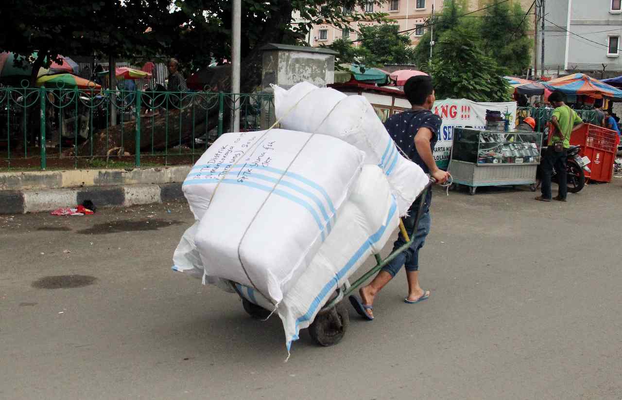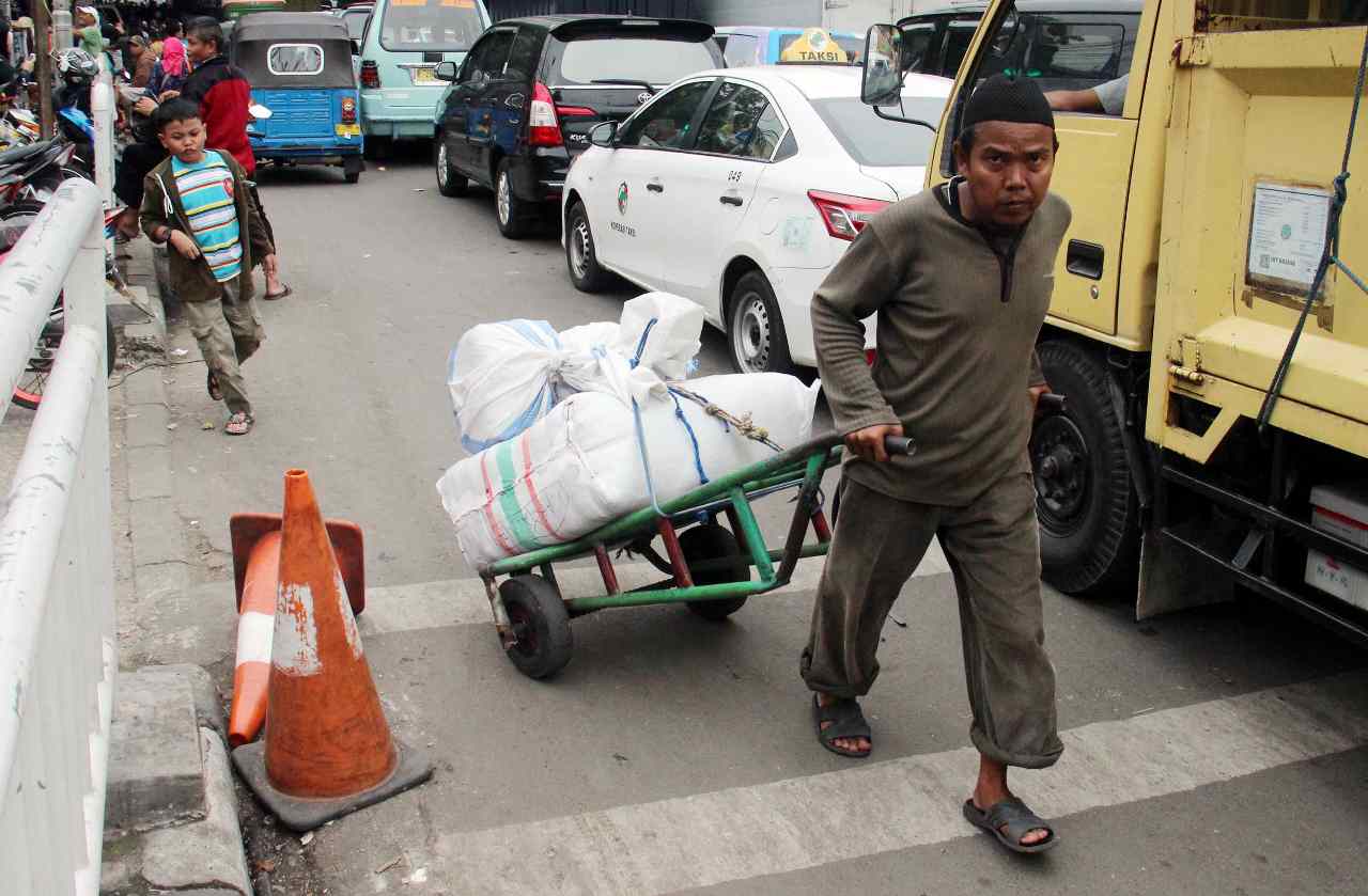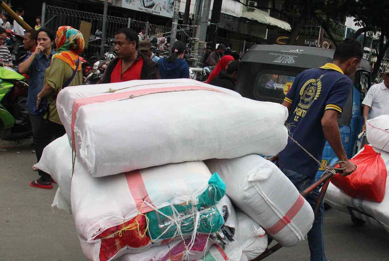 Seorang porter barang melintas di kawasan Tanah Abang, Jakarta Pusat, Senin (4/07/2016). Menjelang lebaran Idul Fitri para pekerja angkut barang alias porter juga mendapatkan berkah, para porter di Pasar Tanah Abang mampu mengantongi pundi-pundi rupiah hingga Rp 200.000 per harinya.