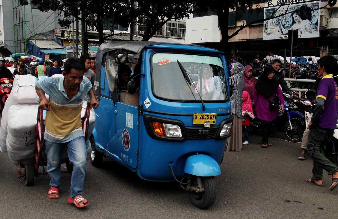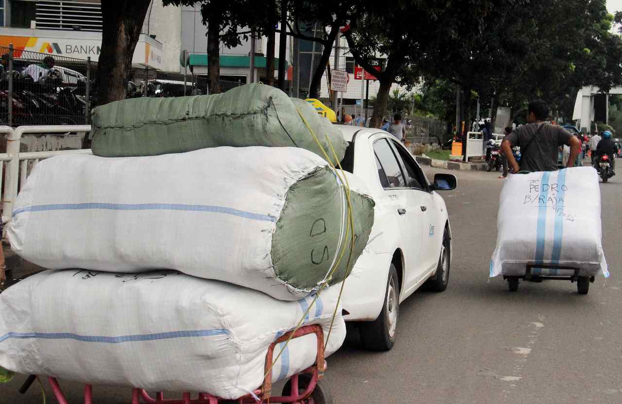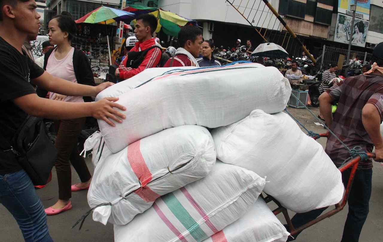 Seorang porter barang melintas di kawasan Tanah Abang, Jakarta Pusat, Senin (4/07/2016). Menjelang lebaran Idul Fitri para pekerja angkut barang alias porter juga mendapatkan berkah, para porter di Pasar Tanah Abang mampu mengantongi pundi-pundi rupiah hingga Rp 200.000 per harinya.