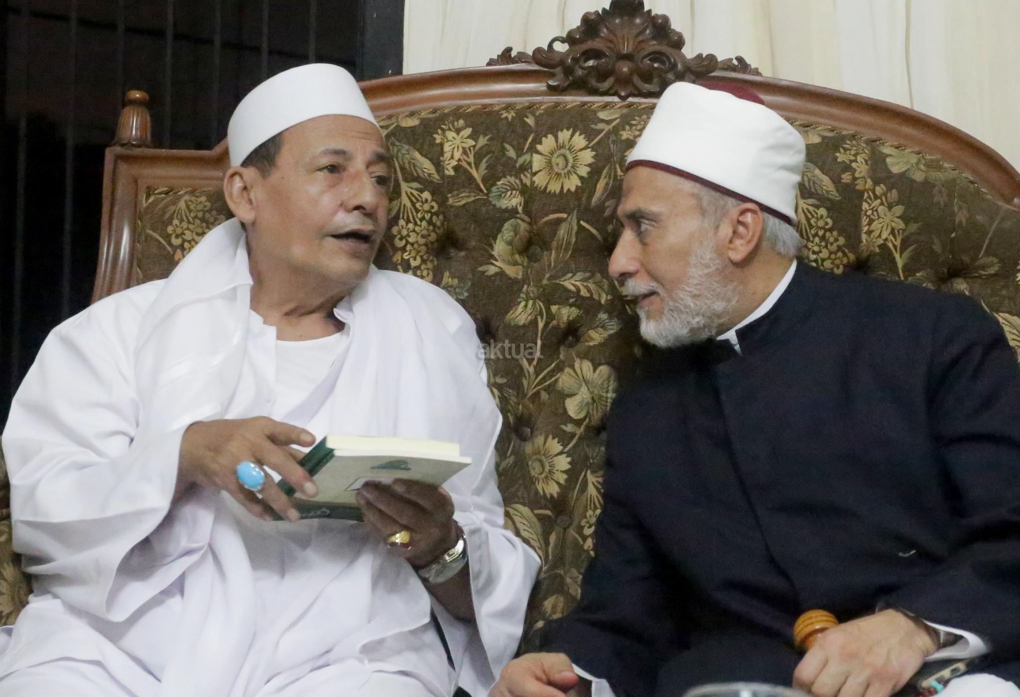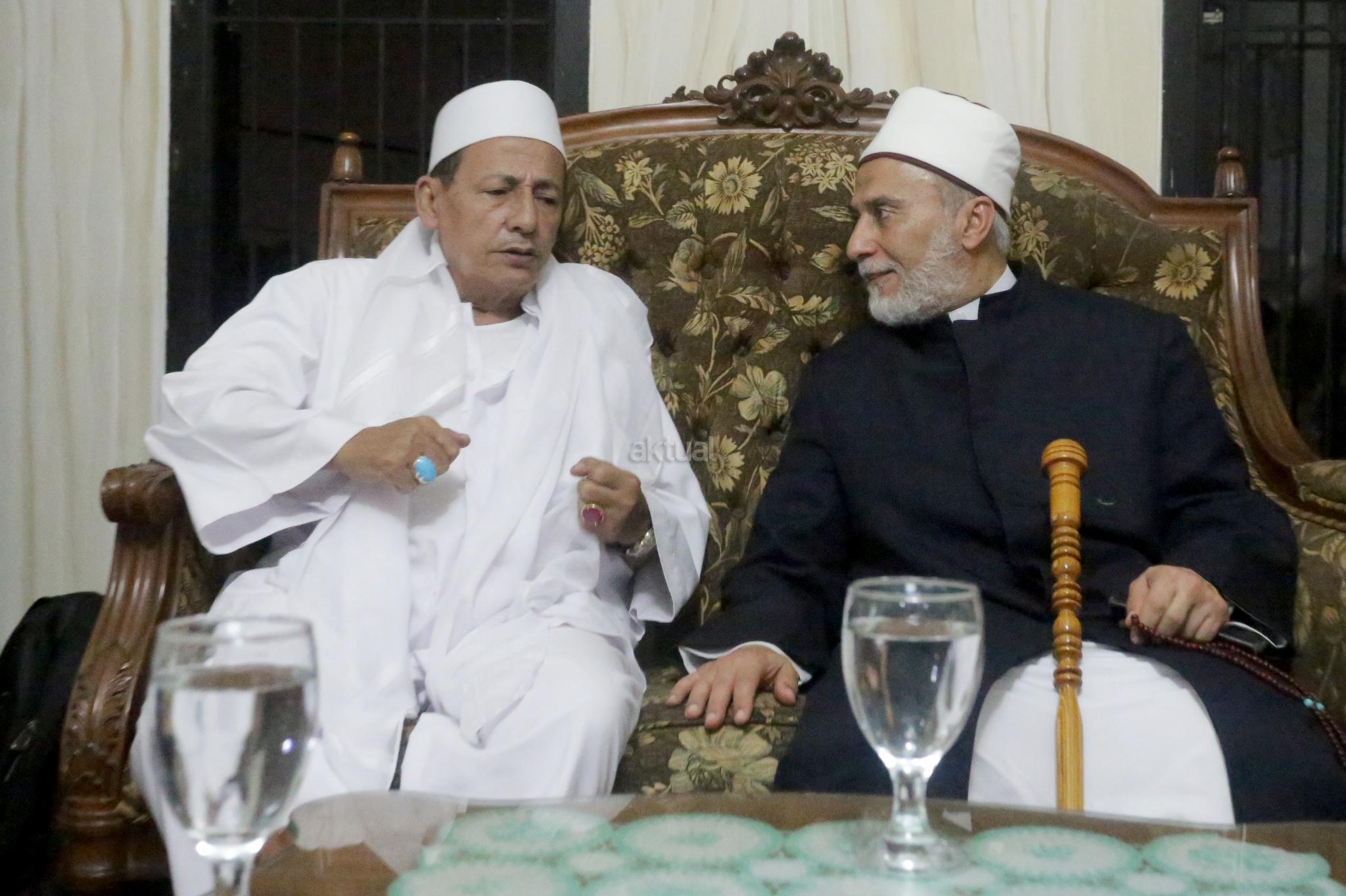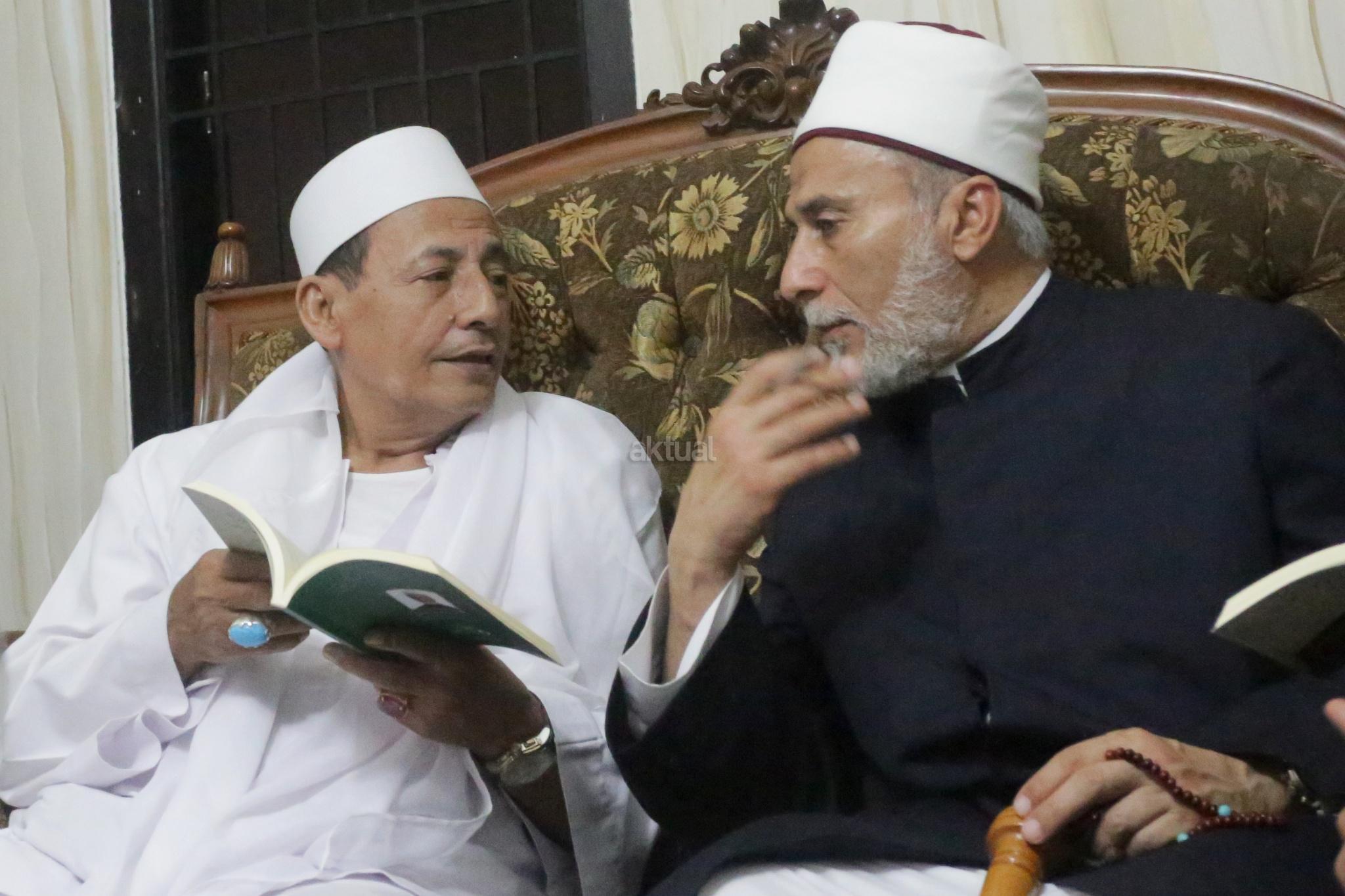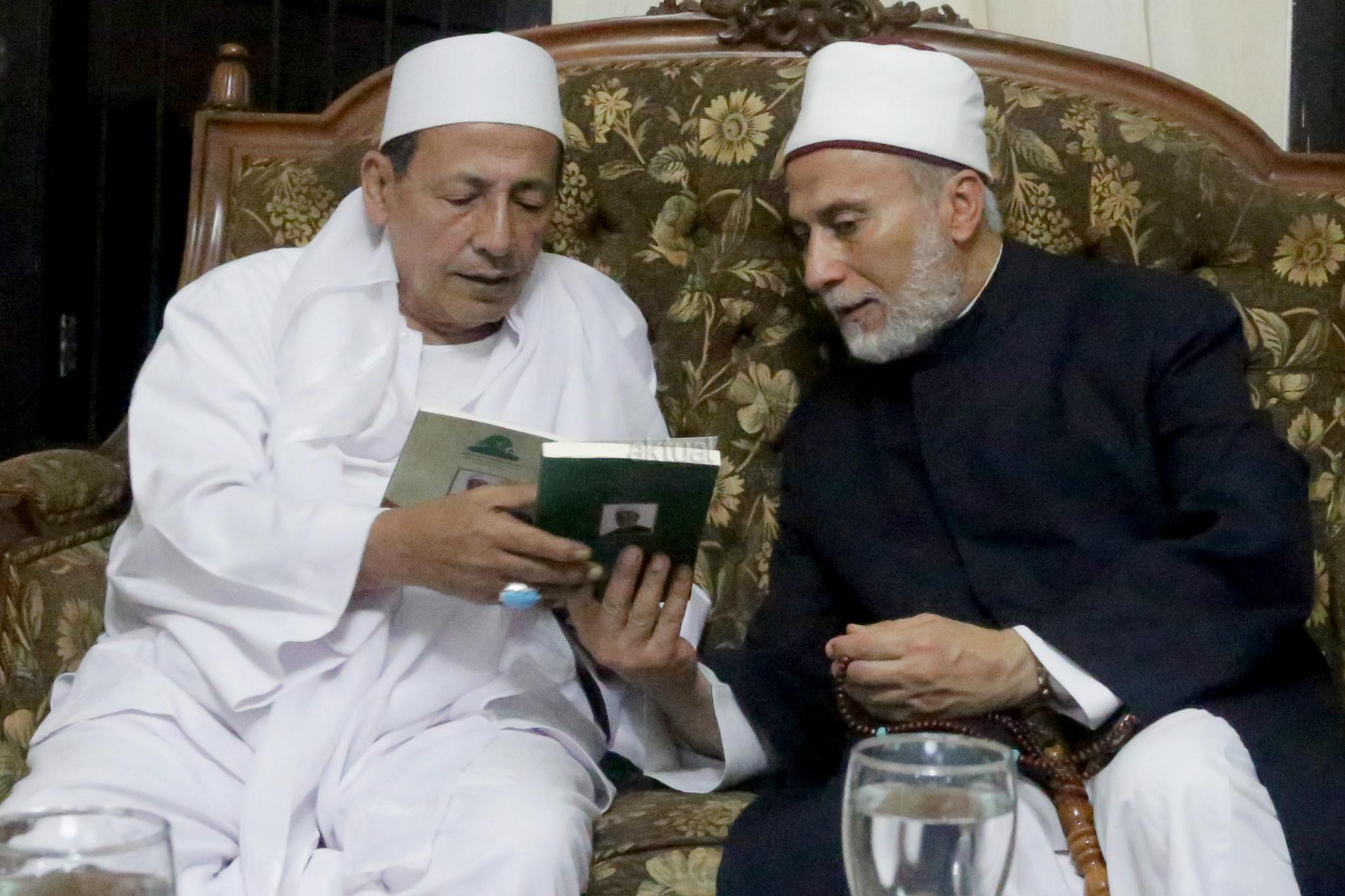 Maulana Syekh Dr. Yusri Rusydi Sayyid Jabr al-Hasani berbincang dengan Putra Ketua Jam’iyyah Ahlith Thariqah Al-Mu’ tabarah An-Nahdliyyah (JATMAN) Maulana Al-Habib Muhammad Luthfi bin Ali bin Yahya saat bertemu sebelum Muktamar JATMAN XII di Pekalongan, Jawa Tengah, Minggu (14/1/2018) malam. Muktamar JATMAN ke XII di Pekalongan akan kedatangan puluhan ribu ulama dari nusantara dan dunia, juga akan kehadiran Presiden RI dan sejumlah Menteri kabinet kerja. Kabar kepastian hadirnya orang nomor satu di Republik Indonesia untuk membuka acara muktamar. AKTUAL/Tino Oktaviano
