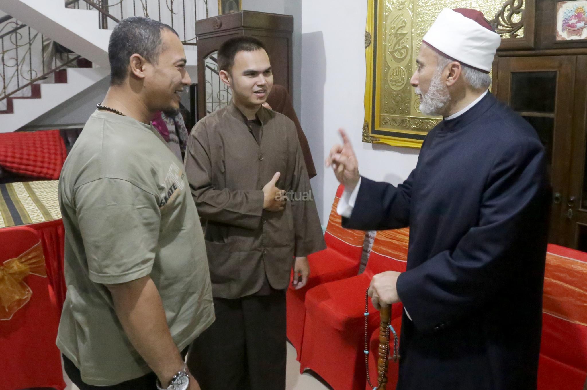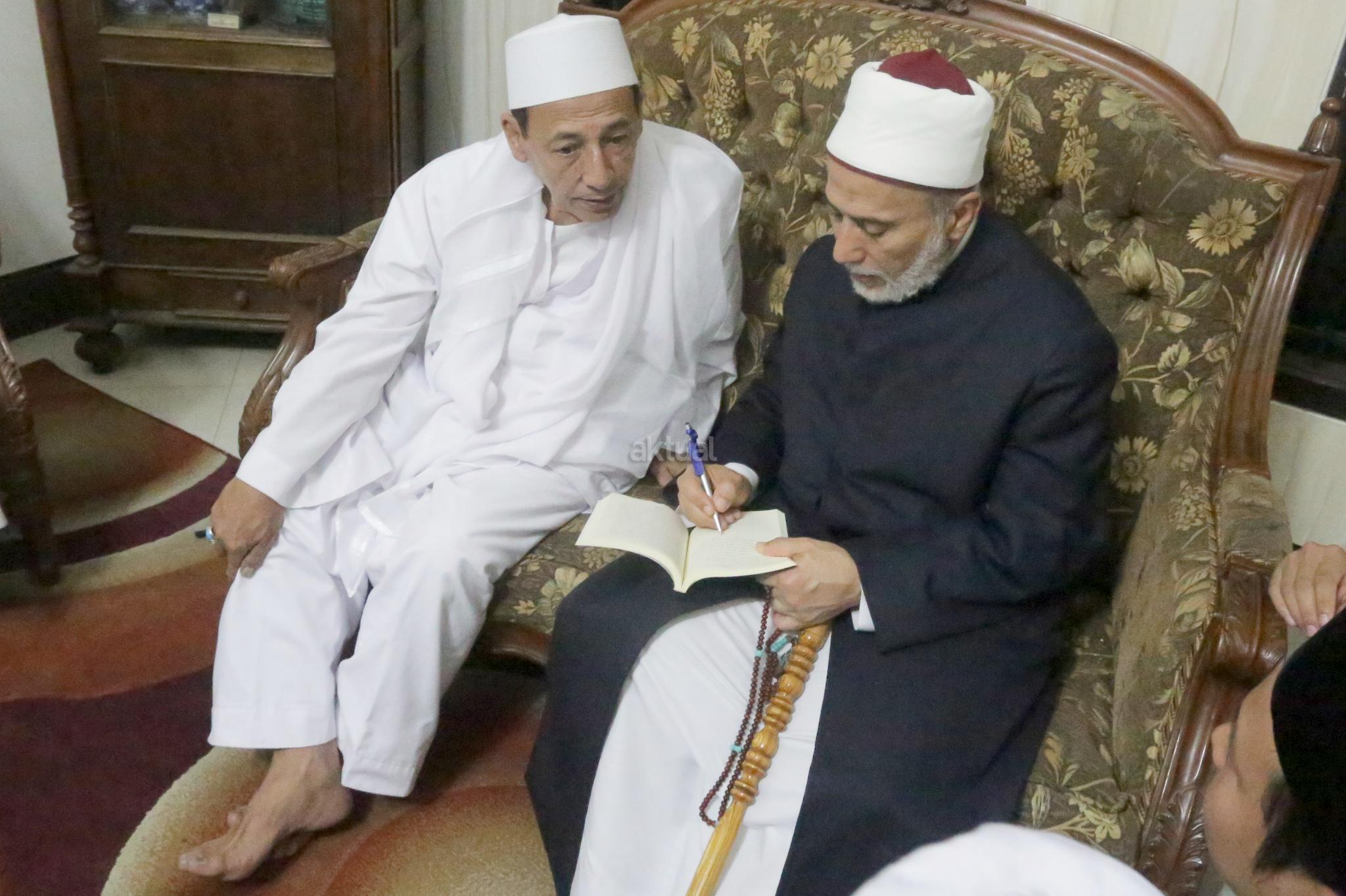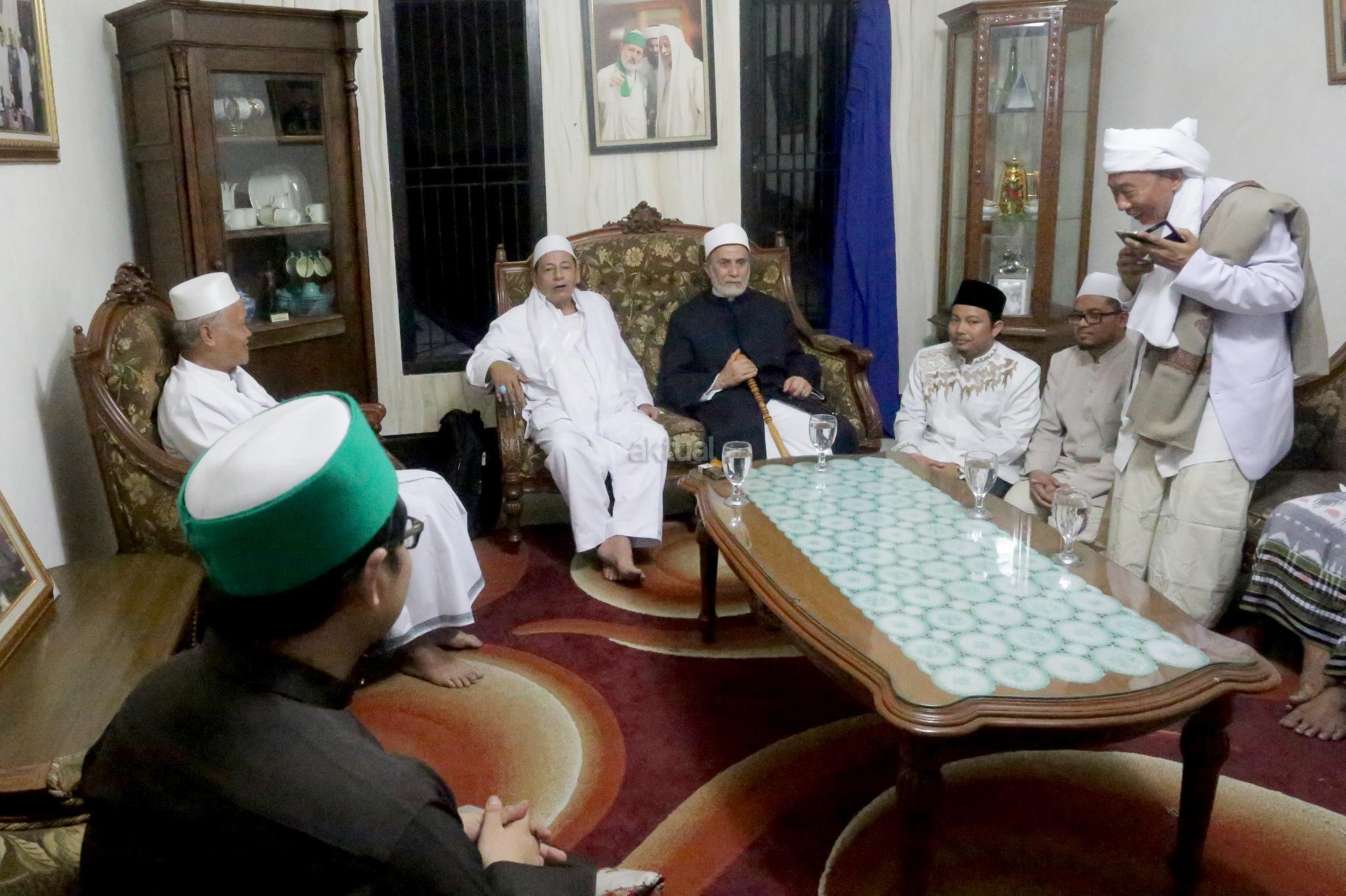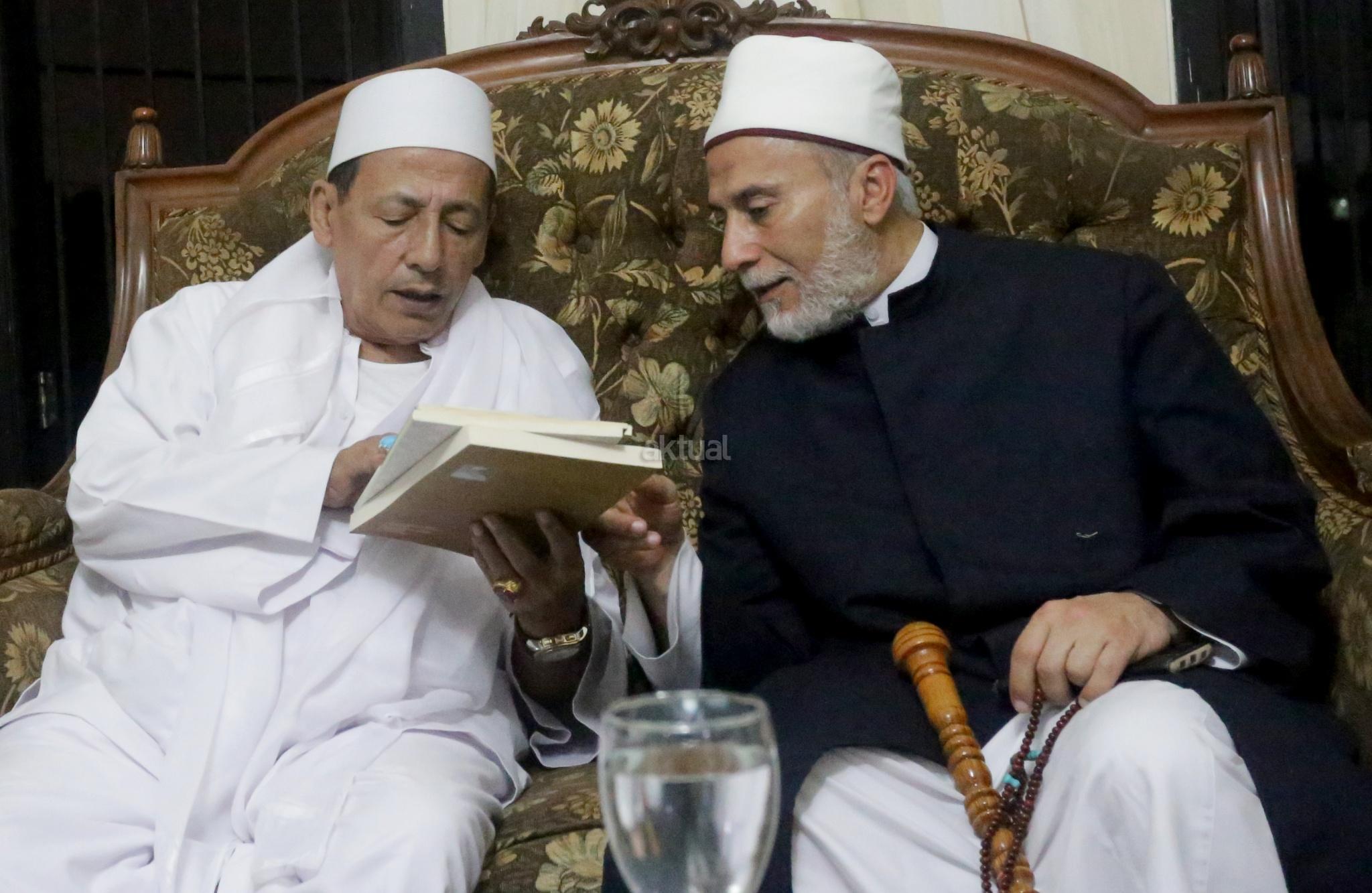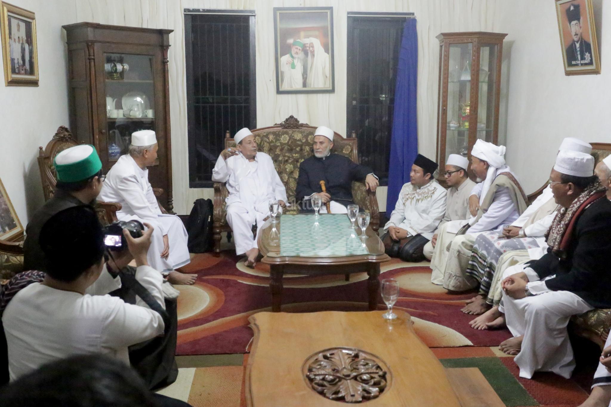 Maulana Syekh Dr. Yusri Rusydi Sayyid Jabr al-Hasani berbincang dengan Putra Ketua Jam’iyyah Ahlith Thariqah Al-Mu’ tabarah An-Nahdliyyah (JATMAN) Maulana Al-Habib Muhammad Luthfi bin Ali bin Yahya saat bertemu sebelum Muktamar JATMAN XII di Pekalongan, Jawa Tengah, Minggu (14/1/2018) malam. Muktamar JATMAN ke XII di Pekalongan akan kedatangan puluhan ribu ulama dari nusantara dan dunia, juga akan kehadiran Presiden RI dan sejumlah Menteri kabinet kerja. Kabar kepastian hadirnya orang nomor satu di Republik Indonesia untuk membuka acara muktamar. AKTUAL/Tino Oktaviano