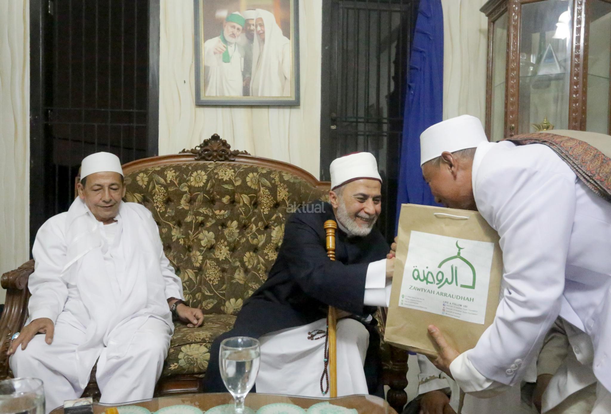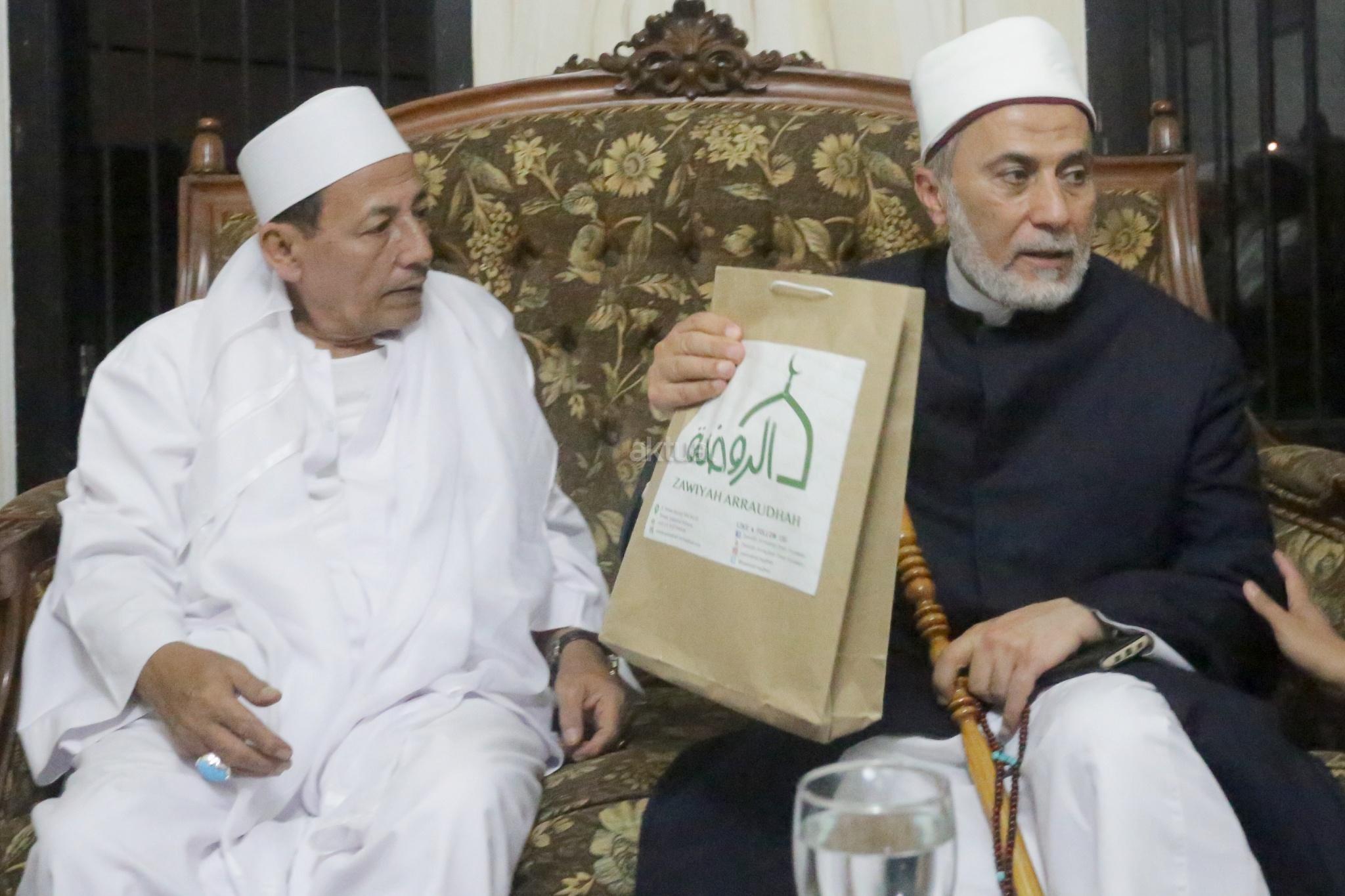 Maulana Syekh Dr. Yusri Rusydi Sayyid Jabr al-Hasani didampingi Khodimu Zawiyah Arraudhah Muhammad Danial Nafis (kiri) memberikan cinderamata berupa kitab Awrad Thoriqah Yusriah Shiddiqiah Syadziliah dan beberapa kitab terbitan Zawiyah Arraudhah kepada Ketua Jam’iyyah Ahlith Thariqah Al-Mu’ tabarah An-Nahdliyyah (JATMAN) Maulana Al-Habib Muhammad Luthfi bin Ali bin Yahya saat bertemu sebelum Muktamar JATMAN XII di Pekalongan, Jawa Tengah, Minggu (14/1/2018) malam. Muktamar JATMAN ke XII di Pekalongan akan kedatangan puluhan ribu ulama dari nusantara dan dunia, juga akan kehadiran Presiden RI dan sejumlah Menteri kabinet kerja. Kabar kepastian hadirnya orang nomor satu di Republik Indonesia untuk membuka acara muktamar. AKTUAL/Tino Oktaviano