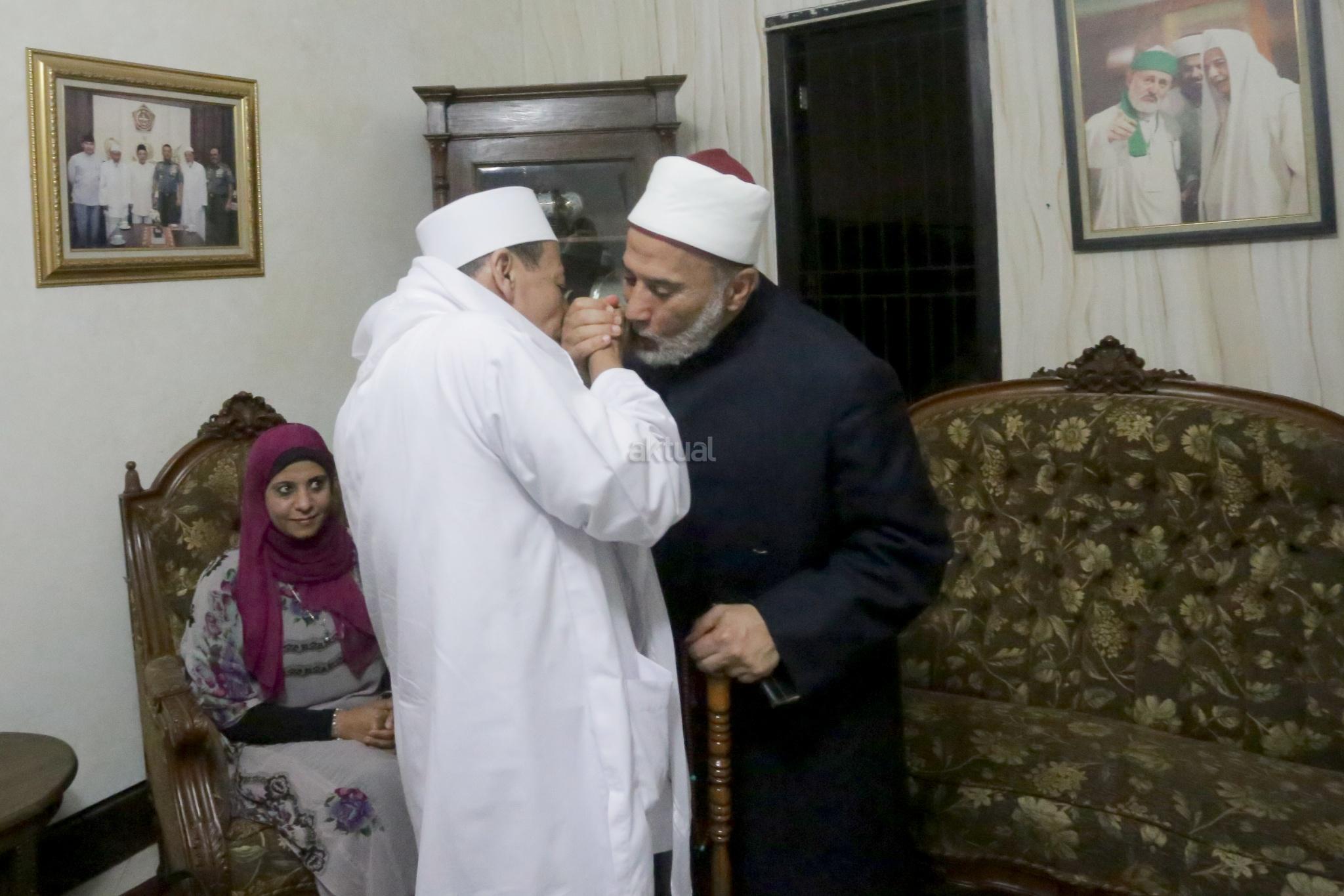 Ketua Jam’iyyah Ahlith Thariqah Al-Mu’ tabarah An-Nahdliyyah (JATMAN) Maulana Al-Habib Muhammad Luthfi bin Ali bin Yahya menyapa Maulana Syekh Dr. Yusri Rusydi Sayyid Jabr al-Hasani saat bertemu sebelum Muktamar JATMAN XII di Pekalongan, Jawa Tengah, Minggu (14/1/2018) malam. Muktamar JATMAN ke XII di Pekalongan akan kedatangan puluhan ribu ulama dari nusantara dan dunia, juga akan kehadiran Presiden RI dan sejumlah Menteri kabinet kerja. Kabar kepastian hadirnya orang nomor satu di Republik Indonesia untuk membuka acara muktamar. AKTUAL/Tino Oktaviano