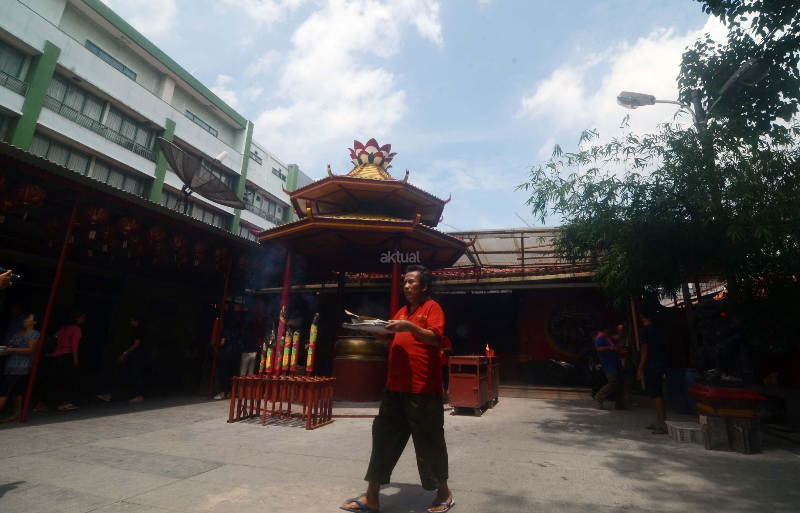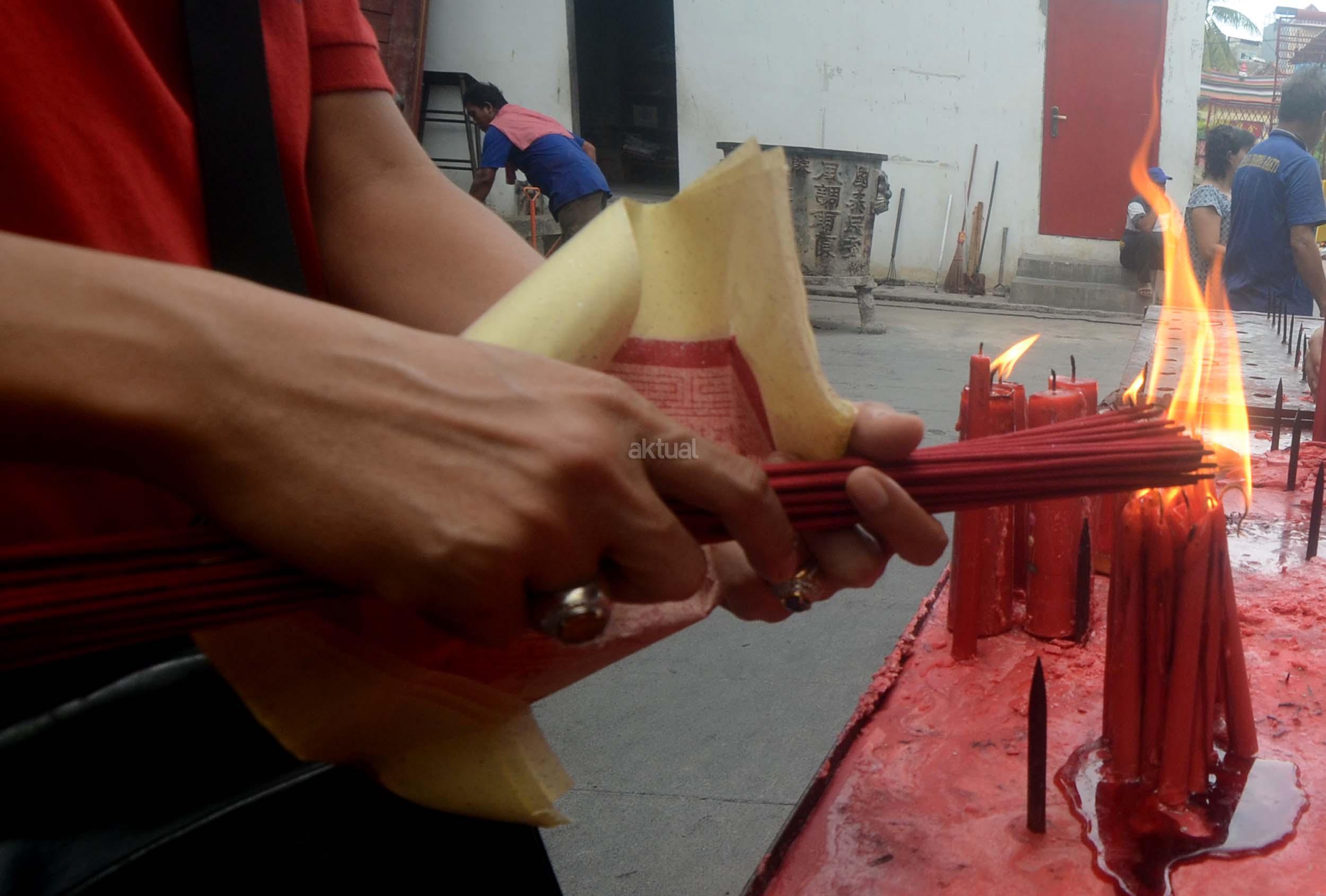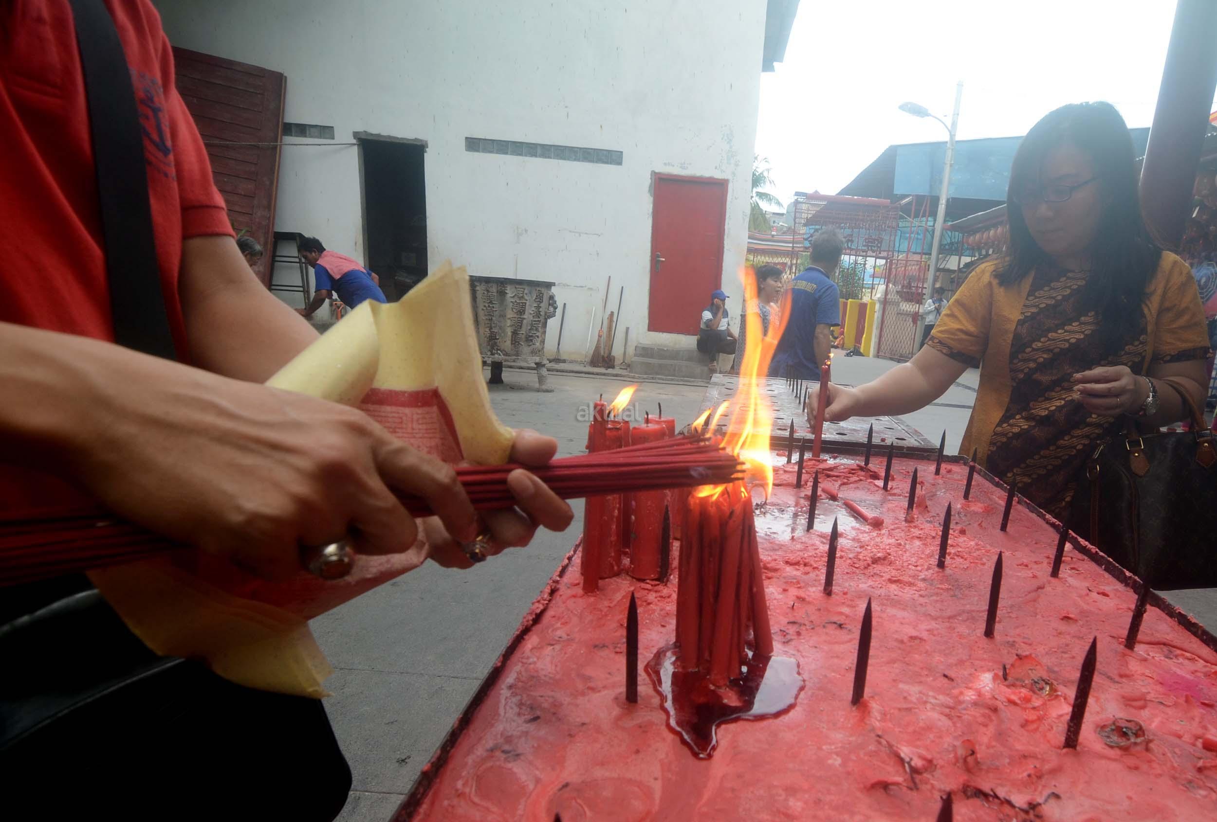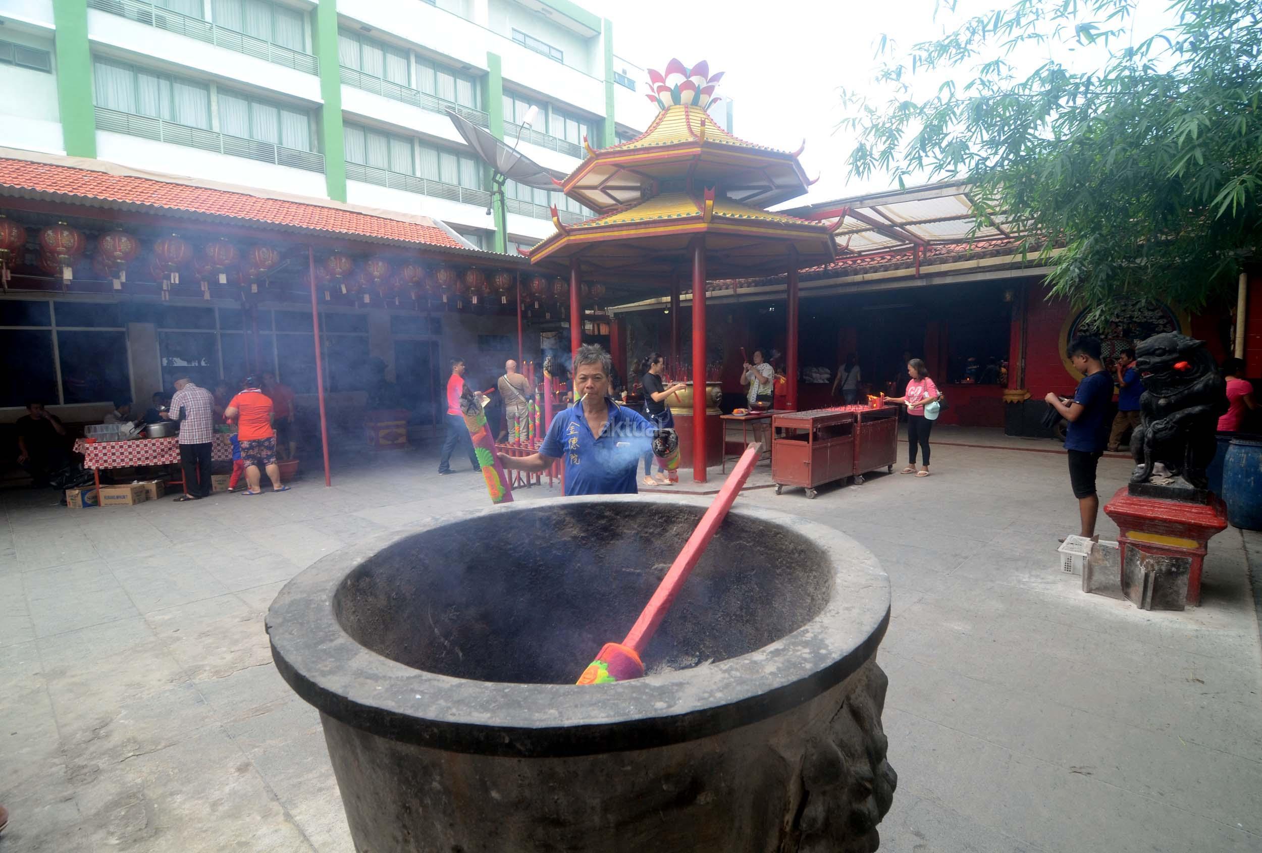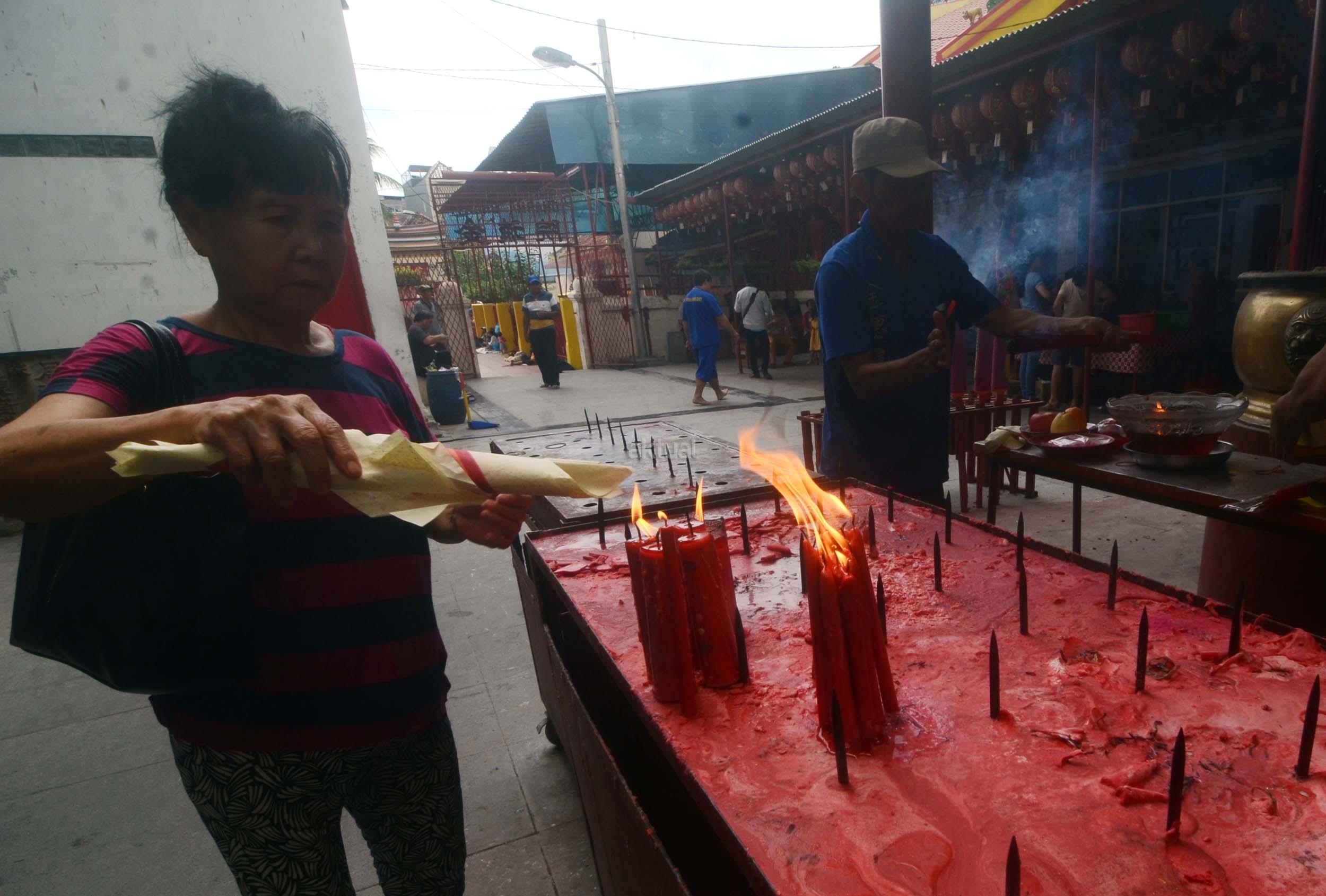 Umat Budha mulai berdoa menjelang perayaan Imlek di Vihara Dharma Sakti, Petak Sembilan, Jakarta Barat, Jumat (13/1/2017). Menjelang perayaan Imlek, sejumlah klenteng yang berada di Jakarta mulai ramai, dan dipadati umat yang beribadah.