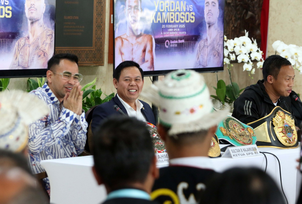 Anggota DPD RI Daud Yordan saat jumpa pers Gelar Juara Dunia Tinju Kelas Ringan Super IBA di Kompleks Parlemen, Senayan, Jakarta, Kamis, (20/2/2025).