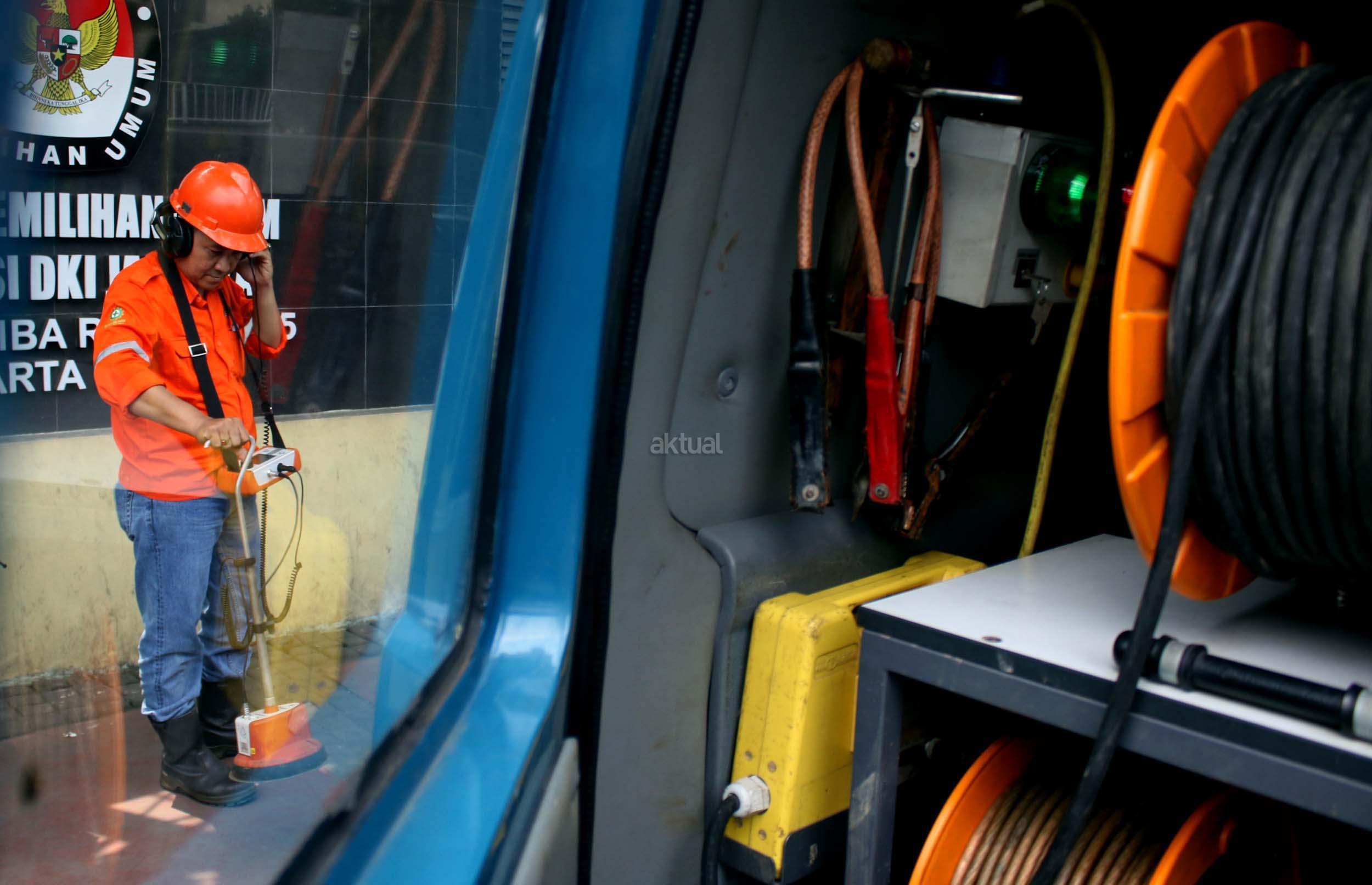 Petugas PLN melakukan pengecekan kabel Tegangan Menengah (TM) bawah tanah menggunakan mobil deteksi di depan kantor KPUD DKI Jakarta, Senin (17/4/2017). Jelang Pilkada Provinsi DKI Jakarta putaran dua PT PLN (Persero) Distirbusi Jakarta Raya melakukan pengamanan keandalan pasokan listrik ke beberapa titik krusial dalam peserta demokrasi yang akan dilaksanakan pada Rabu (19/4/2017). AKTUAL/Munzir