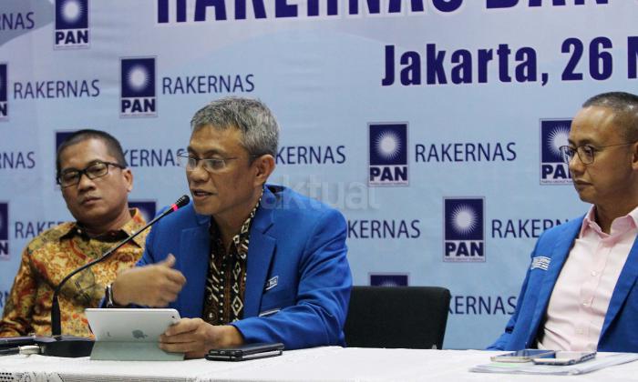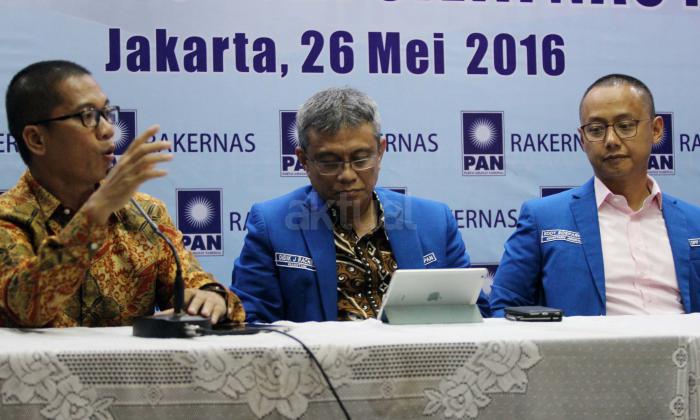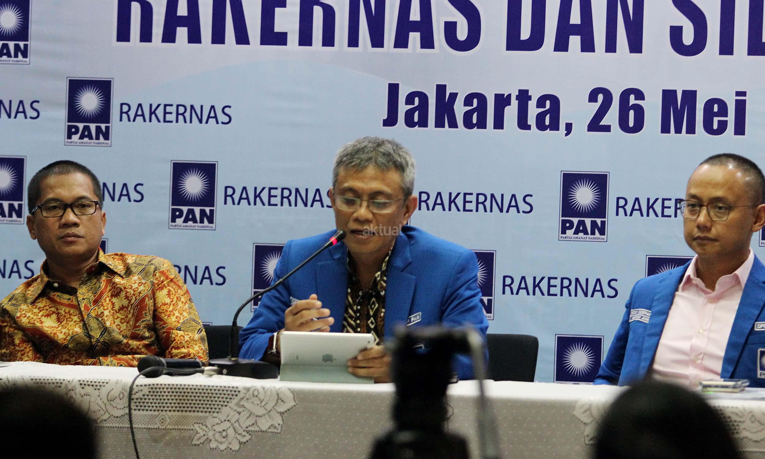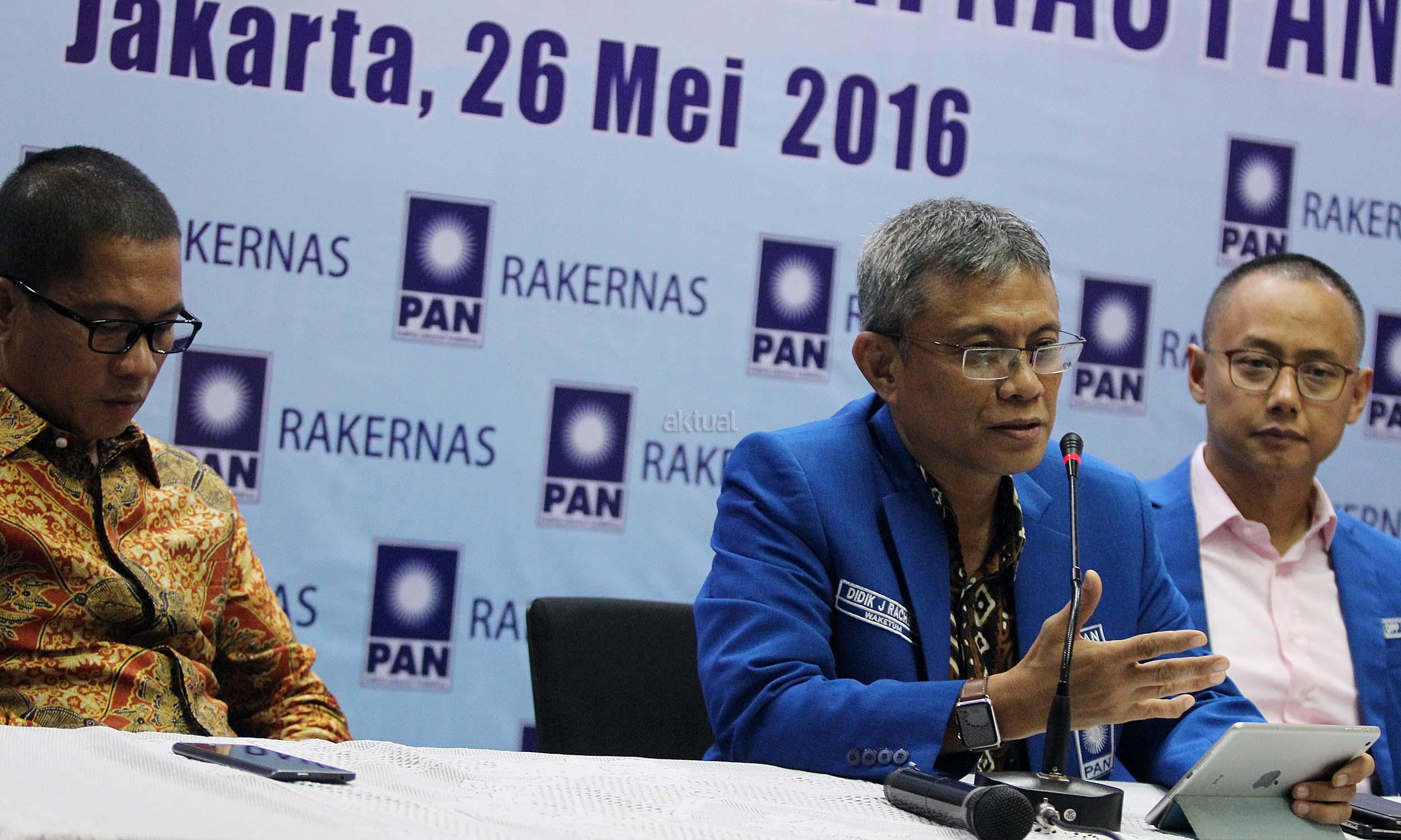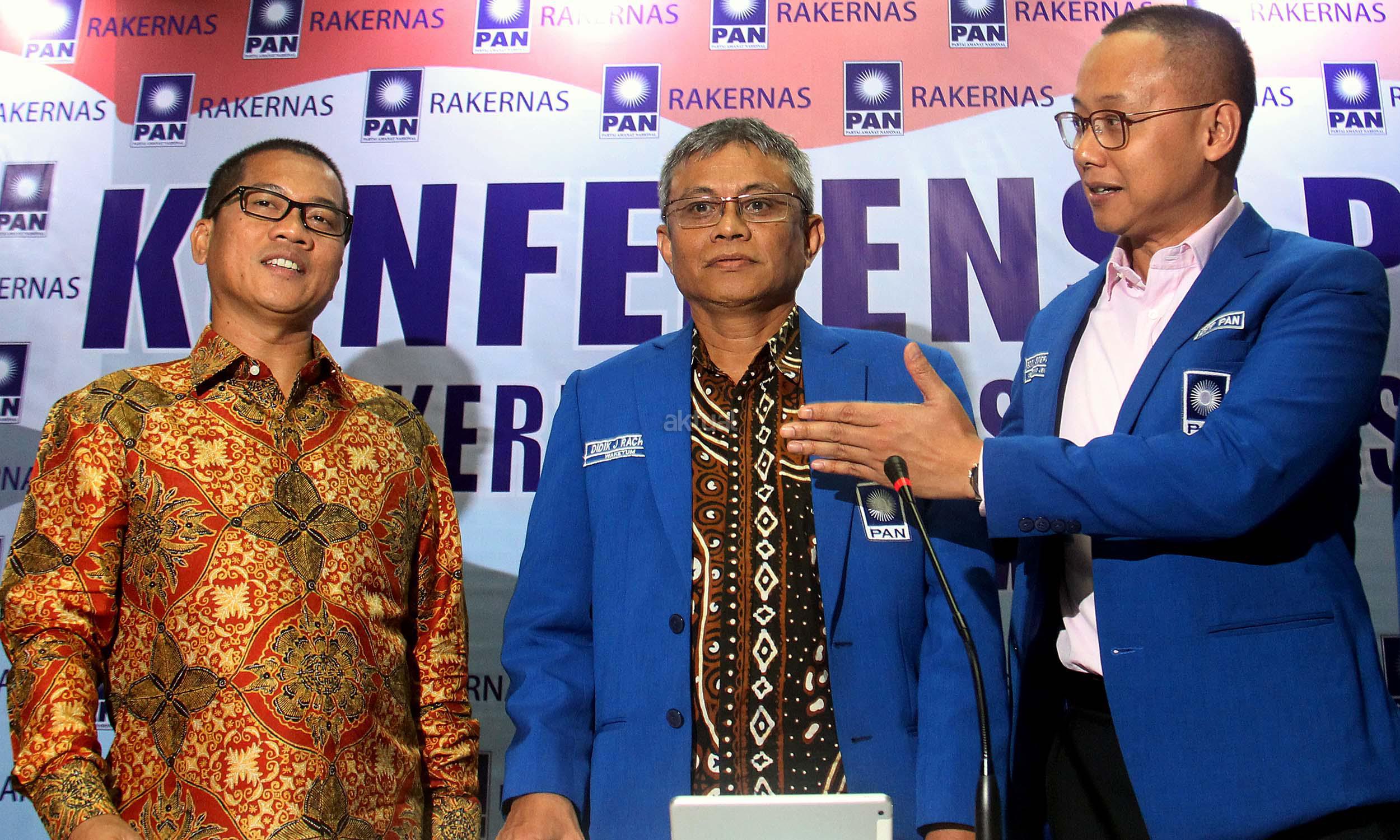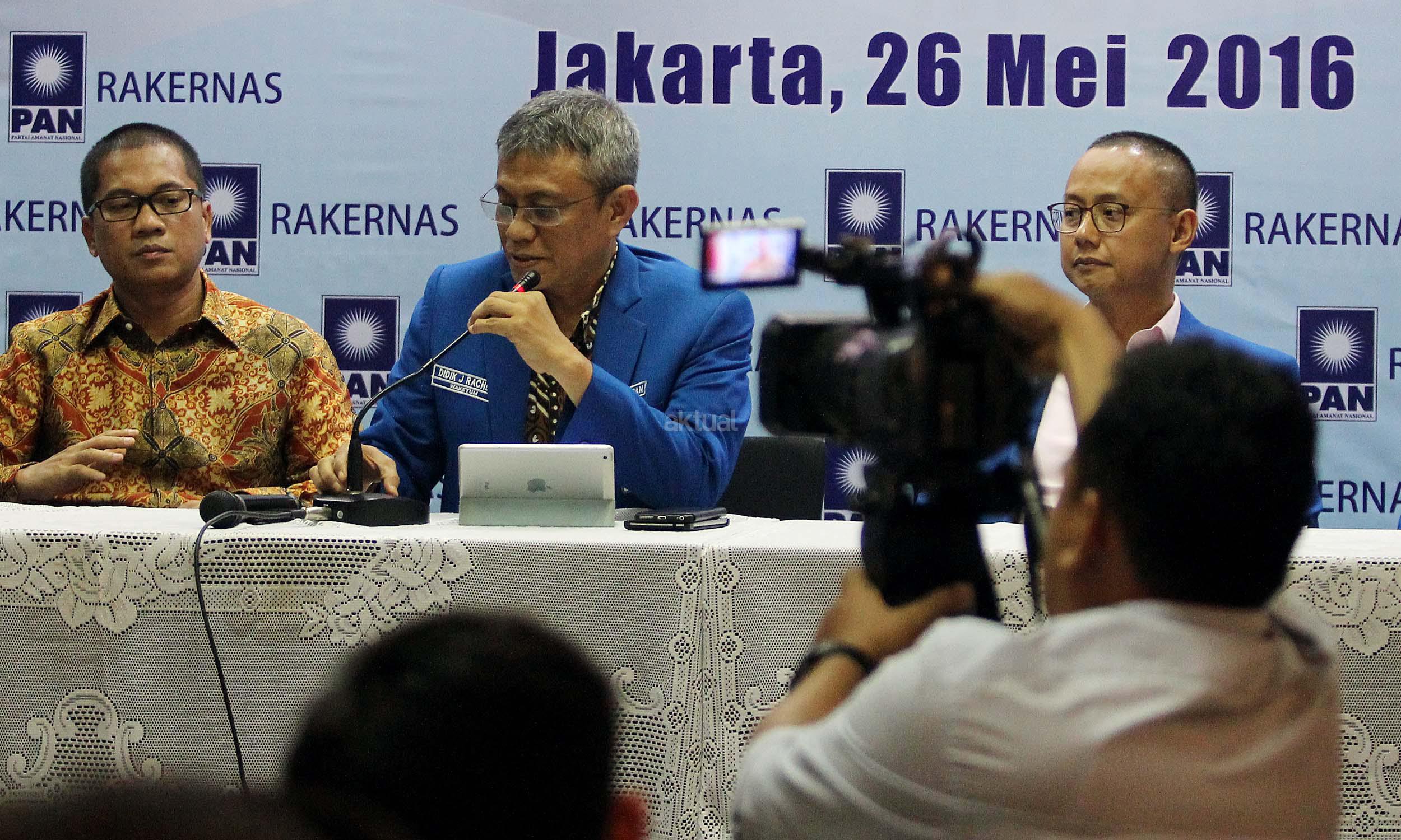 Kiri-kanan ;Ketua Organizing Committe (OC) Rakernas Partai Amanat Nasional (PAN) Yandri Susanto bersama Ketua Steering Committe (SC) Rakernas & Silatnas Partai Amanat Nasional (PAN) Didik J Rachbini dan Sekjen Partai Amanat Nasional (PAN) Eddy Soeparno memberikan keterangan kepada wartawan mengenai Persiapan Pelaksanaan Rakernas dan Temu Legislatif & Eksekutif Nasional PAN di Kantor DPP PAN, Jakarta, Kamis (26/5/2016). Rapat kerja nasional (Rakernas) PAN yang akan berlangsung pada tanggal 27 Mei - 30 Mei 2016 tersebut akan membahas mengenai sejumlah isi diantaranya isu kesejahteraan masyarakat dan kejahatan seksual di masyarakat.