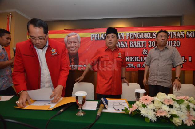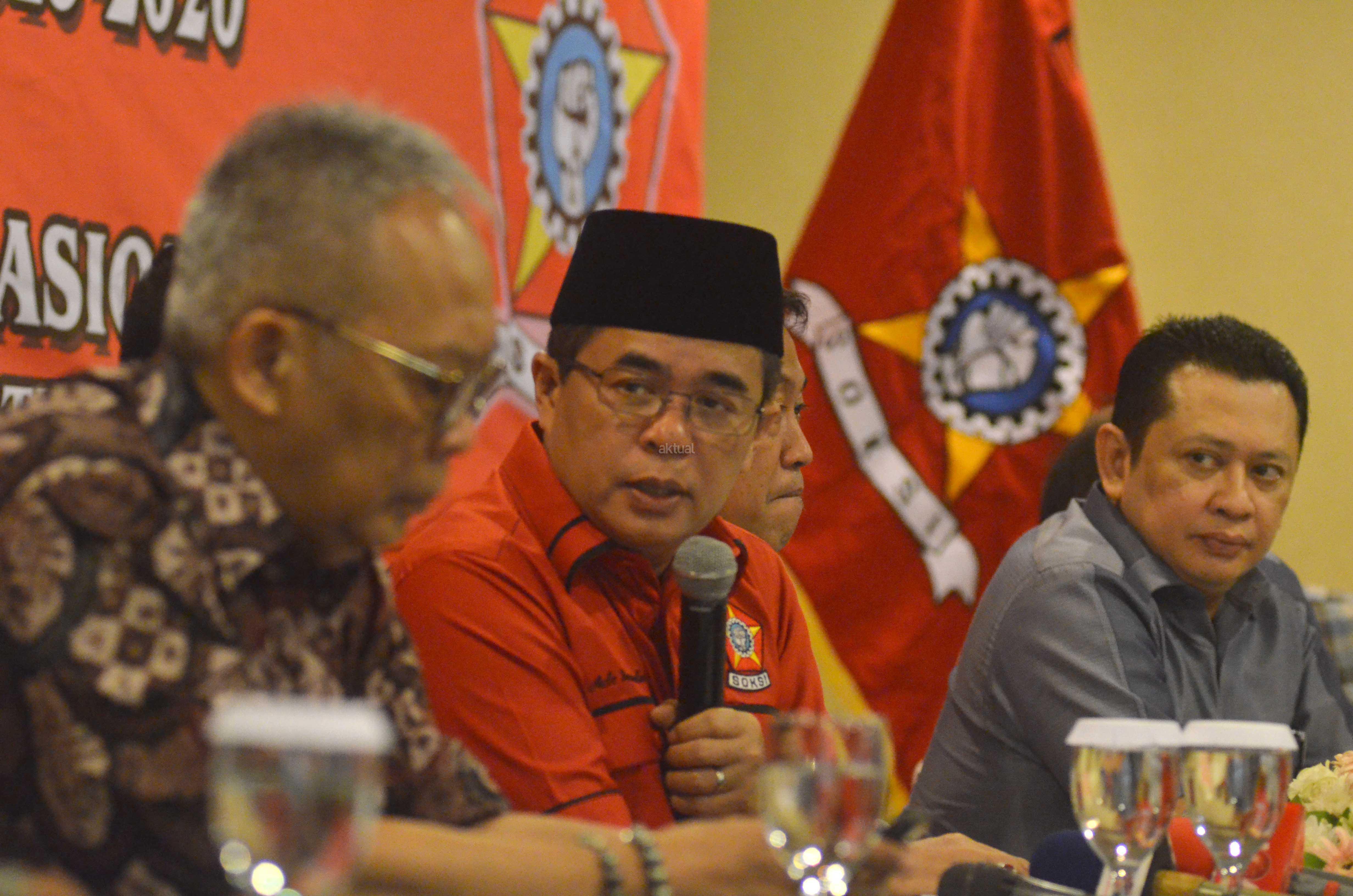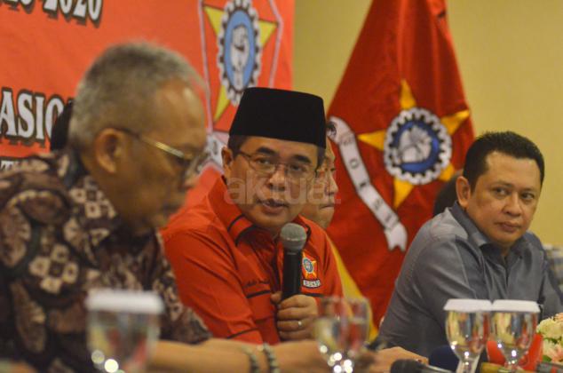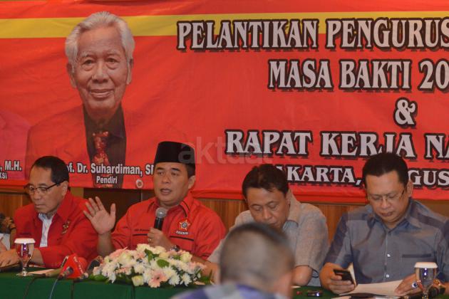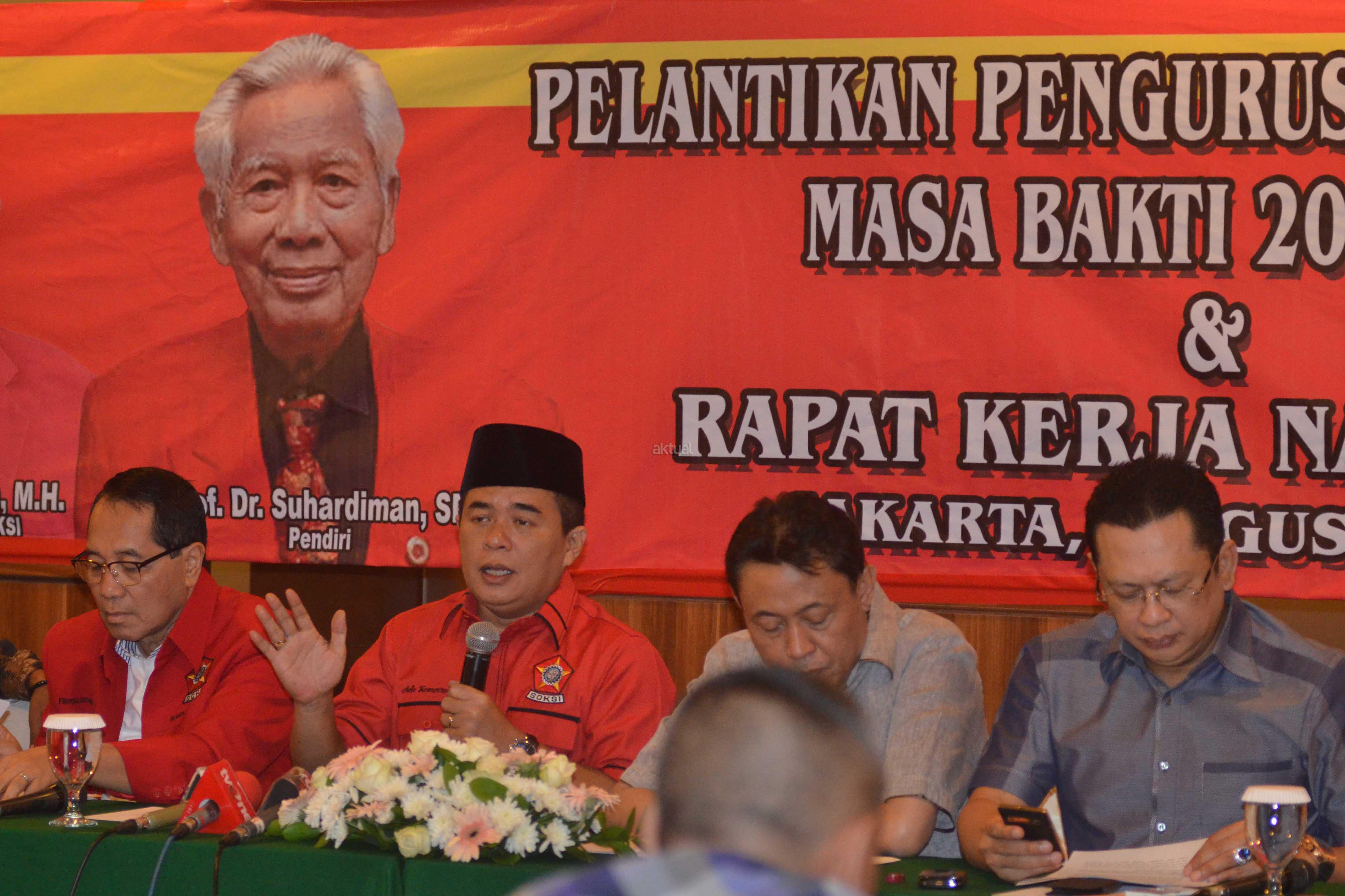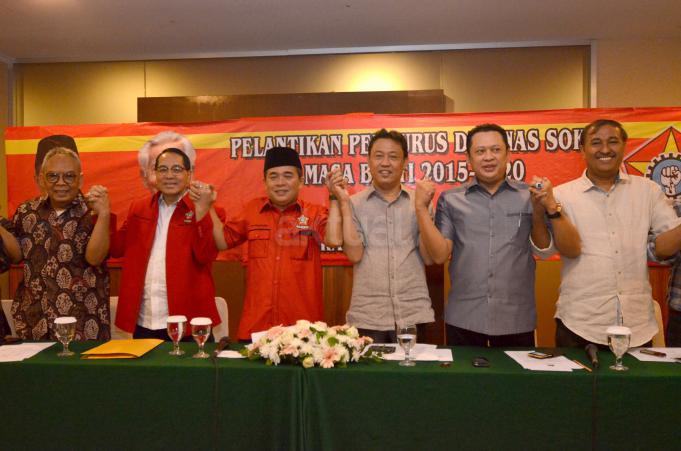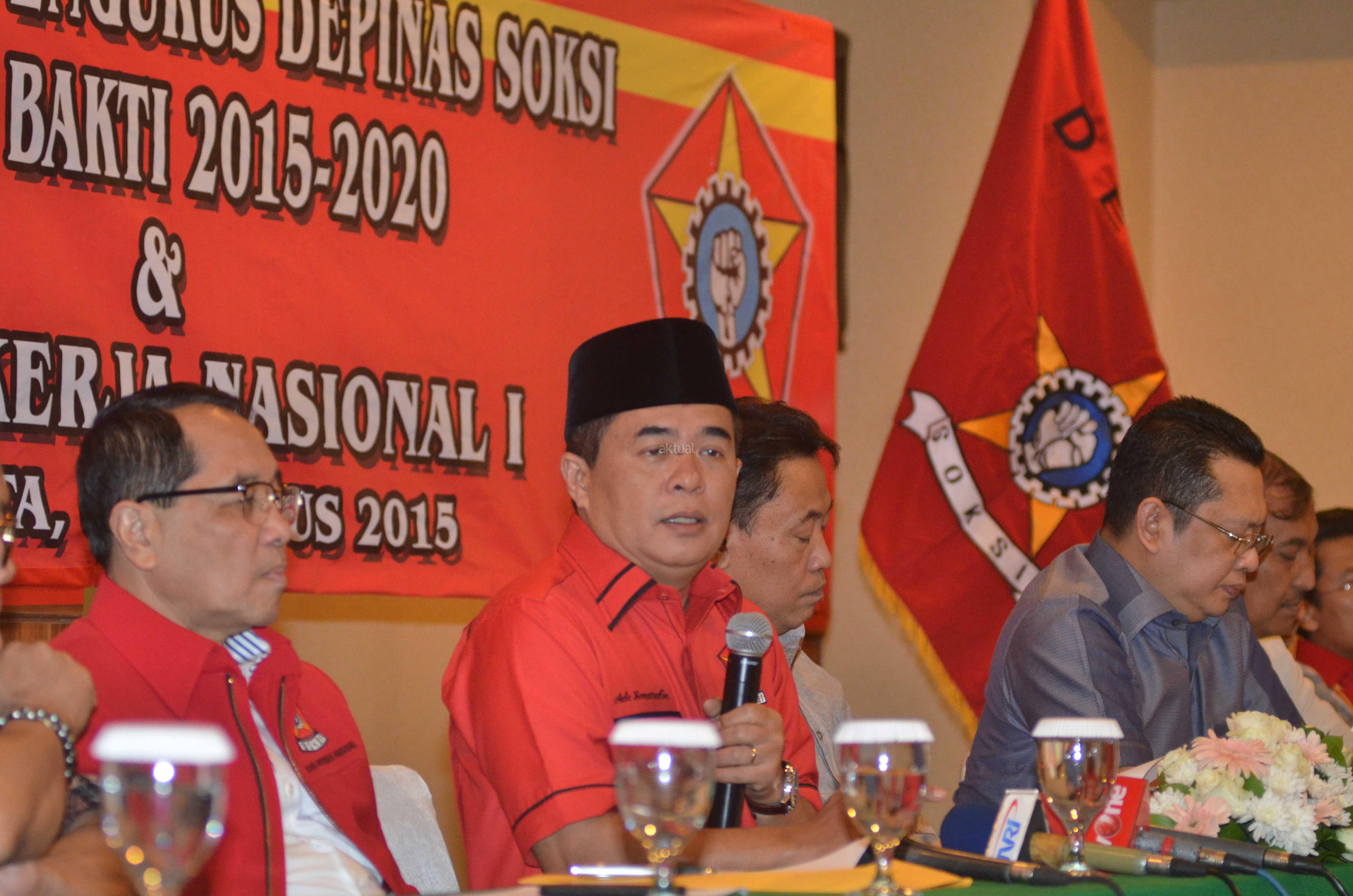 Ketua Umum Sentral Organisasi Karyawan Swadiri Indonesia (Soksi) Ade Komaruddin (tengah), Waketum Soksi Ahmadi Nur Supit (kedua kanan), Waketum Bambang Soesatyo (kanan), Sekjen Firman Subagyo (kedua kiri) dan Ketua Harian Dewan Pembina Bobby Suhardiman (kiri) mengangkat tangan bersama jelang pelantikan Dewan Pimpinan Nasional Soksi dan pembukaan Rakernas I tahun 2015 di Jakarta, Jumat (7/8). Pelantikan dan Rakernas Soksi akan dilaksanakan pada Sabtu (8/8) yang rencananya akan dihadiri Presiden Joko Widodo.