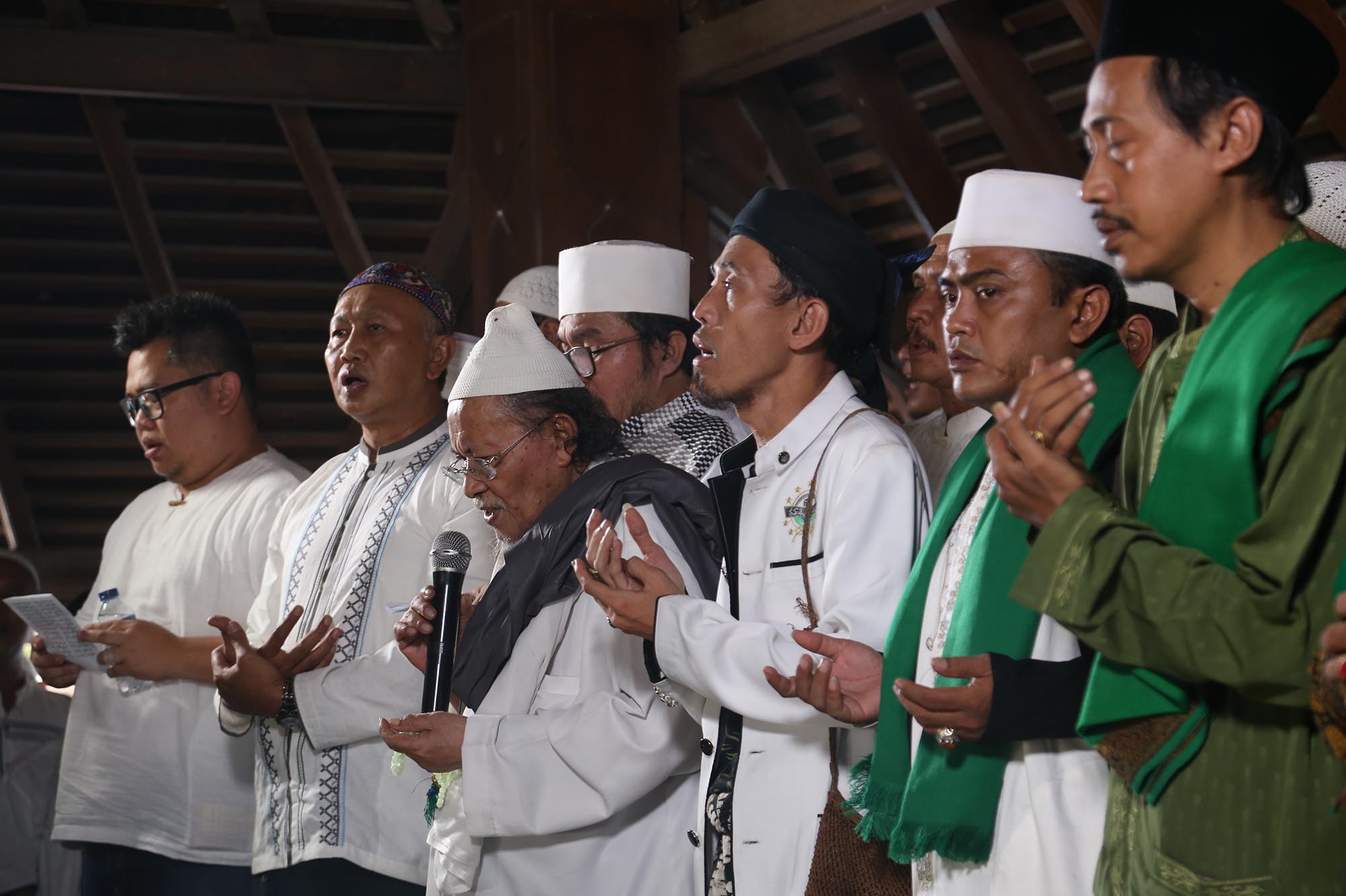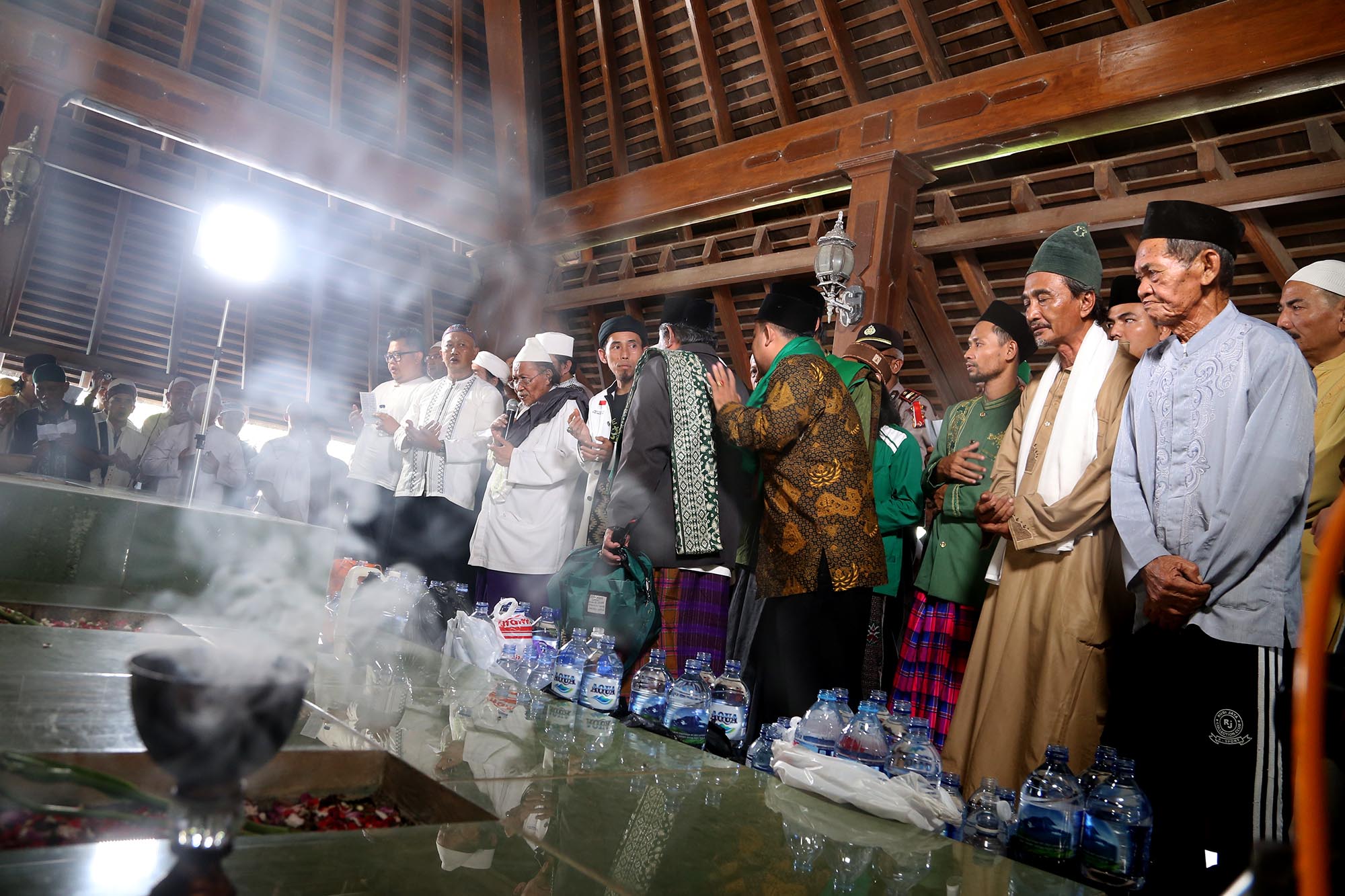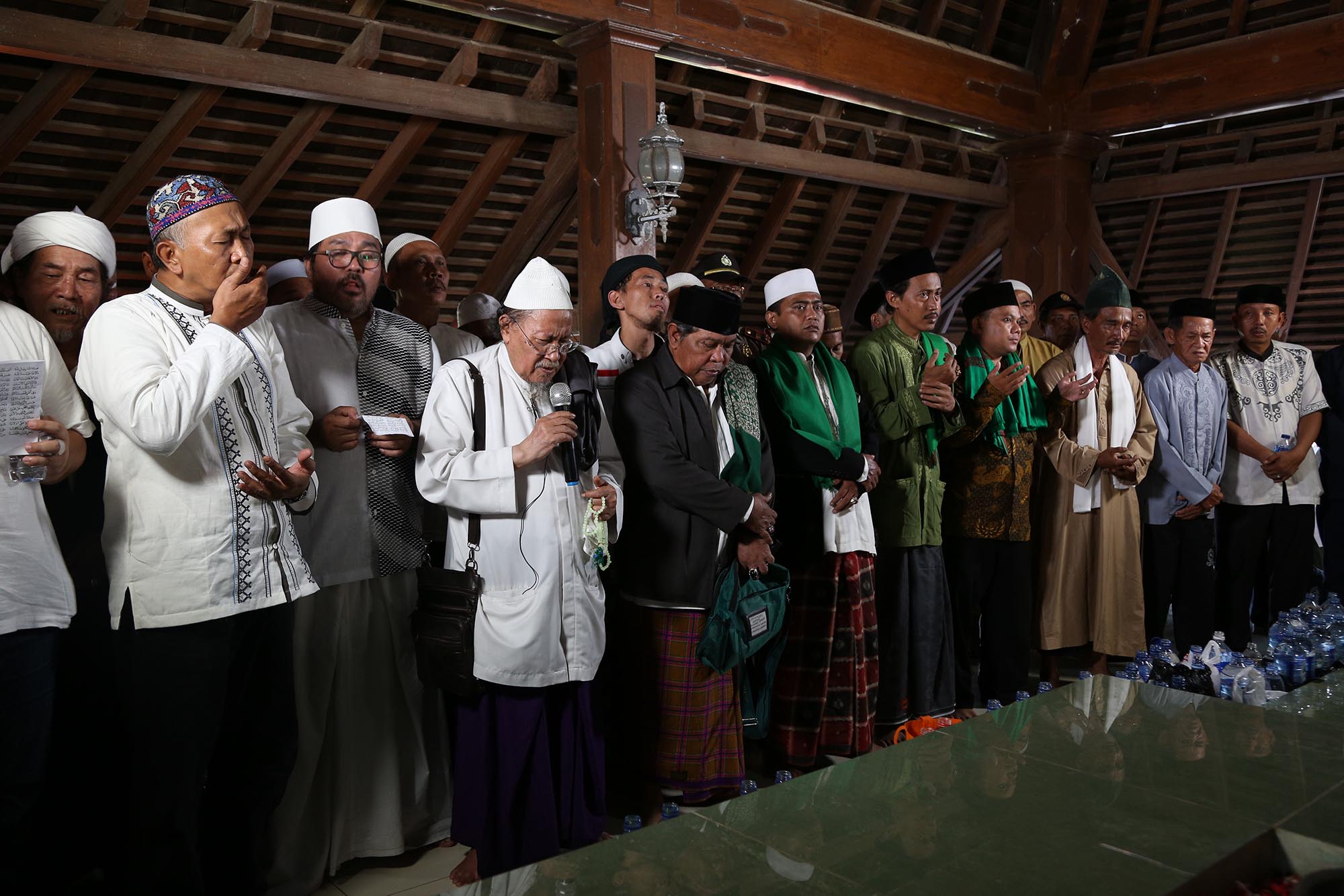 Pimpinan Majlis Dzikir Ikhwanusshofa KH. Abdul Hamid Husen dan jamaah berdoa pada prosesi ziarah kubur di makam Mbah KH Husen, salah satu penyebar Agama Islam di Pantai Utara Jawa, Pamanukan, Subang, Jawa Barat, Minggu (29/4). Ziarah tersebut merupakan salah satu tradisi menjelang bulan suci Ramadan. AKTUAL/Istimewa