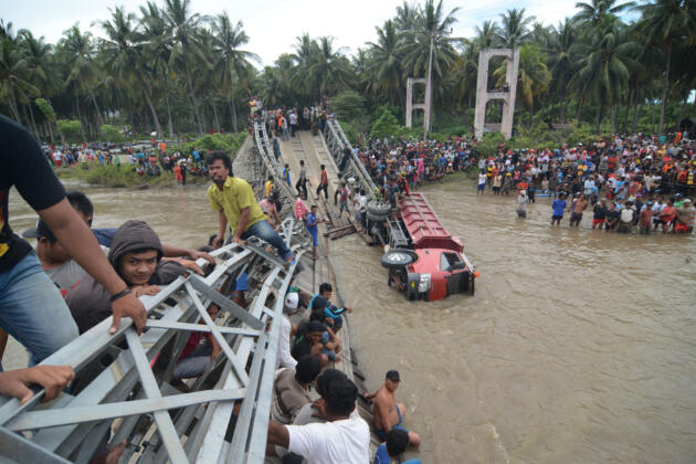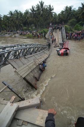 Sebuah truk tercebur ke sungai ketika jembatan yang dilaluinya roboh di Desa Kaleke, Dolo Barat, Kabupaten Sigi, Sulawesi Tengah, Sabtu (30/4). Jembatan yang menghubungkan Desa Kaleke dan Maku itu roboh sekitar pukul 06.15 Wita dan mengakibatkan dua truk tercebur ke sungai dan seorang sopir dikabarkan tewas terjepit oleh reruntuhan jembatan. ANTARA FOTO/Basri Marzuki/pd/16