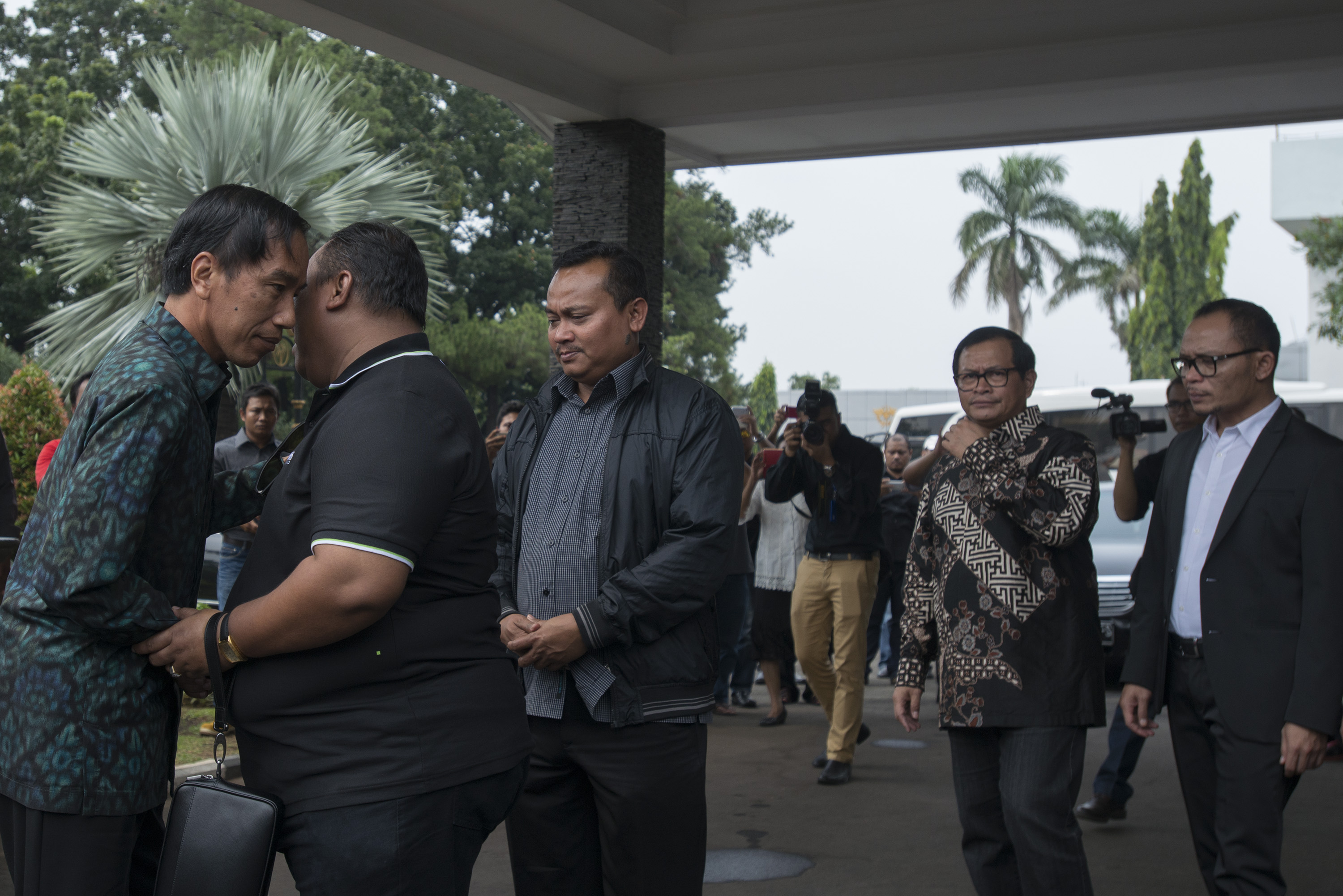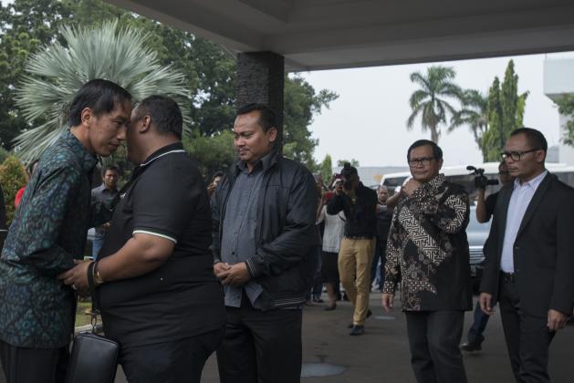 Presiden Joko Widodo (kiri) memberi ucapan belasungkawa kepada anak dari Jacob Nuwa Wea, Andi Gani Nena Wea (kedua kiri) disaksikan Menteri Ketenagakerjaan Hanif Dhakiri (kanan) dan Sekretaris Kabinet Pramono Anung (kedua kanan) di Bandara Halim Perdanakusuma, Jakarta, Minggu (10/4). Jacob Nuwa Wea yang pernah menjadi menakertrans di era Megawati tersebut meninggal akibat sakit di Rumah Sakit Gleaneagles Penang, Malaysia. ANTARA FOTO/Rosa Panggabean/pd/16.