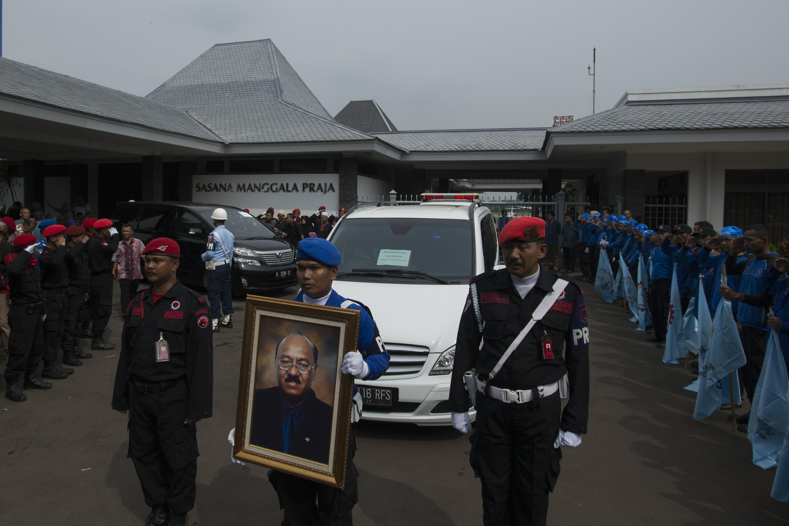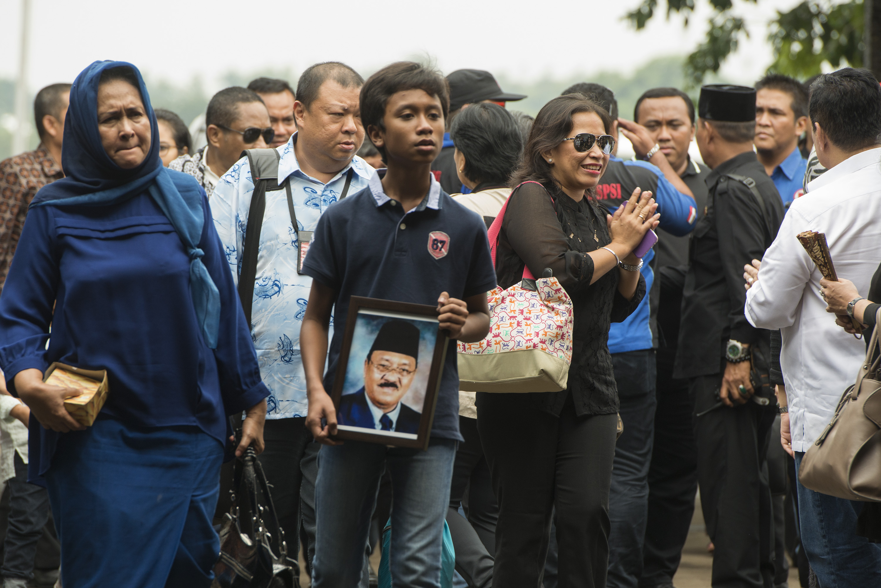 Cucu dari Jacob Nuwa Wea, Evan (tengah), membawa foto Jacob saat jenazahnya tiba di Bandara Halim Perdanakusuma, Jakarta, Minggu (10/4). Jacob Nuwa Wea yang pernah menjadi menakertrans di era Megawati tersebut meninggal akibat sakit di Rumah Sakit Gleaneagles Penang, Malaysia. ANTARA FOTO/Rosa Panggabean/pd/16.