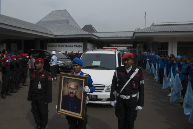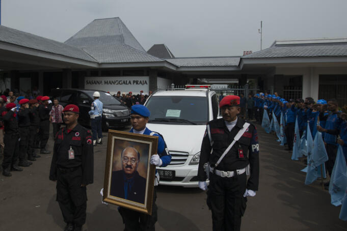 Iring-iringan mobil yang membawa jenazah Jacob Nuwa Wea meninggalkan Bandara Halim Perdanakusuma menuju rumah duka, Jakarta, Minggu (10/4). Jacob Nuwa Wea yang pernah menjadi menakertrans di era Megawati tersebut meninggal akibat sakit di Rumah Sakit Gleaneagles Penang, Malaysia. ANTARA FOTO/Rosa Panggabean/pd/16.