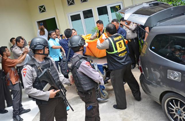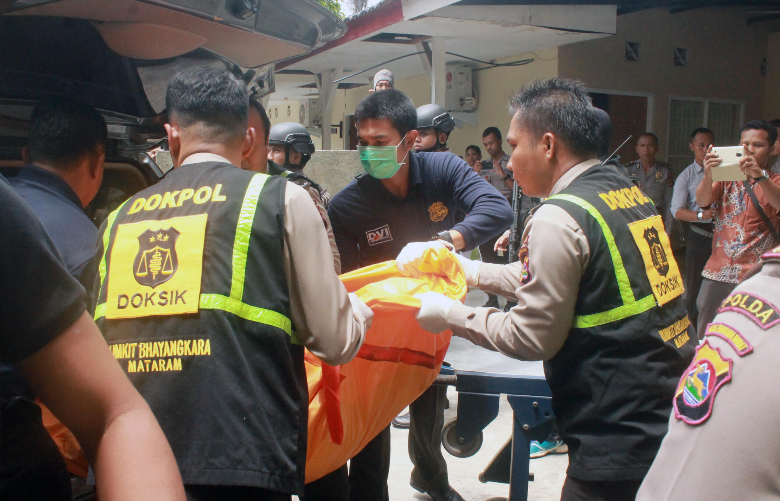 Sejumlah anggota Polisi menurunkan jenazah terduga anggota teroris yang tewas, untuk dilakukan otopsi di RS Bhayangkara Polda NTB di Mataram, Selasa (16/2). Terduga teroris berinisial FR yang tewas tertembak saat penggerebekan Senin (15/2) di Kampung Penatoi Bima tersebut diduga berkaitan dengan jaringan Santoso. ANTARA FOTO/Hero/AS/ama/16.