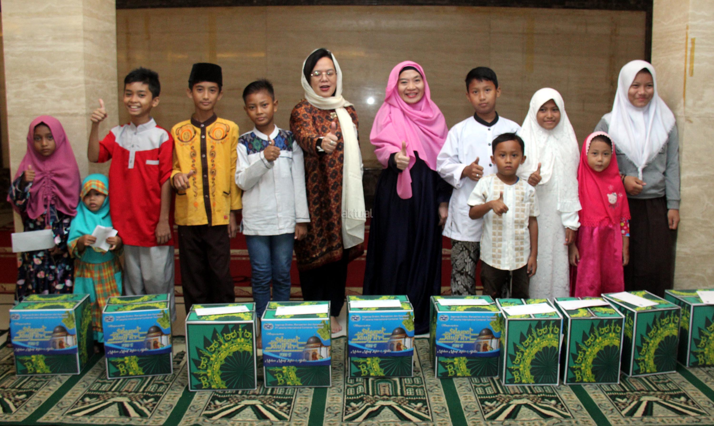Direktur HRA PT Jakarta International Container Terminal (JICT) Tara Singgih (tengah) dan Manager Corporate Affairs Indira Gita Lestari (keenam kanan) foto bersama usai memberikan bingkisan kepada anak-anak dan kaum dhuafa saat acara buka bersama karyawan JICT, Jakarta, Kamis (7/6/2018). Menyambut Idul Fitri, JICT memberikan santunan bagi 400 kaum dhuafa dan masjid di Jakarta Utara. AKTUAL/Tino Oktaviano