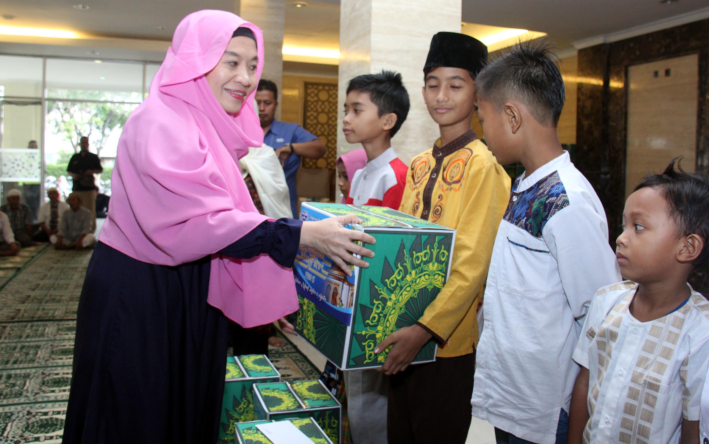 Manager Corporate Affairs Indira Gita Lestari memberikan bingkisan kepada anak-anak dan kaum dhuafa saat acara buka bersama karyawan JICT, Jakarta, Kamis (7/6/2018). Menyambut Idul Fitri, JICT memberikan santunan bagi 400 kaum dhuafa dan masjid di Jakarta Utara. AKTUAL/Tino Oktaviano