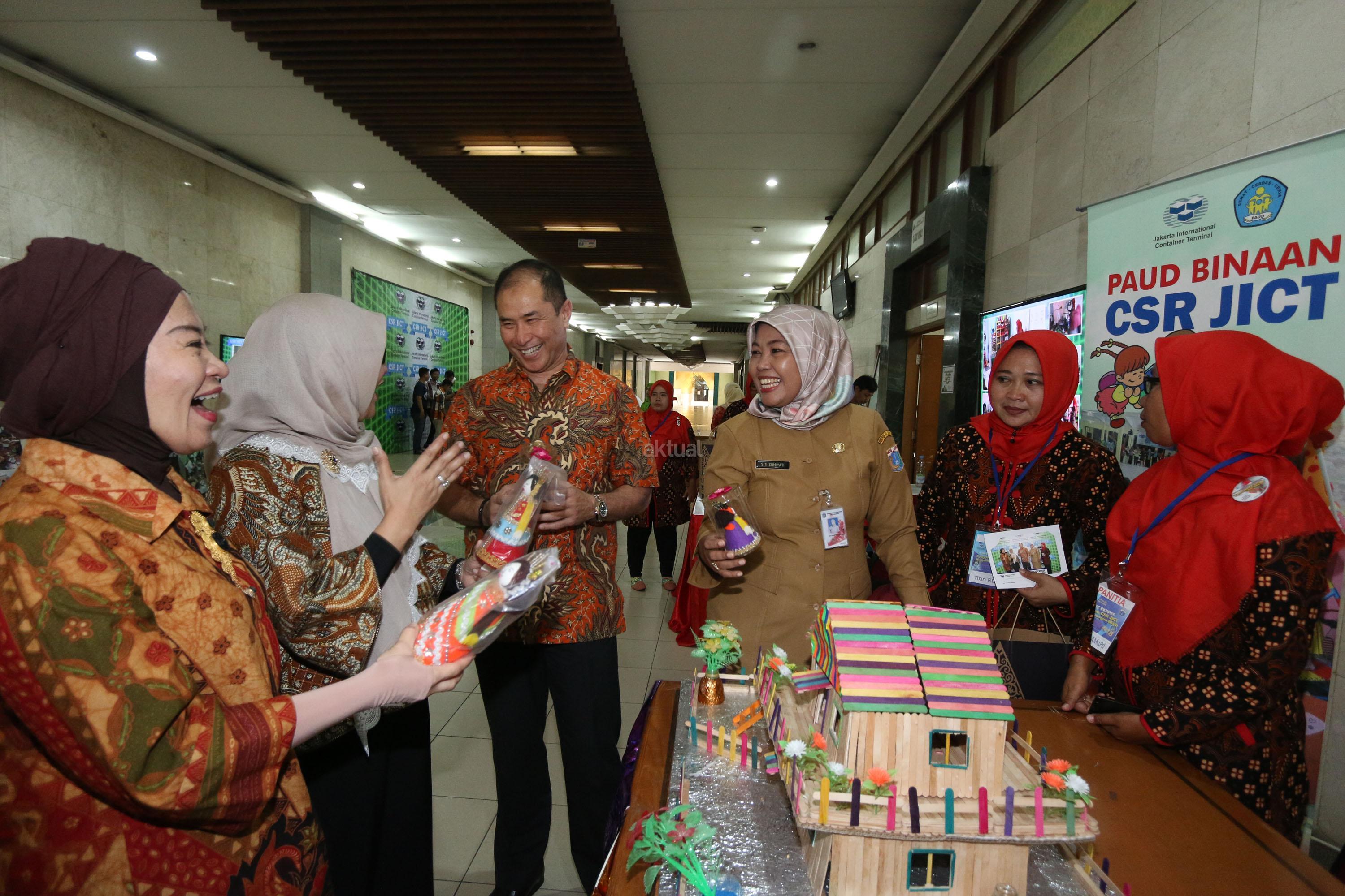 Wakil Presdir Jakarta Inernational Container Terminal (JICT) Riza Erivan (ketiga kiri) dan Wakil Ketua II TP PKK Jakarta Utara Siti Nurlaila Desi (kedua kiri) didampingi Ibu PKK lainnya melihat prakarya anak anak PAUD usai meresmikan program public expose CSR, bertajuk “Pengembangan PAUD Jakarta Utara”, di Islamic Center, Jakarta Utara, Selasa (27/3/18). JICT senantiasa berupaya meningkatkan kompetensi masyarakat dengan program CSR JICT, lewat program di bidang pendidikan, kesehatan dan lingkungan. Selain itu JICT mencoba selalu mengeksplorasi program yang tepat guna agar perusahaan dan masyarakat dapat tumbuh bersama. AKTUAL/Tino Oktaviano
