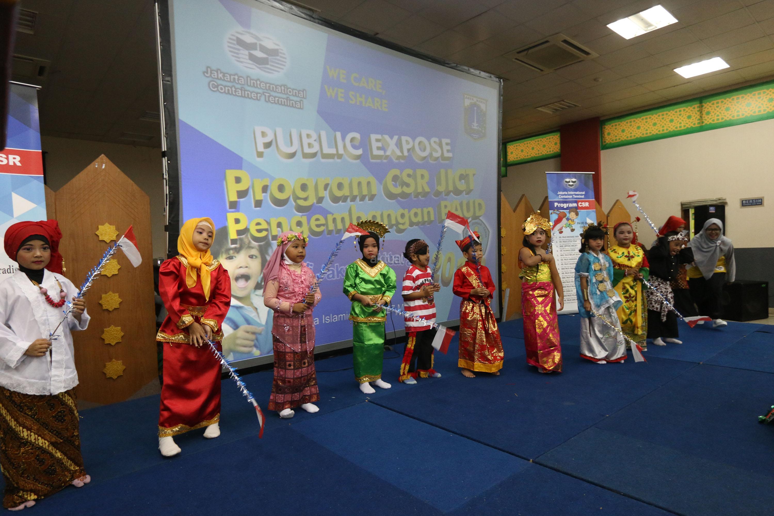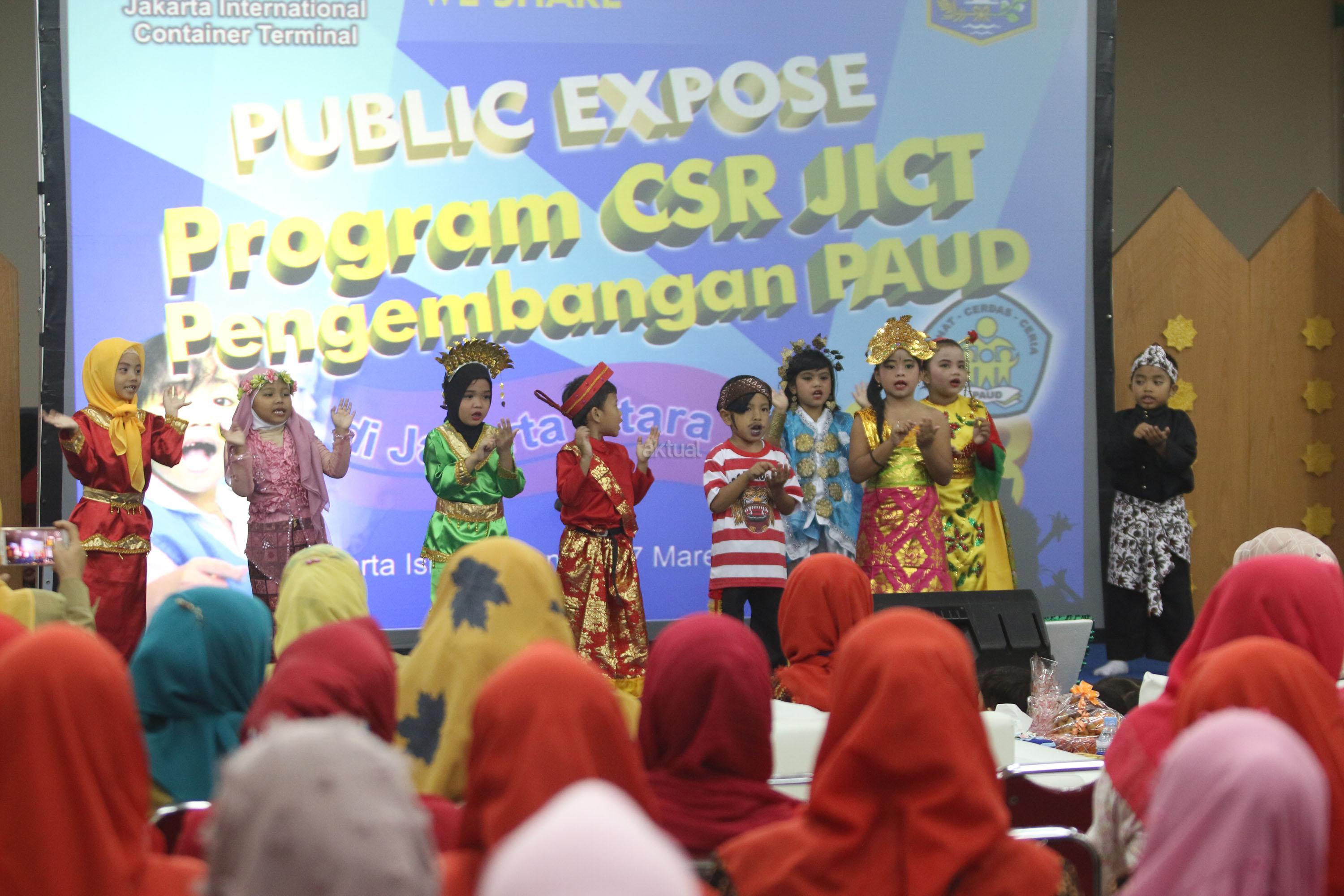 Anak anak PAUD menampilkan tarian saat acara program public expose CSR, bertajuk “Pengembangan PAUD Jakarta Utara”, di Islamic Center, Jakarta Utara, Selasa (27/3/18). JICT senantiasa berupaya meningkatkan kompetensi masyarakat dengan program CSR JICT, lewat program di bidang pendidikan, kesehatan dan lingkungan. Selain itu JICT mencoba selalu mengeksplorasi program yang tepat guna agar perusahaan dan masyarakat dapat tumbuh bersama. AKTUAL/Tino Oktaviano
