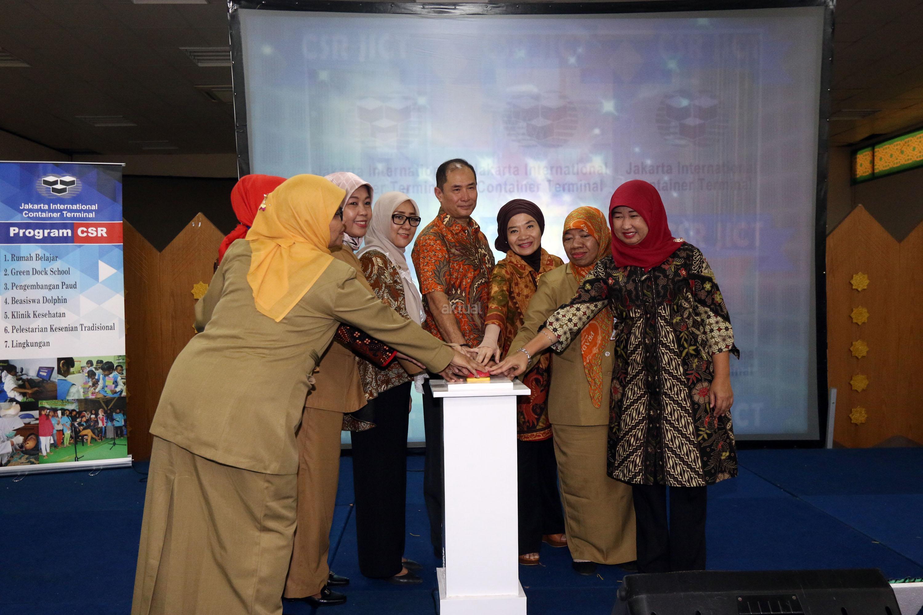 Wakil Presdir Jakarta Inernational Container Terminal (JICT) Riza Erivan (tengah) dan Wakil Ketua II TP PKK Jakarta Utara Siti Nurlaila Desi (ketiga kiri) didampingi Ibu PKK lainnya menekan tombol saat meresmikan program public expose CSR, bertajuk “Pengembangan PAUD Jakarta Utara”, di Islamic Center, Jakarta Utara, Selasa (27/3/18). JICT senantiasa berupaya meningkatkan kompetensi masyarakat dengan program CSR JICT, lewat program di bidang pendidikan, kesehatan dan lingkungan. Selain itu JICT mencoba selalu mengeksplorasi program yang tepat guna agar perusahaan dan masyarakat dapat tumbuh bersama. AKTUAL/Tino Oktaviano