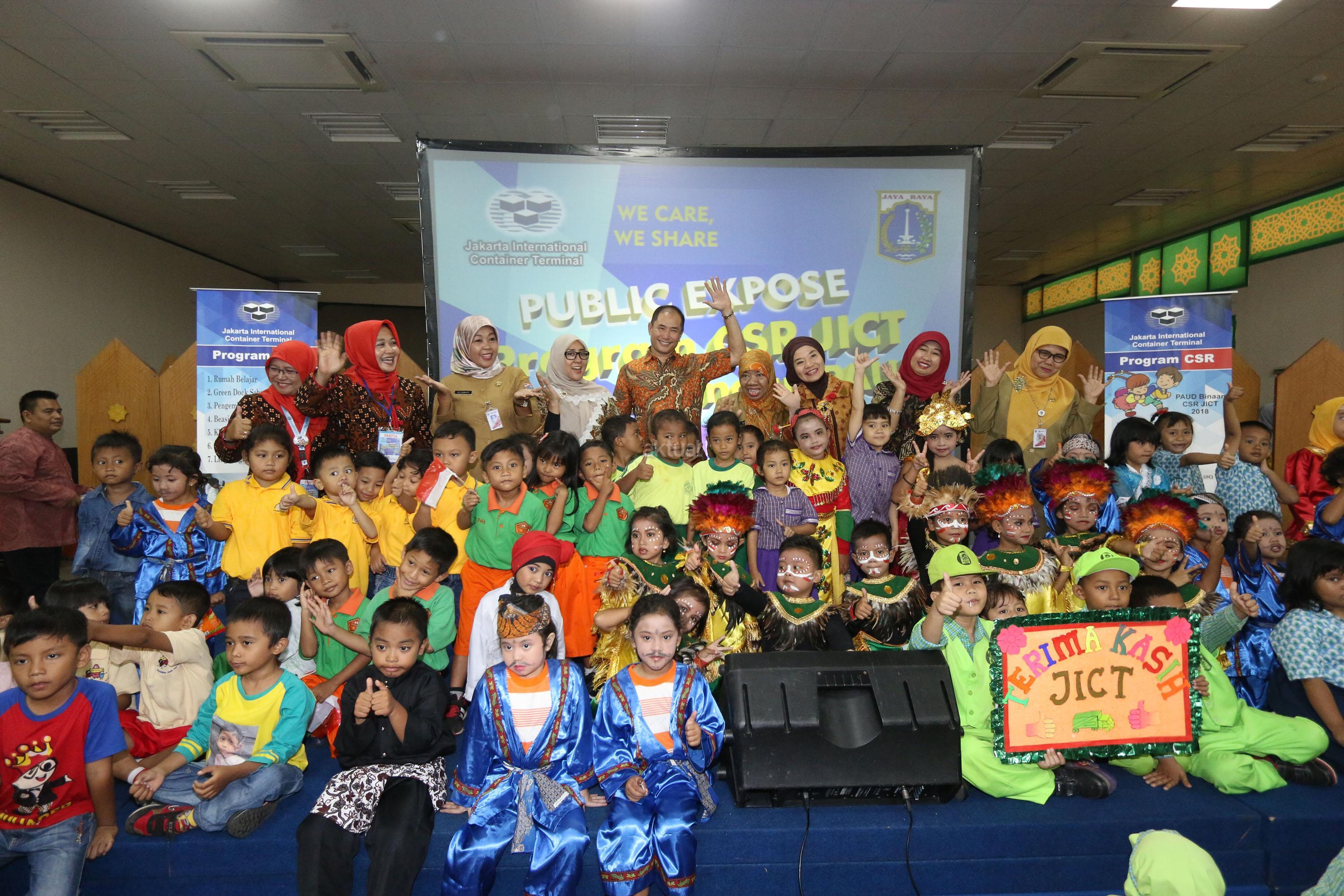 Wakil Presdir Jakarta Inernational Container Terminal (JICT) Riza Erivan dan Wakil Ketua II TP PKK Jakarta Utara Siti Nurlaila Desi didampingi Ibu PKK lainnya dan anak anak PAUD foto bersama usai meresmikan program public expose CSR, bertajuk “Pengembangan PAUD Jakarta Utara”, di Islamic Center, Jakarta Utara, Selasa (27/3/18). JICT senantiasa berupaya meningkatkan kompetensi masyarakat dengan program CSR JICT, lewat program di bidang pendidikan, kesehatan dan lingkungan. Selain itu JICT mencoba selalu mengeksplorasi program yang tepat guna agar perusahaan dan masyarakat dapat tumbuh bersama. AKTUAL/Tino Oktaviano