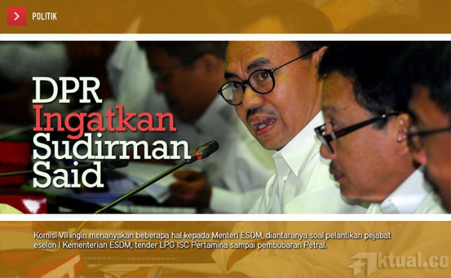 Jakarta, Aktual.co — Menteri Energi dan Sumber Daya Mineral (ESDM), Sudirman Said akan dipanggil paksa jika mangkir lagi dari panggilan Komisi VII DPR RI. Sebab, Komisi VII ingin menanyakan beberapa hal kepada Menteri ESDM, diantaranya soal pelantikan pejabat eselon I Kementerian ESDM, tender LPG ISC Pertamina sampai pembubaran Petral.