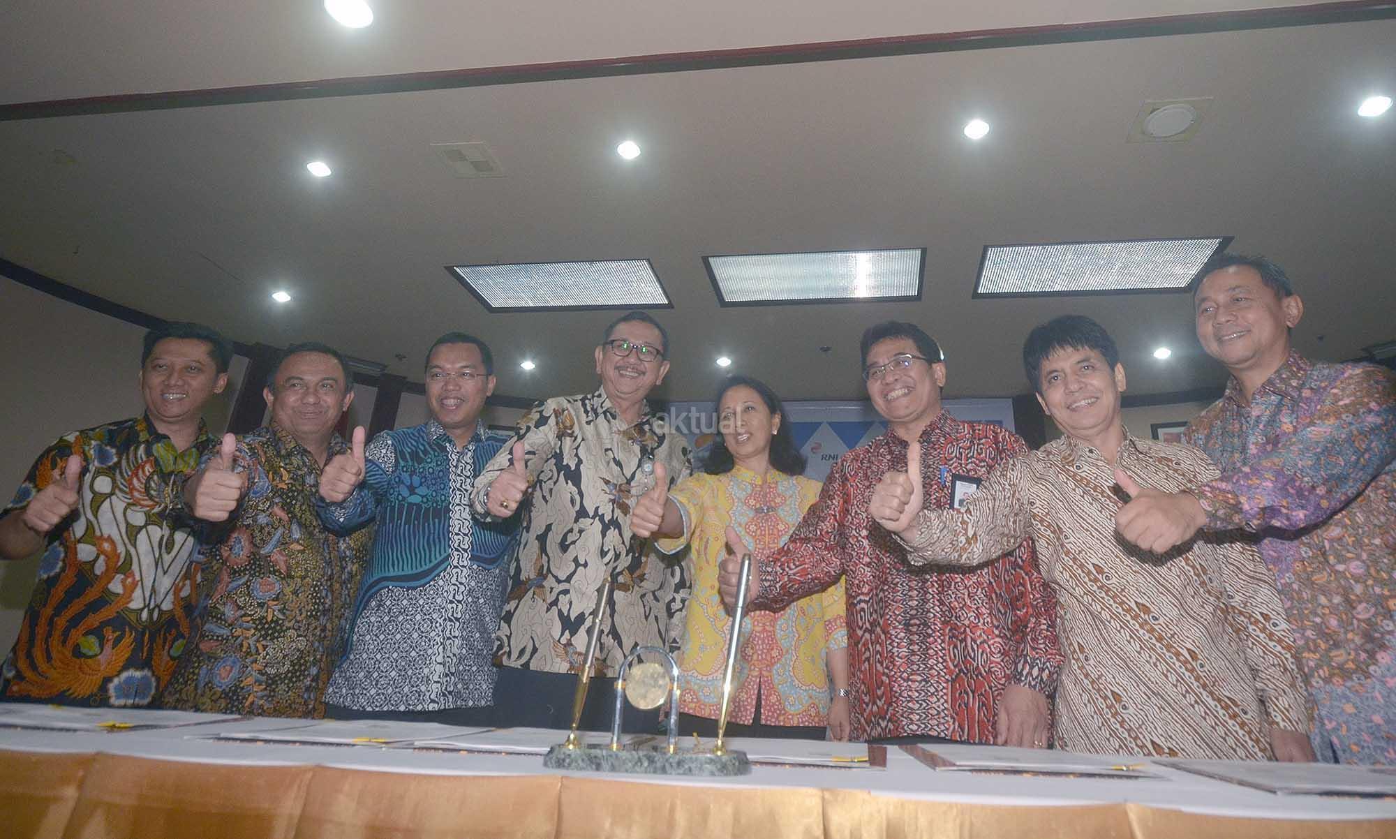 Menteri BUMN Rini Soemarno (keempat dari kanan) bersama Dirut Jiwasraya, Hendrisman Rahim (keempat dari kiri) dan Direktur Pengembangan Bisnis PT Pembangunan Perumahan (Persero), Lukman Hidayat (kedua dari kiri) serta jajaran direksi BUMN lainnya saling mengacungkan jempol seusai penandatanganan naskah kerjasama PT Asuransi Jiwasraya dengan 4 BUMN lintas sektor , di Jakarta, Kamis (29/9). Kelima BUMN ini adalah pemain utama di dalam industri yang digelutinya, sehingga sinergi kelimanya akan menghasilkan nilai tambah yang eksponensial untuk masyarakat maupun pemegang saham.
