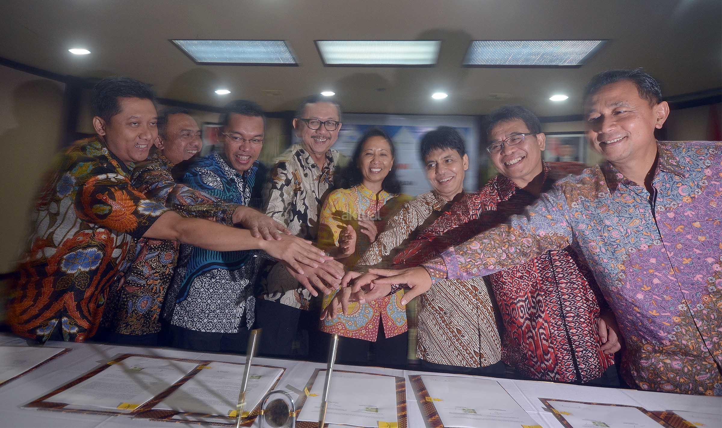 Menteri BUMN Rini Soemarno (kiri) bersama Dirut Jiwasraya, Hendrisman Rahim (kedua dari kiri) menyaksikan Direktur Pengembangan Bisnis PT Pembangunan Perumahan (Persero), Lukman Hidayat (kedua dari kanan) , Dirut PT Telkom, Alex Sinaga (kanan) serta jajaran direksi BUMN lainnya melakukan penandatanganan naskah kerjasama PT Asuransi Jiwasraya dengan 4 BUMN lintas sektor , di Jakarta, Kamis (29/9). Kelima BUMN ini adalah pemain utama di dalam industri yang digelutinya, sehingga sinergi kelimanya akan menghasilkan nilai tambah yang eksponensial untuk masyarakat maupun pemegang saham.