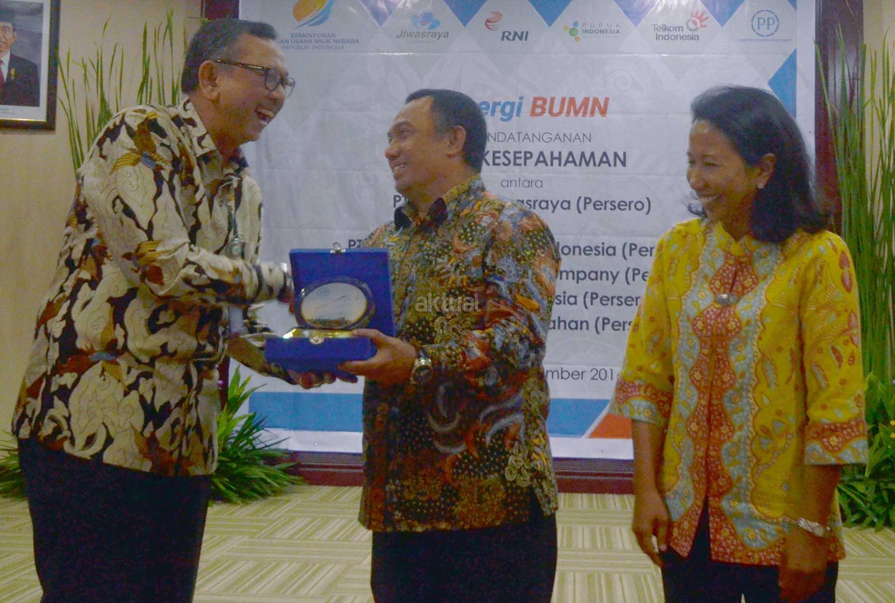 Direktur Pengembangan Bisnis PT Pembangunan Perumahan (Persero), Lukman Hidayat (tengah), disaksikan Menteri BUMN Rini Soemarno (kanan), menerima cenderamata dari Dirut Jiwasraya, Hendrisman Rahim, usai penandatanganan naskah kerjasama, di Jakarta, Kamis (29/9). PT PP (Persero) Tbk berkerjasama dengan PT Asuransi Jiwasraya untuk penyediaan layanan asuransi jiwa dari PT Asuransi Jiwasraya kepada karyawan PT PP (Persero) Tbk, dan pengelolaan sejumlah aset PT Asuransi Jiwasraya berupa gedung oleh PT PP (Persero) Tbk