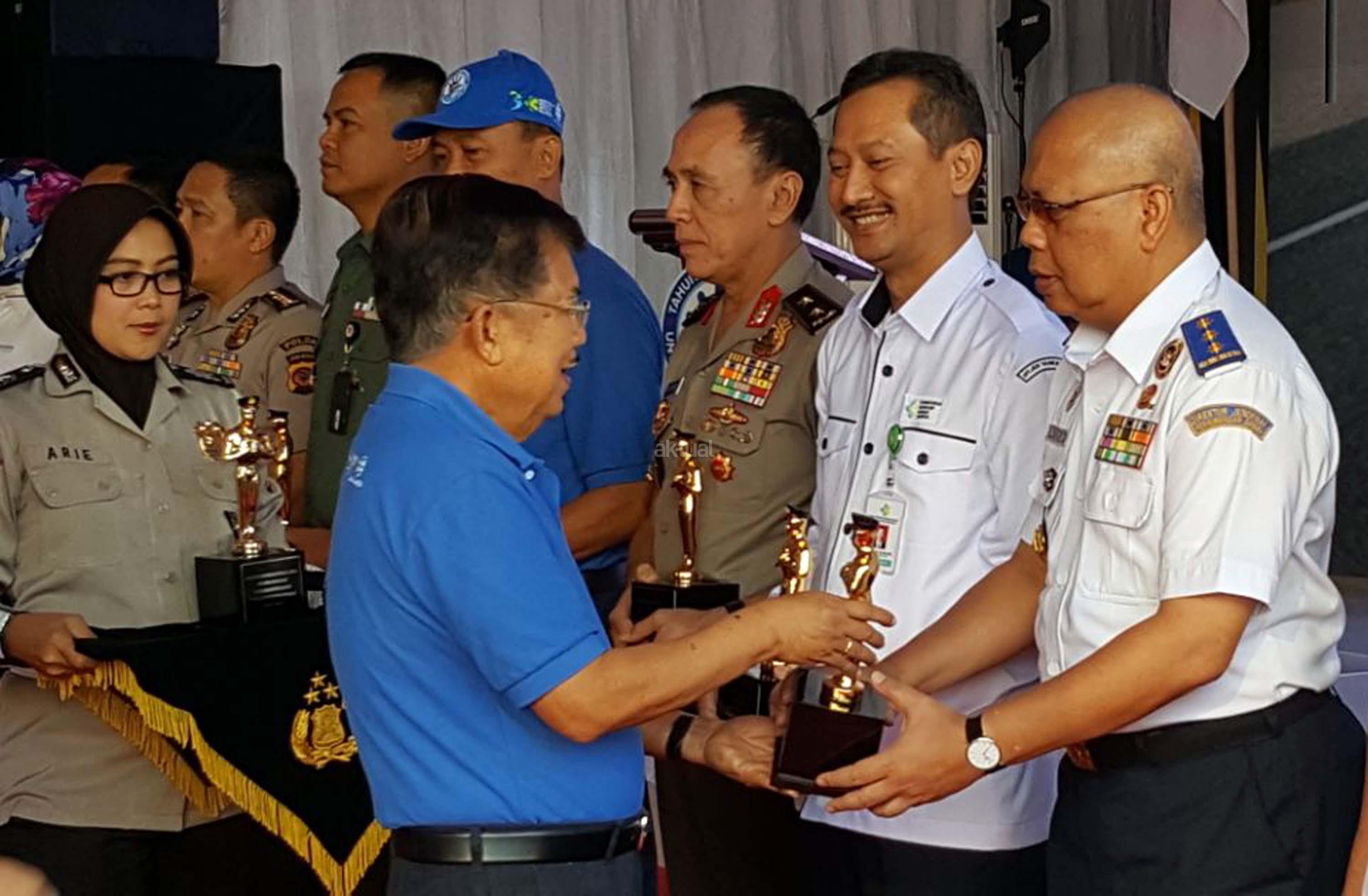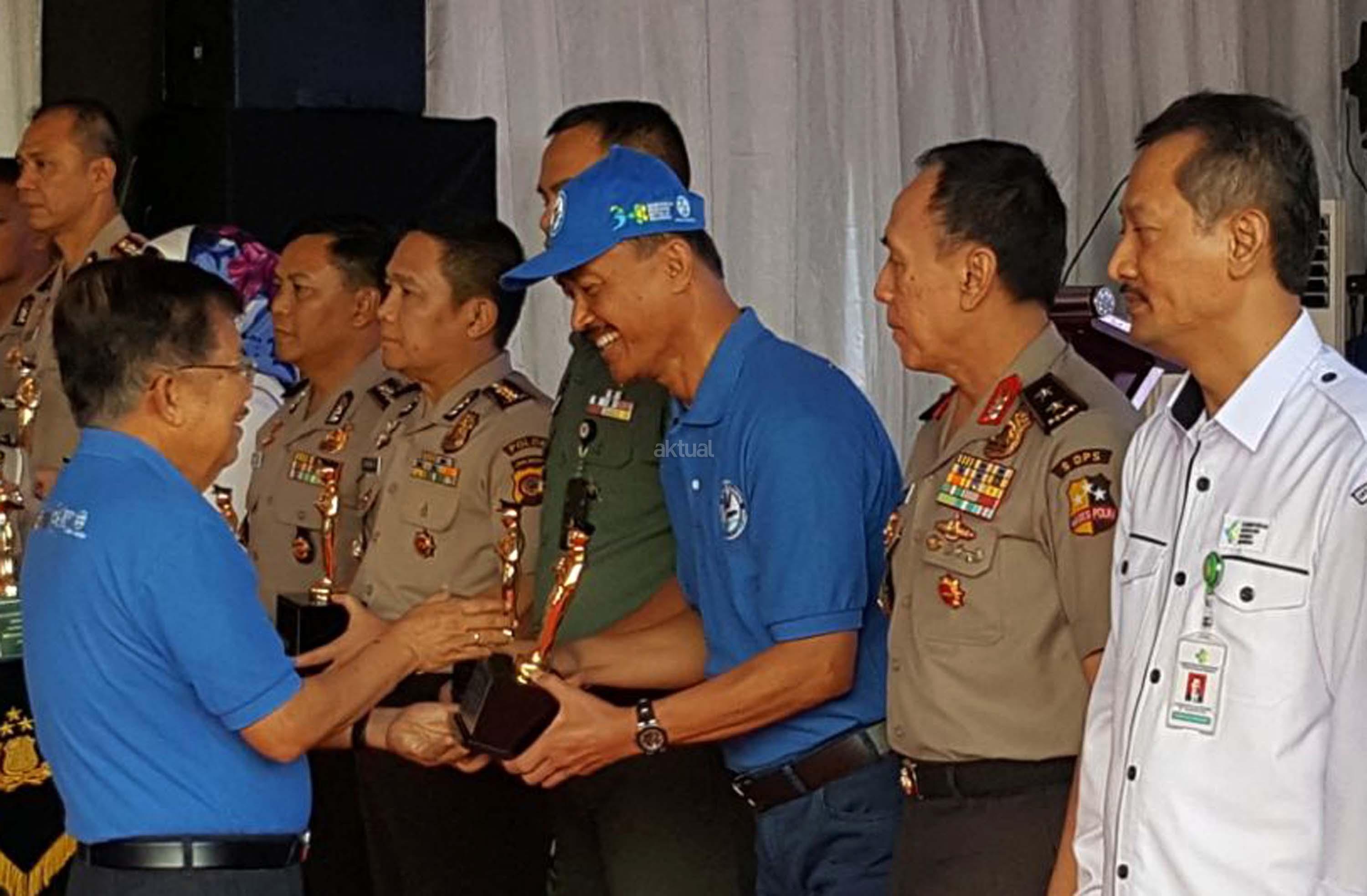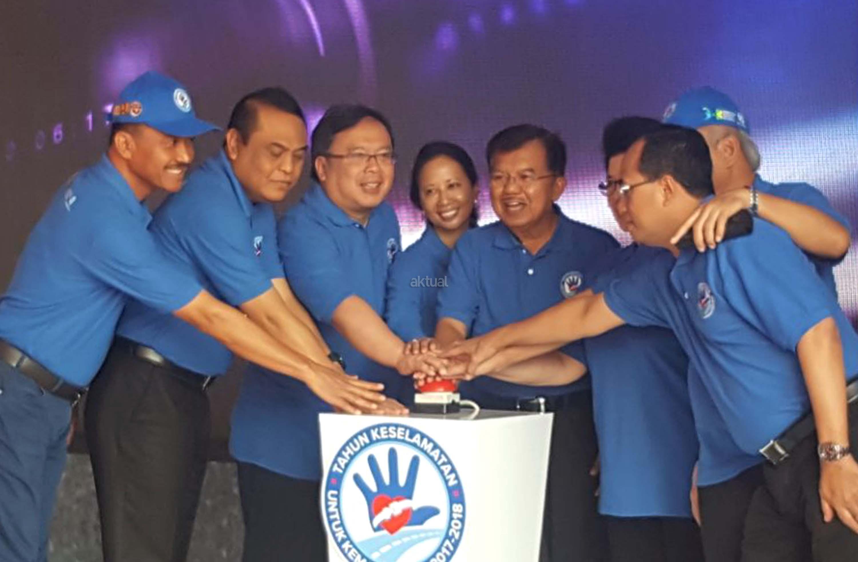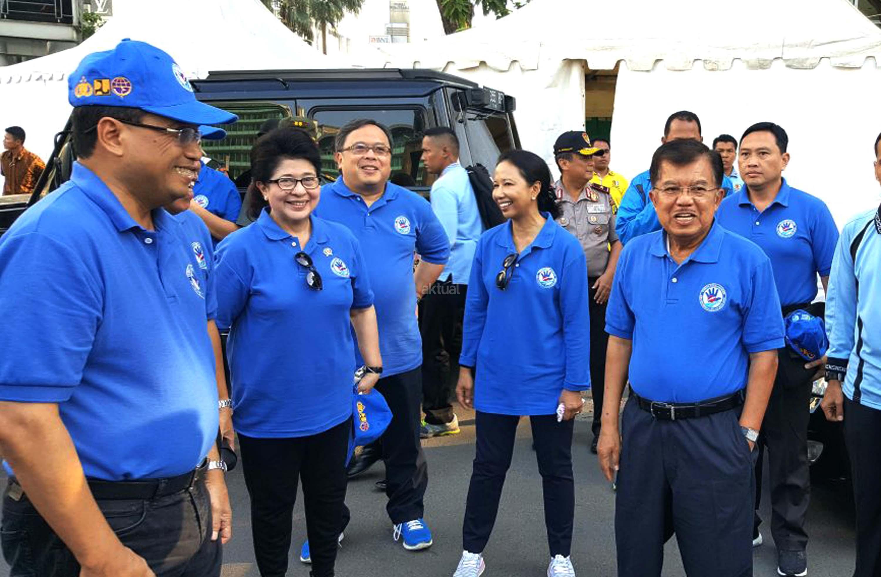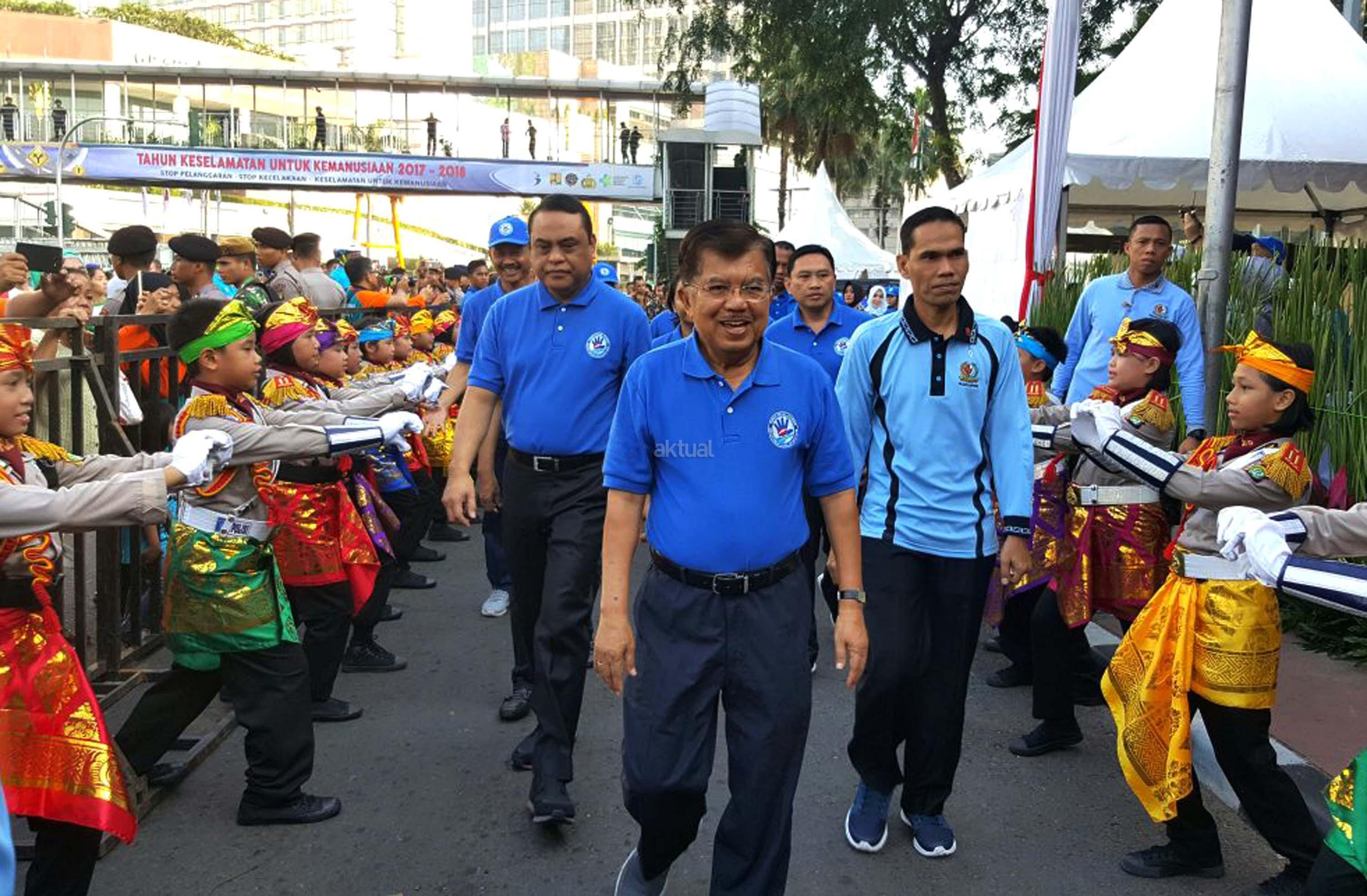 Wakil Presiden Jusuf Kalla (JK), saat menghadiri acara kampanye tahun keselamatan untuk kejiwaaan 2017-2018 di Kawasan HI, Jakarta, Minggu (30/7/2017). Kampanye ini untuk mengajak masyarakat untuk tidak melakukan pelanggaran lalu lintas, serta untuk menghentikan kecelakaan. AKTUAL/Munzir