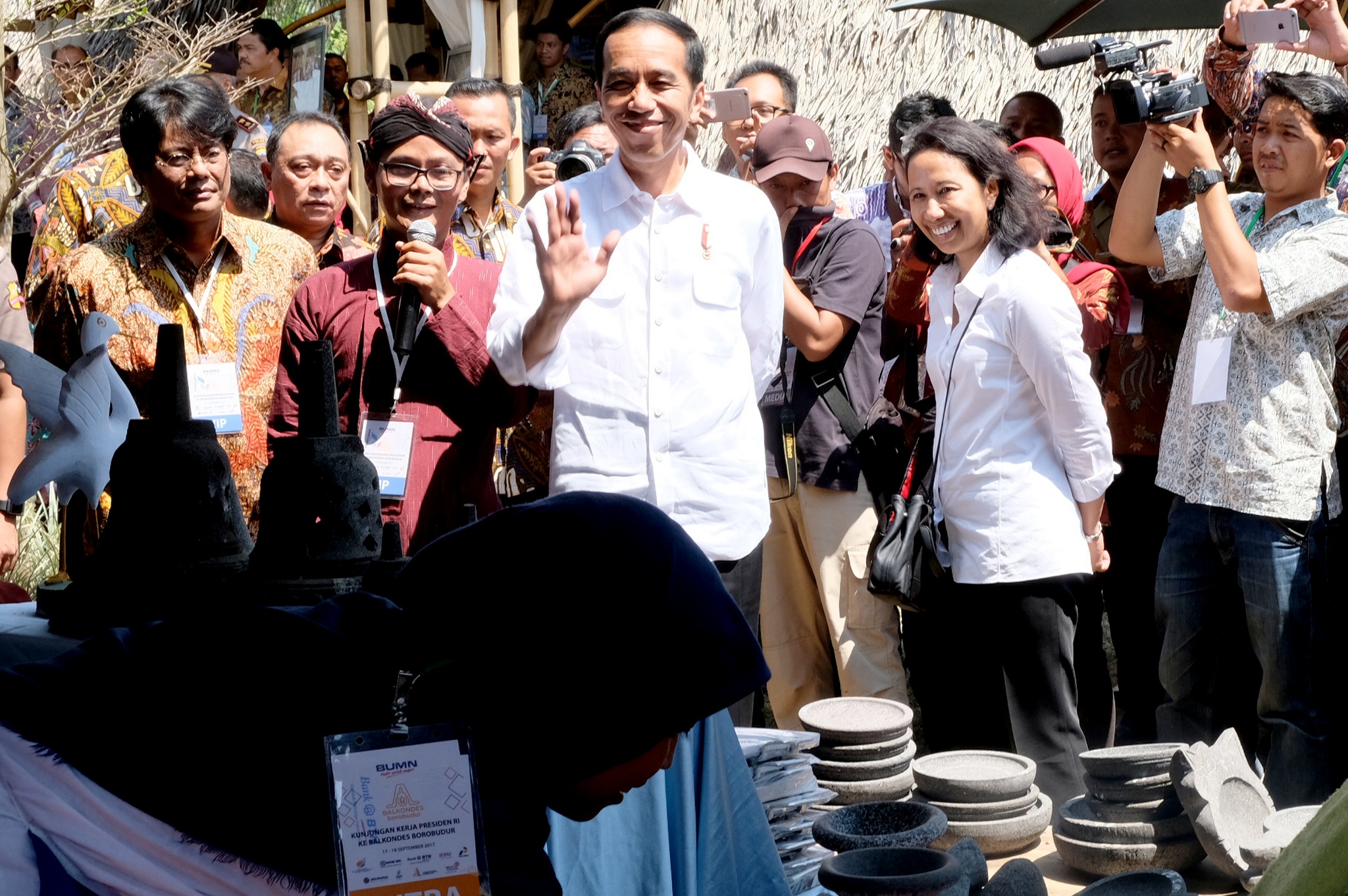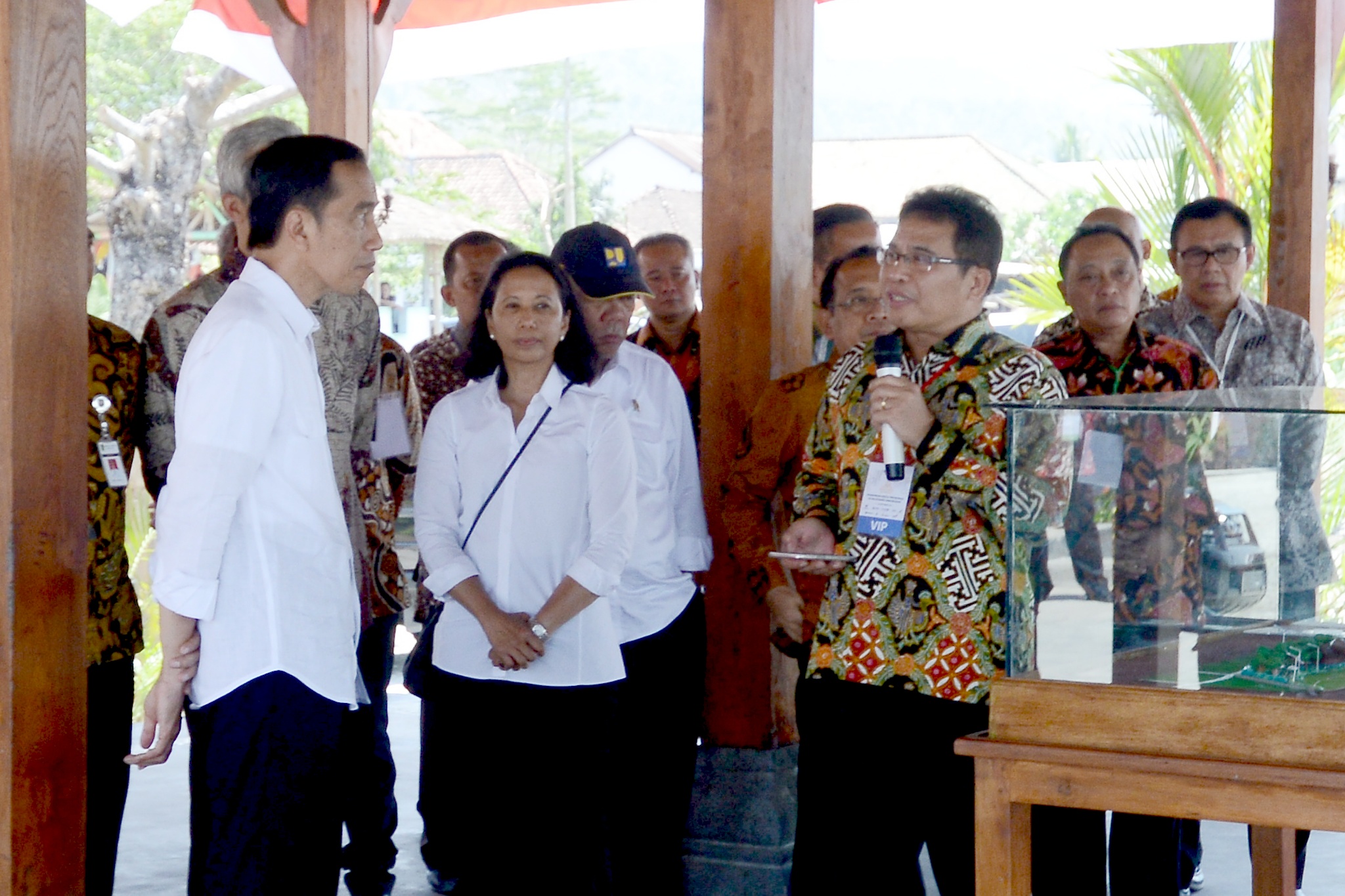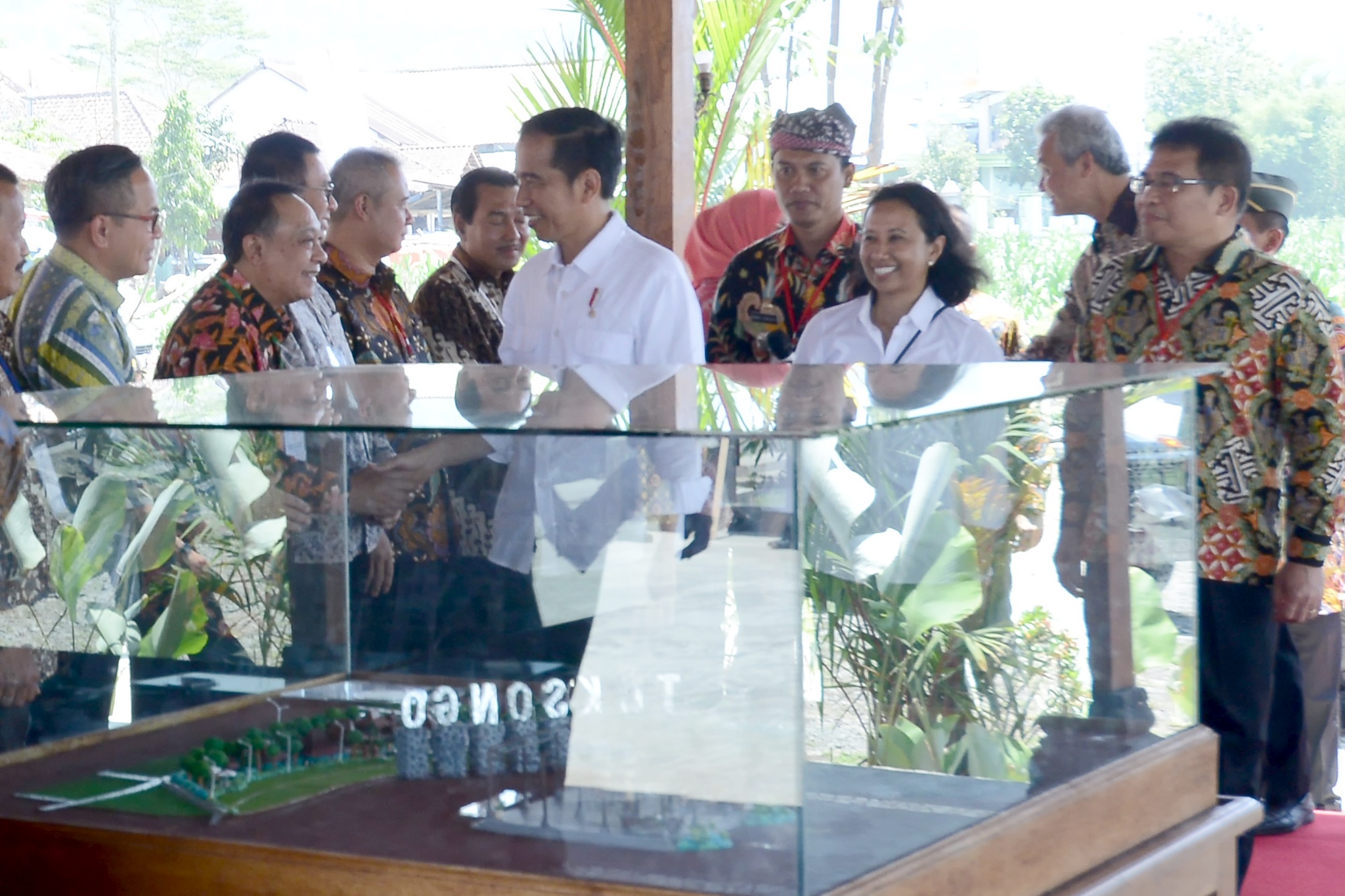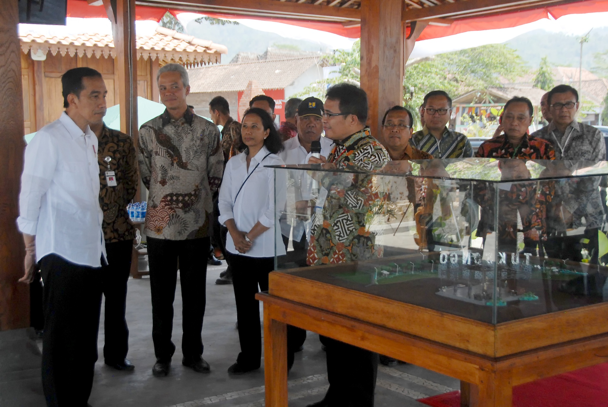 Presiden Joko Widodo didampingi Menteri BUMN Rini M Soemarno, Direktur Utama Bank BTN Maryono dan Gubernur Jawa Tengah Ganjar Pranowo saat meninjau Balai ekonomi desa (Balkondes) yang dibangun oleh BUMN di Magelang, Jawa Tengah, Senin (18/9). Balkondes diharapkan akan menjadi penopang ekonomi masyarakat sekaligus dalam rangka memberikan kontribusi pada ekonomi nasional yang berkeadilan. AKTUAL/Humas BTN