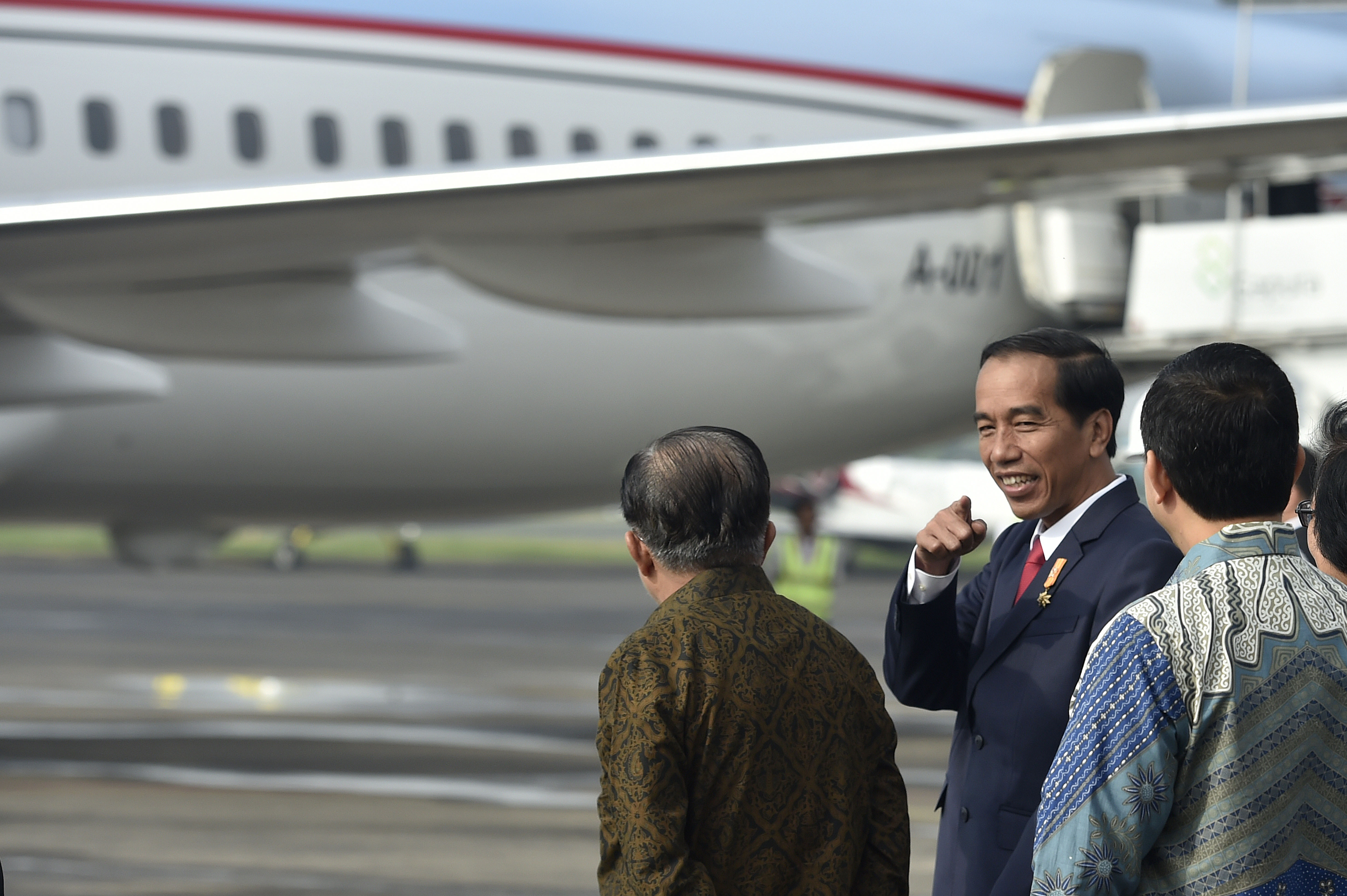 Presiden Joko Widodo melambaikan tangan sebelum bertolak ke Eropa di Bandara Halim Perdanakusuma Jakarta, Minggu (17/4). Presiden Joko Widodo bersama sejumlah menteri Kabinet Kerja bertolak ke Jerman, Inggris, Belgia, dan Belanda dalam rangka memenuhi undangan sejumlah kepala negara untuk membahas kerjasama bidang ekonomi dan membangun perdamaian dunia dengan Uni Eropa (UE). ANTARA FOTO/Puspa Perwitasari/foc/16.