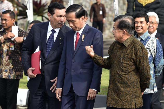 Presiden Joko Widodo (tengah) didampingi Wakil Presiden Jusuf Kalla (kanan) dan Menko Polhukam Luhut Pangaribuan (kedua kiri) berjalan menuju pesawat kepresidenan di Bandara Halim Perdanakusuma Jakarta, Minggu (17/4). Presiden Joko Widodo bersama sejumlah menteri Kabinet Kerja bertolak ke Jerman, Inggris, Belgia, dan Belanda dalam rangka memenuhi undangan sejumlah kepala negara untuk membahas kerjasama bidang ekonomi dan membangun perdamaian dunia dengan Uni Eropa (UE). ANTARA FOTO/Puspa Perwitasari/foc/16.