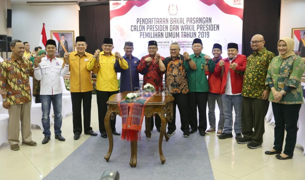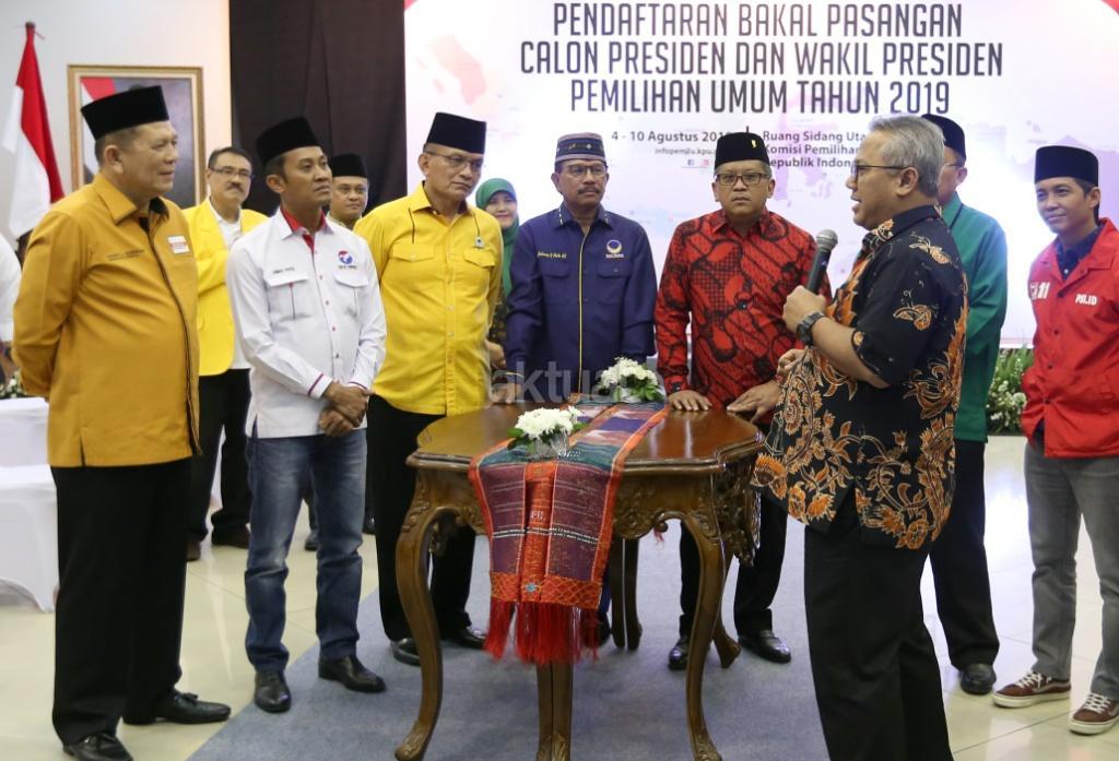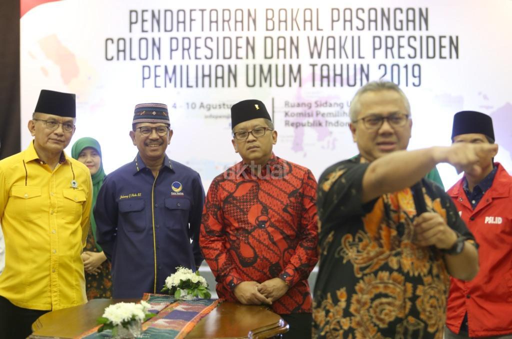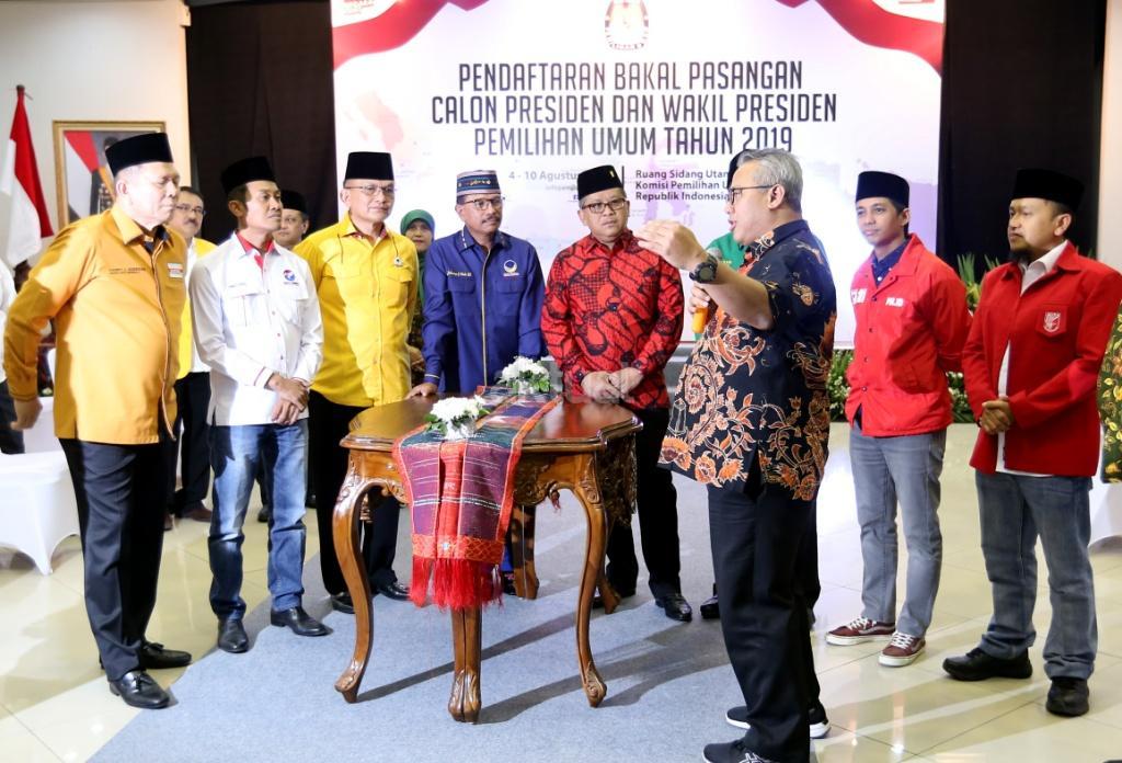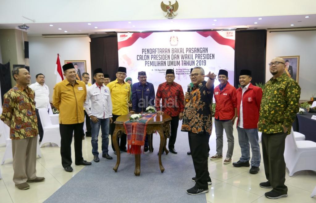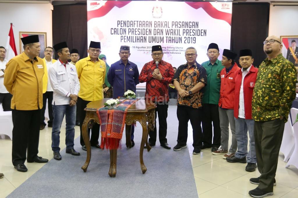 Ketua Komisi Pemilihan Umum (KPU) Republik Indonesia Arief Budiman menerima delapan Sekjen partai politik yang di pimpin Sekjen PDI Perjuangan Hasto Kristiyanto untuk mengkonfirmasi pendaftaran Jokowi sebagai calon presiden pada pemilihan umum 2019 di kantor KPU Pusat, Jakarta, Selasa (7/8). Sebanyak 9 partai politik (PDIP, Golkar, Hanura, Nasdem, PSI, Perindo, PPP, PKB dan PKPI) berkoalisi menyokong Jokowi dalam pemilihan presiden 2019 mendatang. AKTUAL/Tino Oktaviano