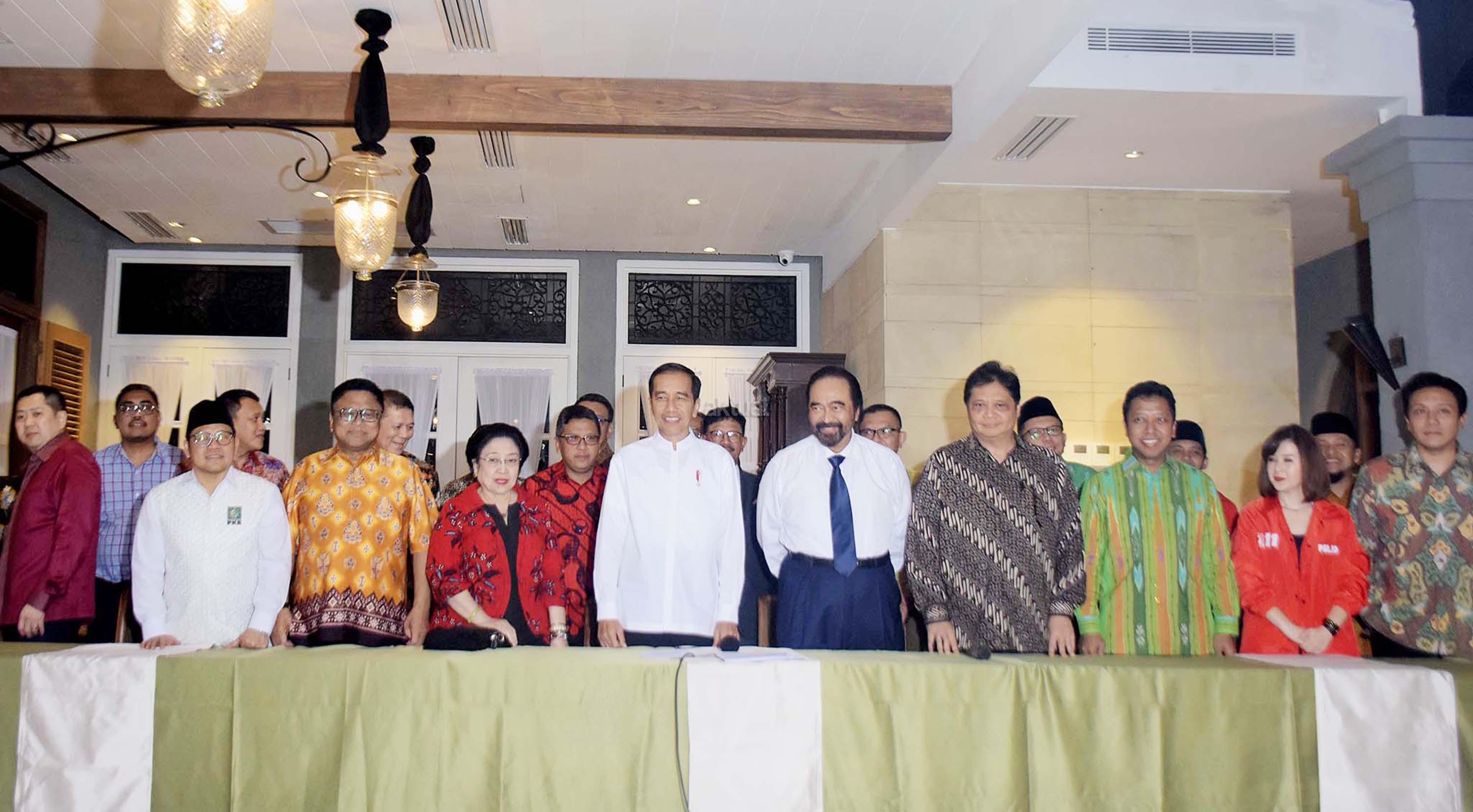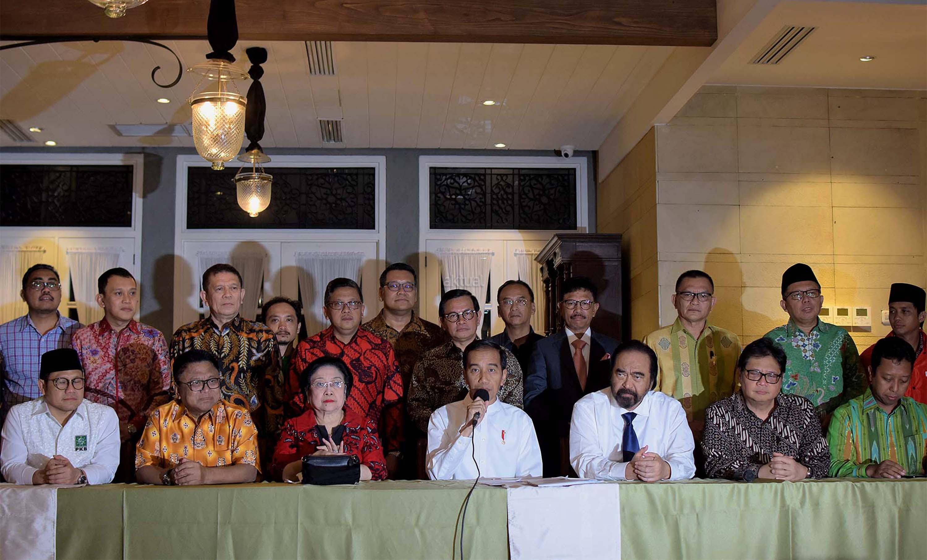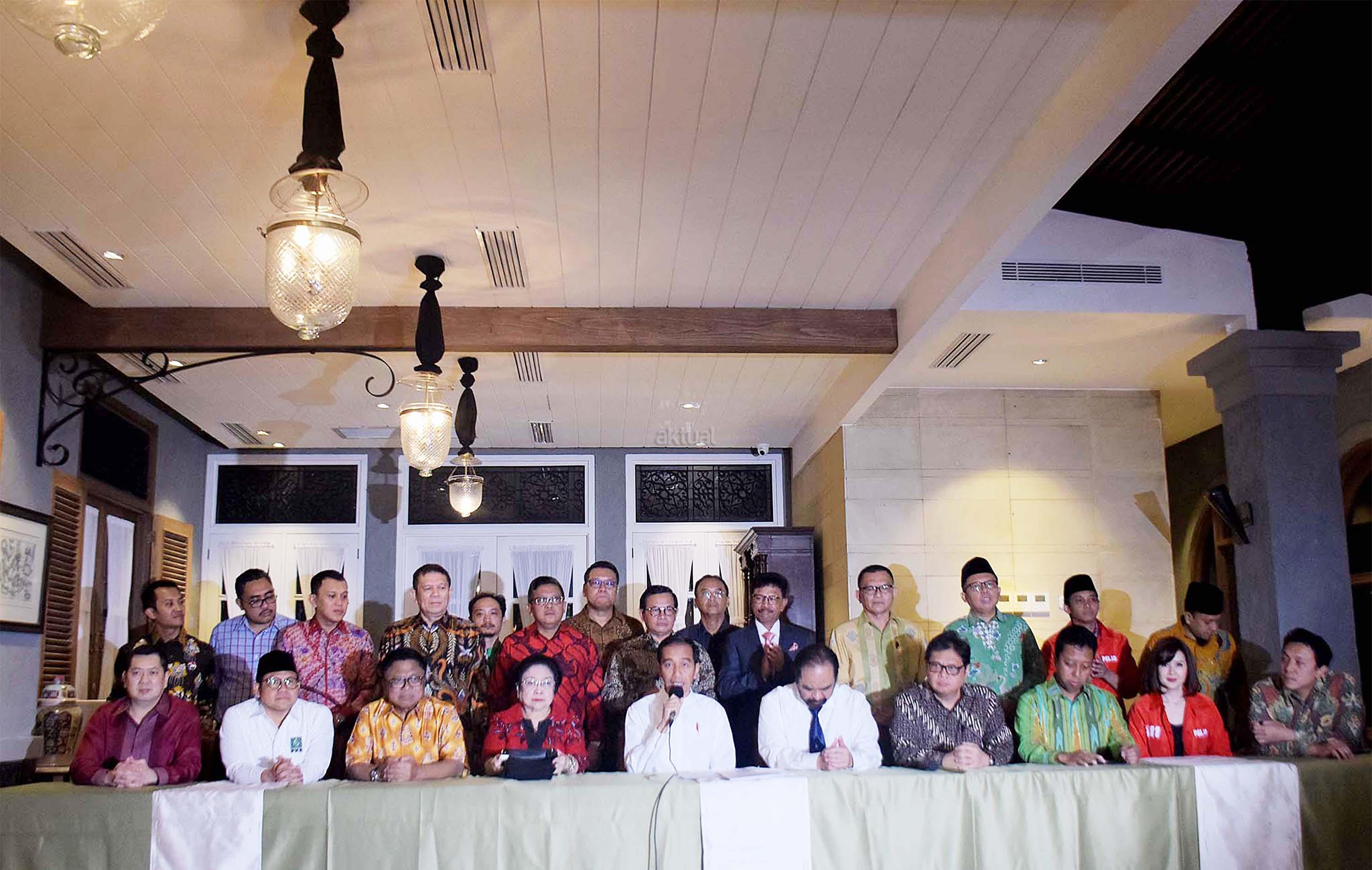 Presiden Joko Widodo (tengah) bersiap memberikan keterangan pers usai pertemuan dengan pimpinan partai dan sekjen partai pengusung koalisi di kawasan Menteng Jakarta Pusat, Kamis (9/8/2018) sore. Hasil pertemuan tersebut memutuskan KH Ma’ruf Amin sebagai cawapres yang akan mendampingi Jokowi pada Pilpres 2019. AKTUAL/Tino Oktaviano
