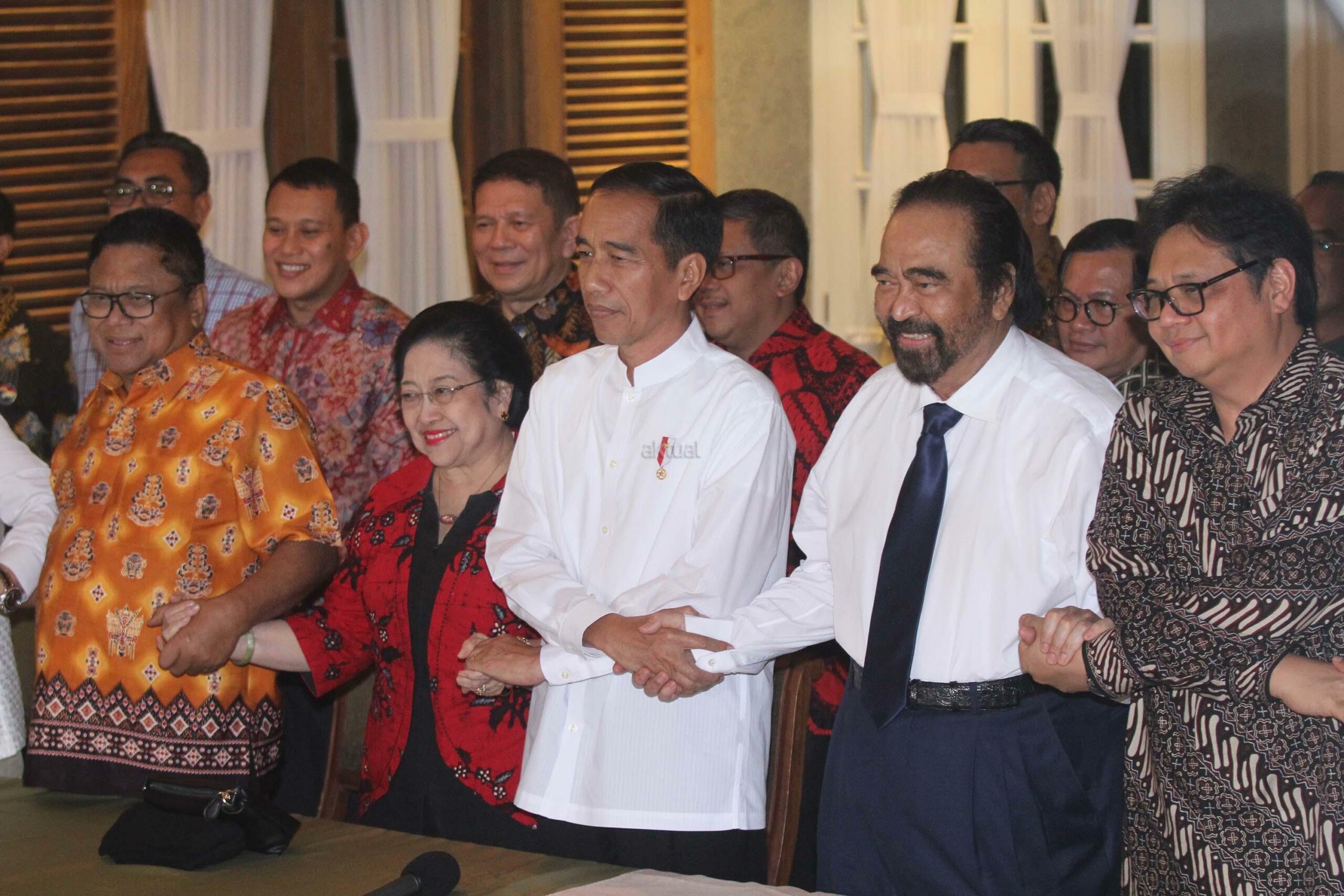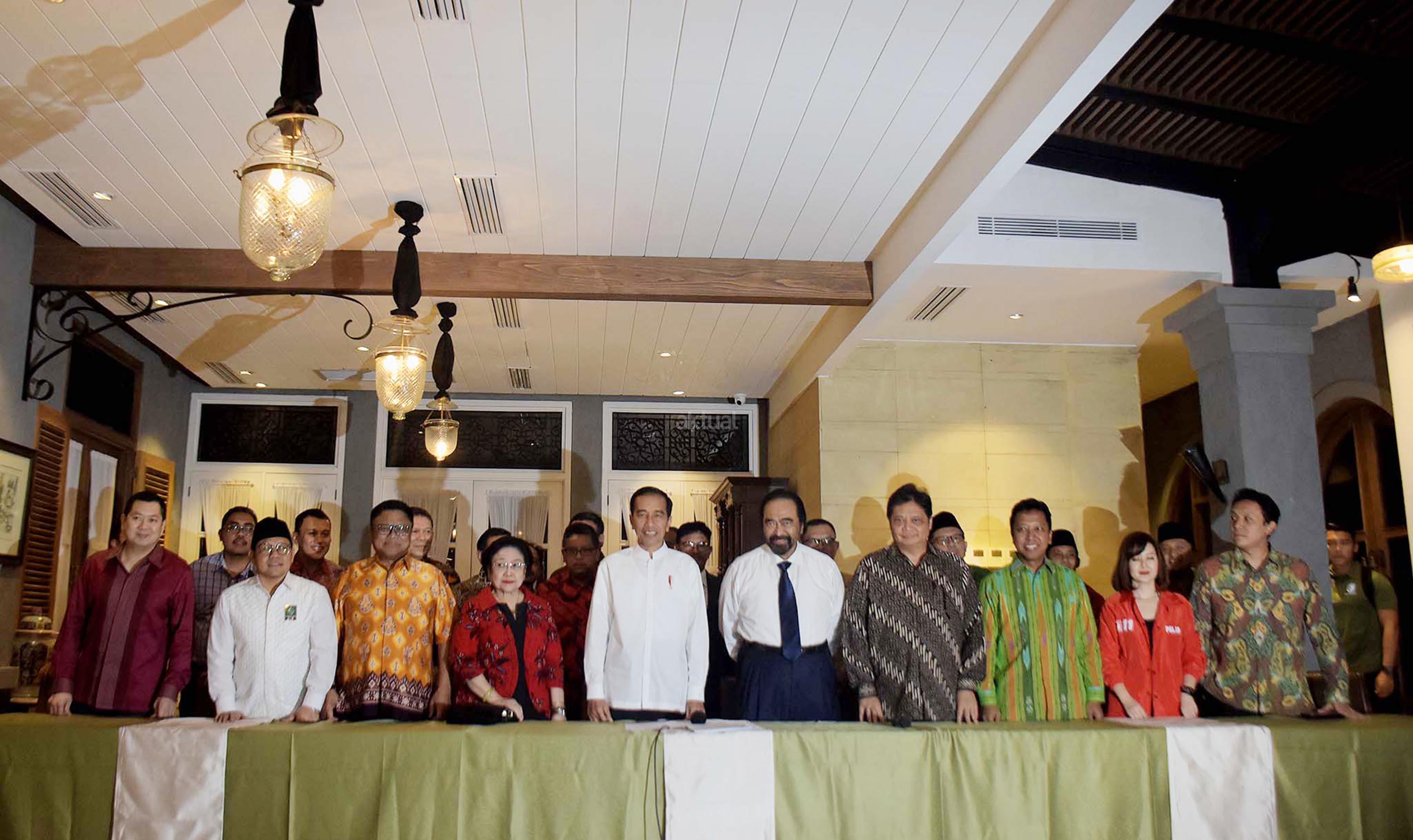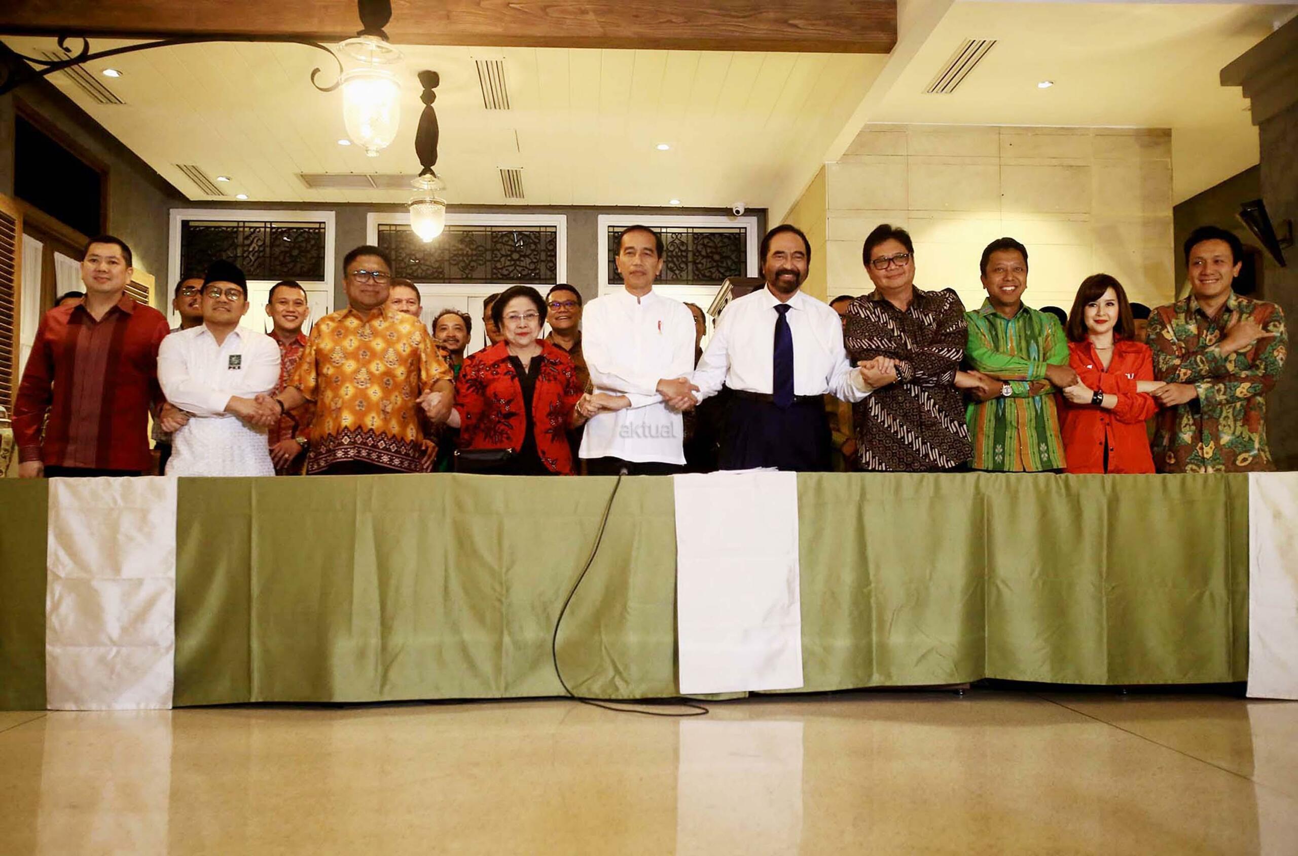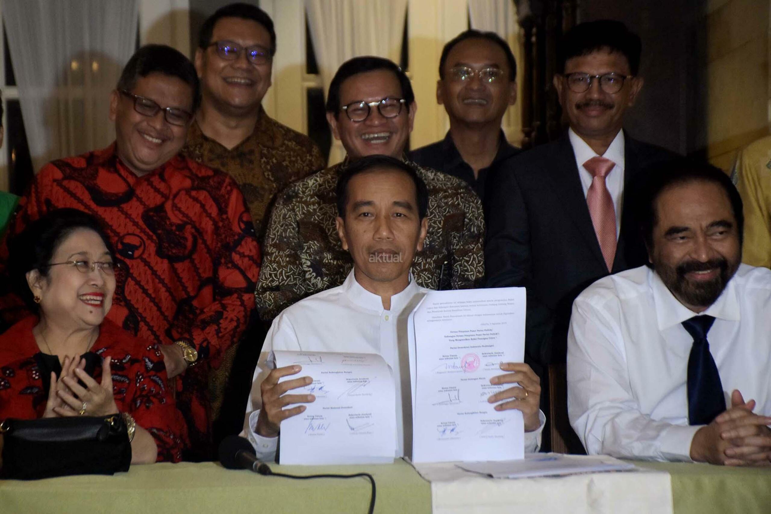 Presiden Joko Widodo (tengah) bersiap memberikan keterangan pers usai pertemuan dengan pimpinan partai dan sekjen partai pengusung koalisi di kawasan Menteng Jakarta Pusat, Kamis (9/8/2018) sore. Hasil pertemuan tersebut memutuskan KH Ma’ruf Amin sebagai cawapres yang akan mendampingi Jokowi pada Pilpres 2019. AKTUAL/Tino Oktaviano