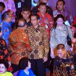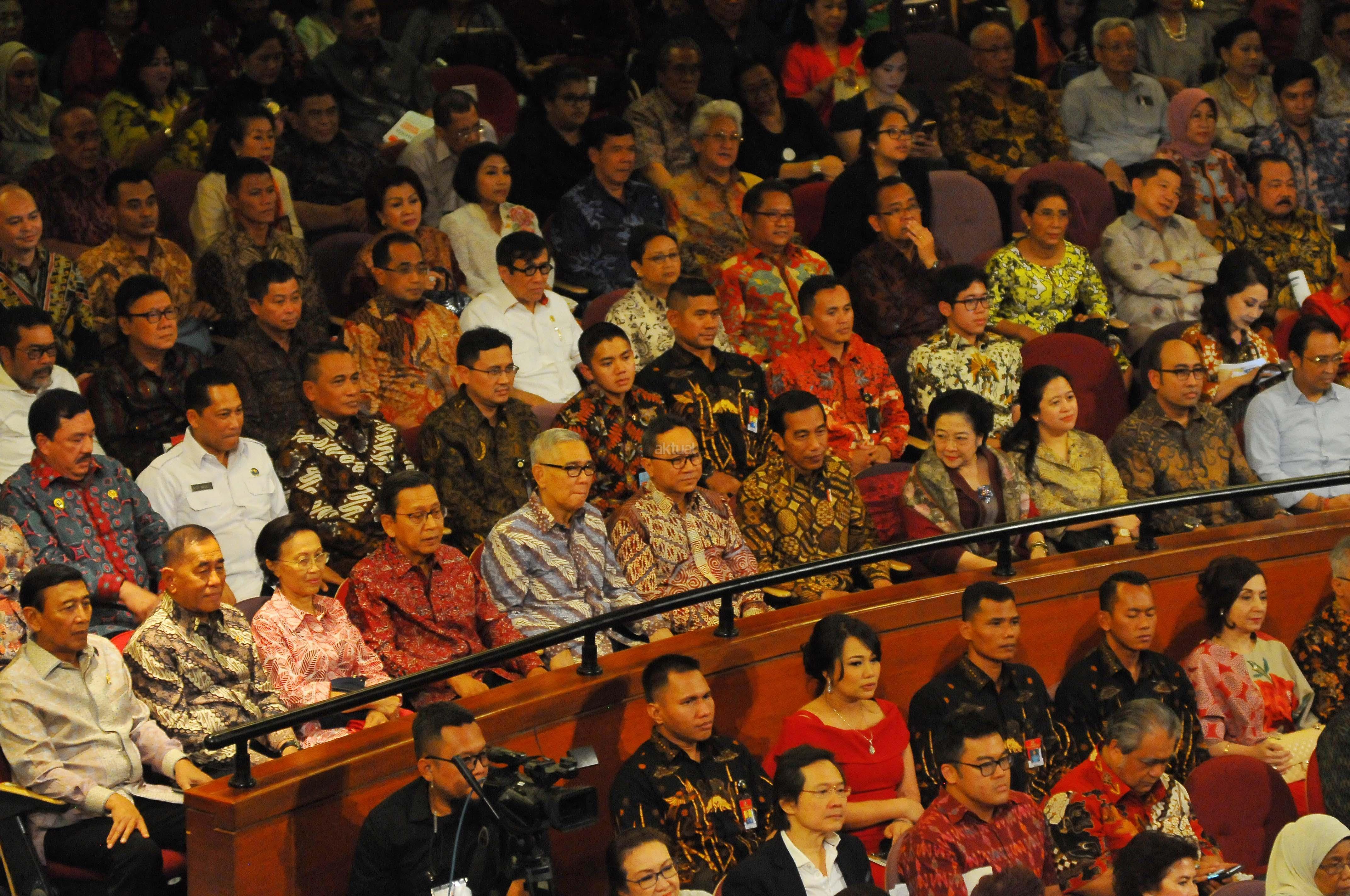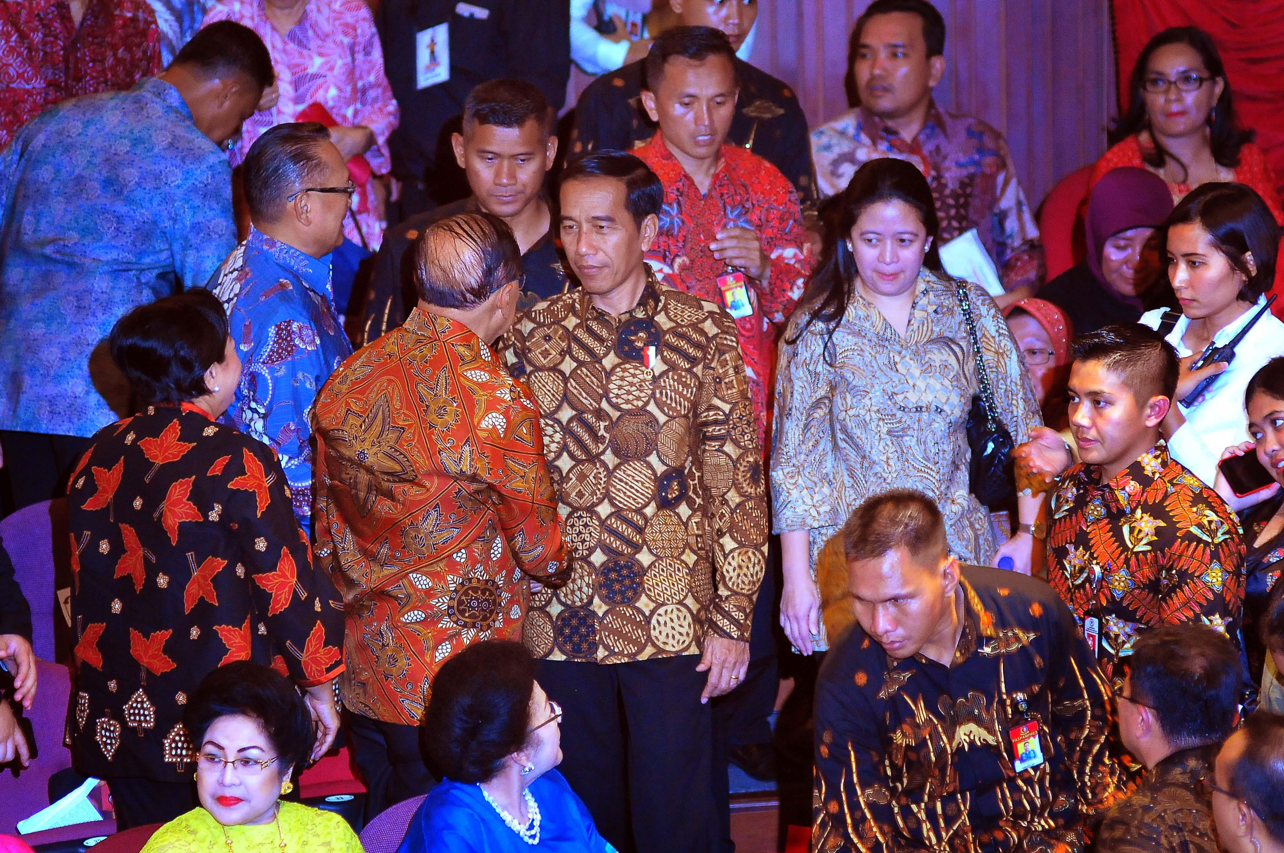 Presiden Joko Widodo saat menghadiri Ulang Tahun Megawati Soekarno Putri di Taman Ismail Marzuki, Jakarta, Senin (23/1). Perayaan hari ulang tahun ke-70 Ketua Umum PDI Perjuangan Megawati Soekarno Putri di rayakan dengan menonton bersama Pementasan teater kebangsaan TRIPIKALA. AKTUAL/Tino Oktaviano
