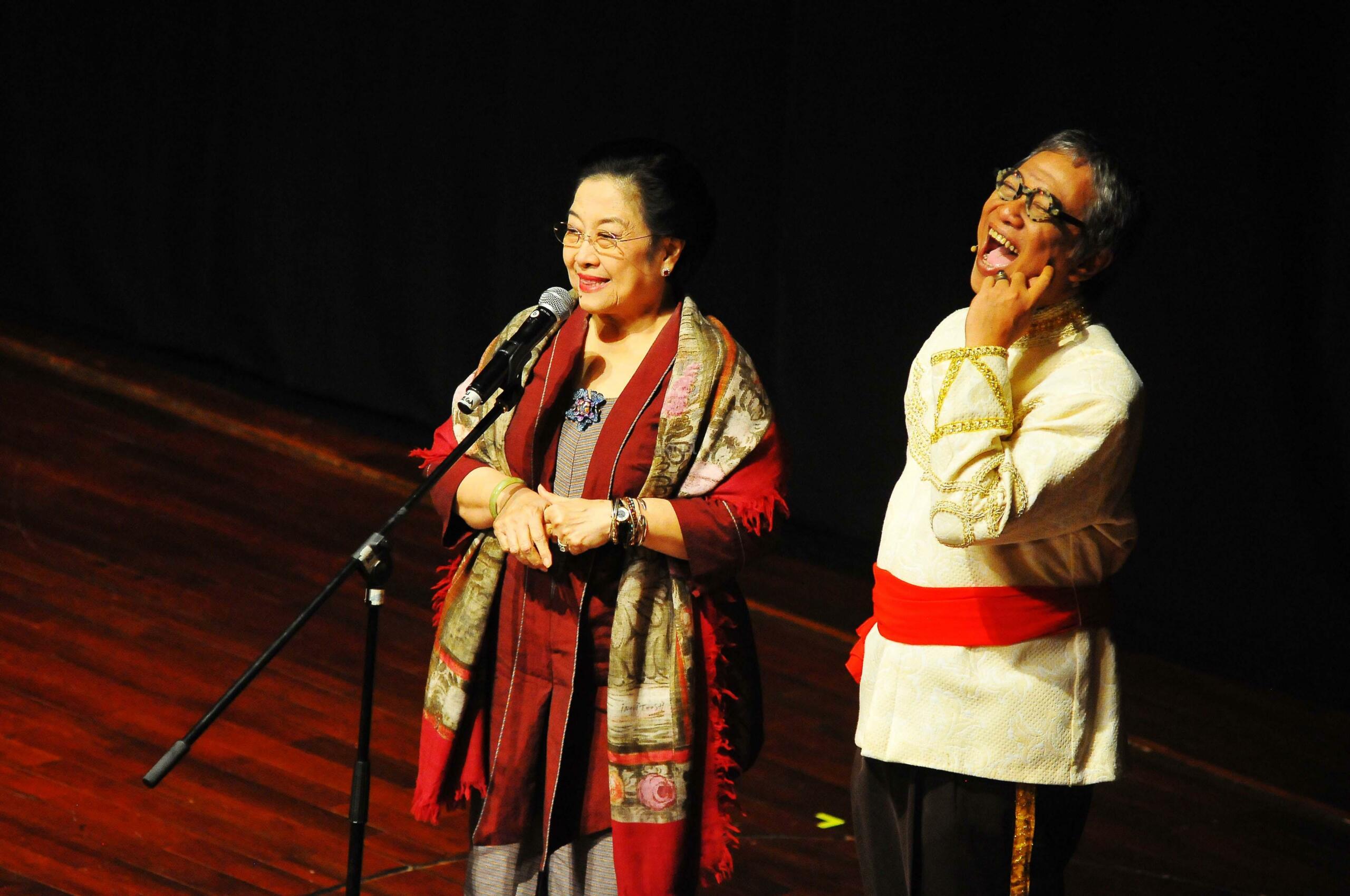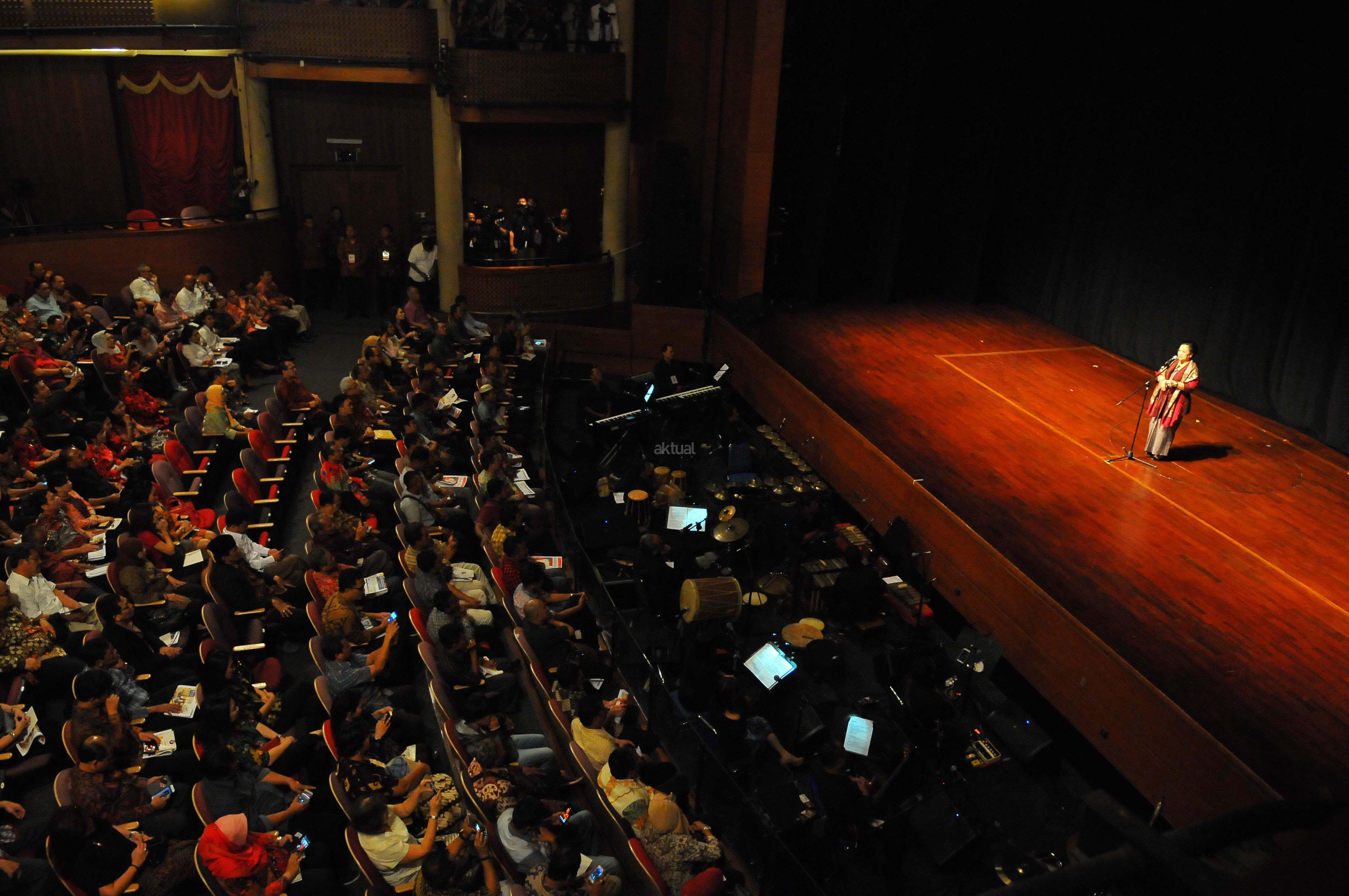 Ketua Umum PDI Perjuangan Megawati Soekarno Putri saat menyampaikan pidato saat Ulang Tahun di Taman Ismail Marzuki, Jakarta, Senin (23/1). Perayaan hari ulang tahun ke-70 rayakan dengan menonton bersama Pementasan teater kebangsaan TRIPIKALA. AKTUAL/Tino Oktaviano