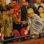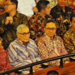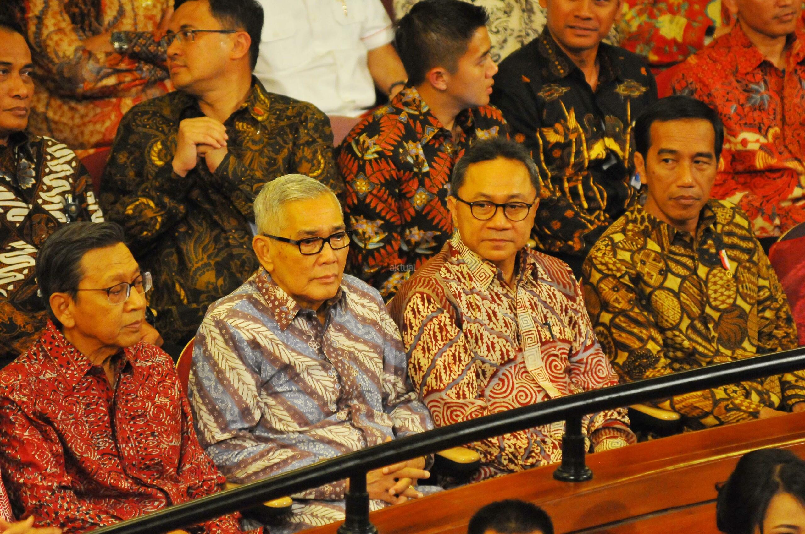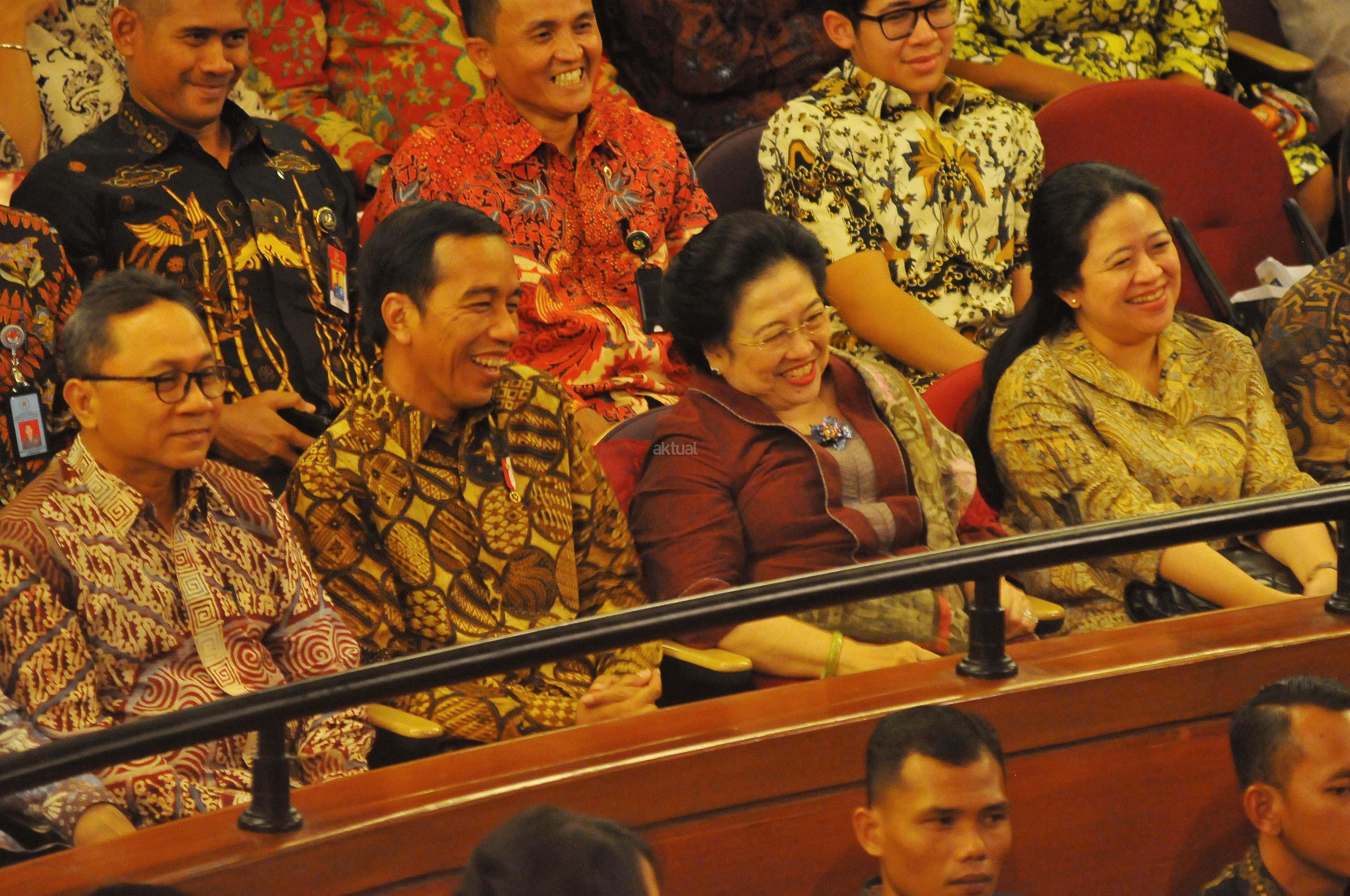 Mantan Wapres Boediono, Mantan Wapres Tri Sutrisno, Ketua MPR Zulkifli Hasan dan Presiden Joko Widodo saat menghadiri Ulang Tahun Megawati Soekarno Putri di Taman Ismail Marzuki, Jakarta, Senin (23/1). Perayaan hari ulang tahun ke-70 Ketua Umum PDI Perjuangan Megawati Soekarno Putri di rayakan dengan menonton bersama Pementasan teater kebangsaan TRIPIKALA. AKTUAL/Tino Oktaviano