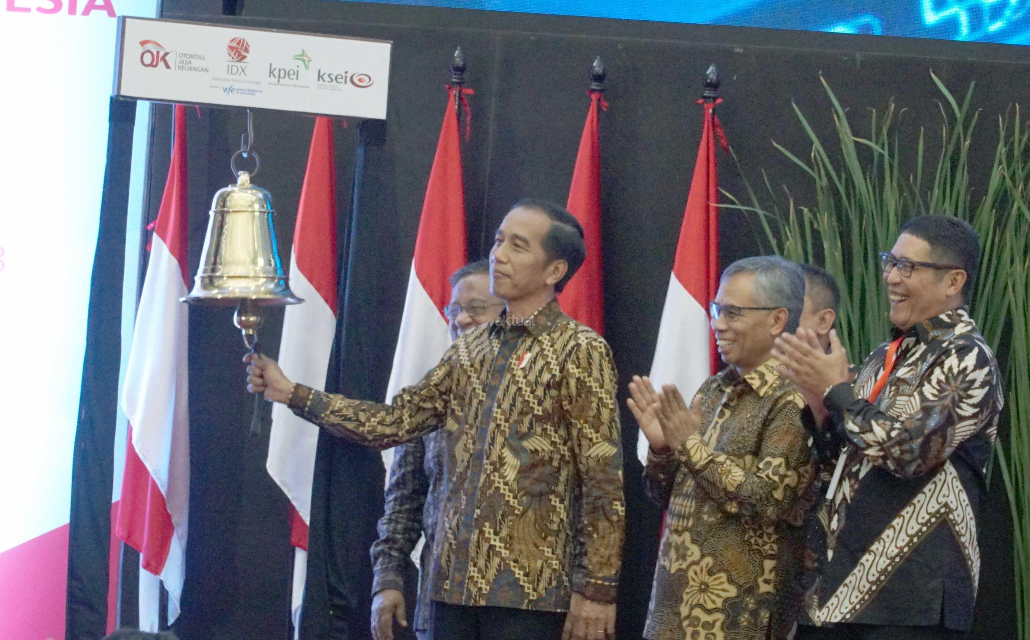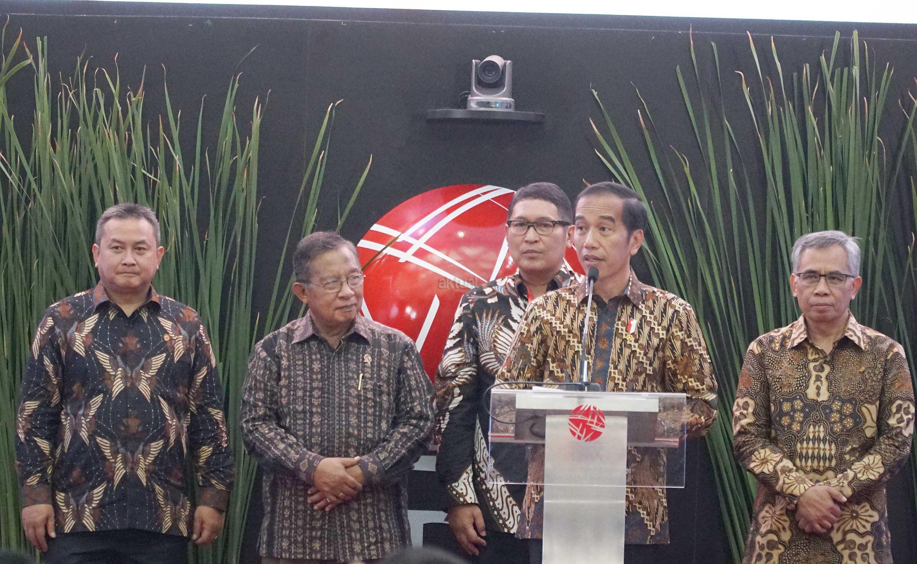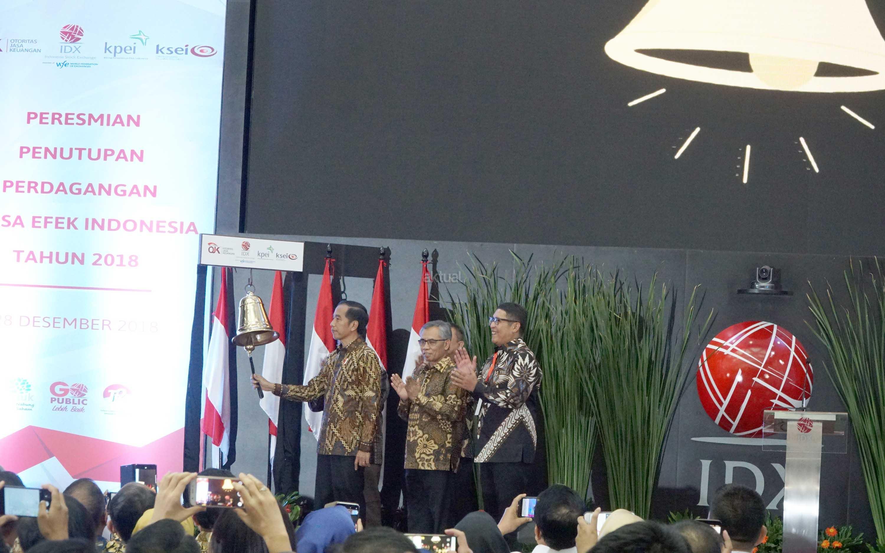 Presiden Joko Widodo didampingi Menko Perekonomian Darmin Nasution, Ketua Dewan Komisioner OJK Wimboh Santoso dan Dirut PT Bursa Efek Indonesia Inarno Djajadi melakukan seremoni penutupan Indeks Harga Saham Gabungan (IHSG) 2018 di kantor Bursa Efek Indonesia, Jakarta, Jumat (28/12/2018). Perdagangan IHSG 2018 resmi ditutup dengan menguat sebesar 0,06 persen atau 3,86 poin ke level 6.194,50. AKTUAL/Eko S Hilman