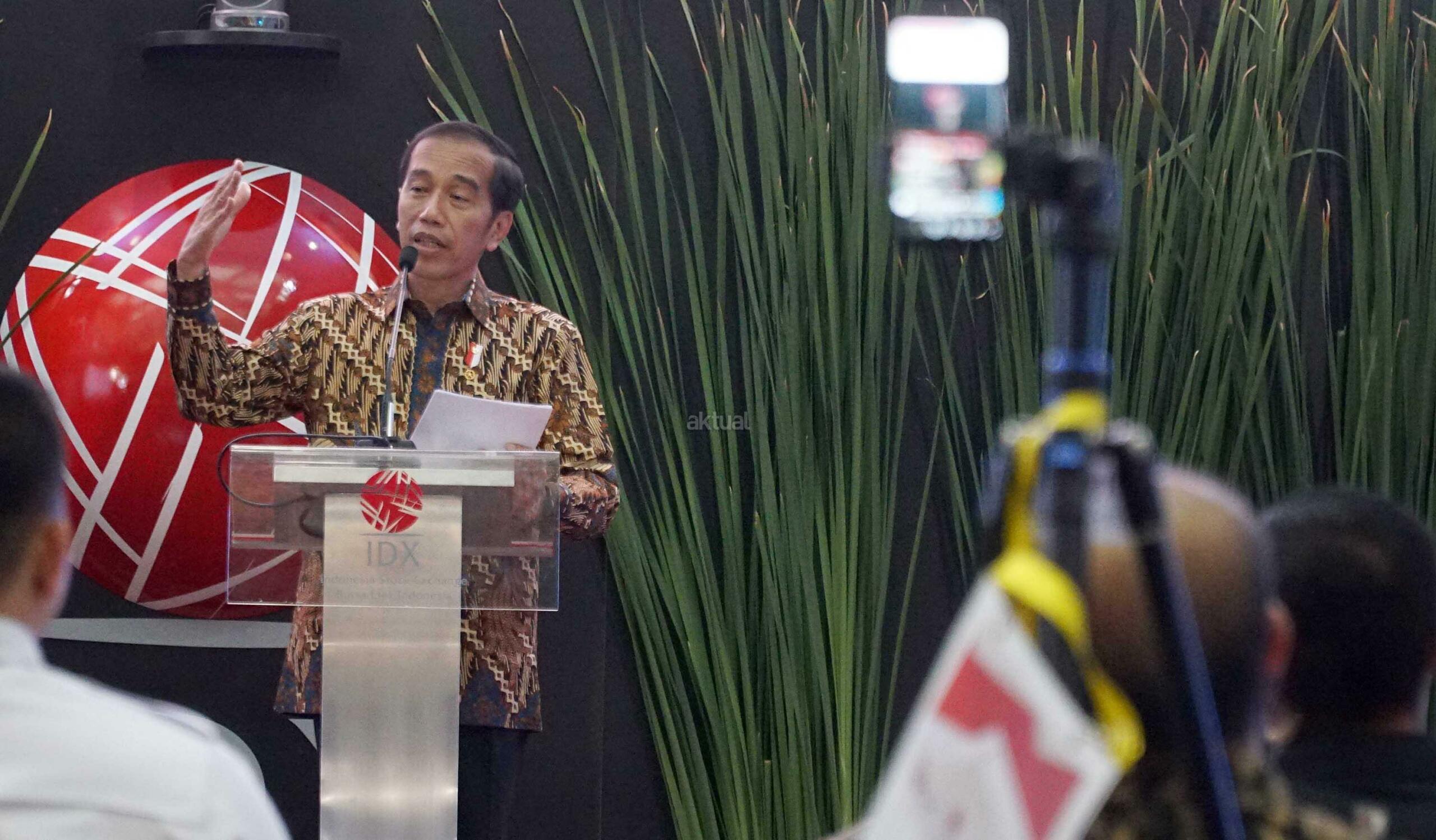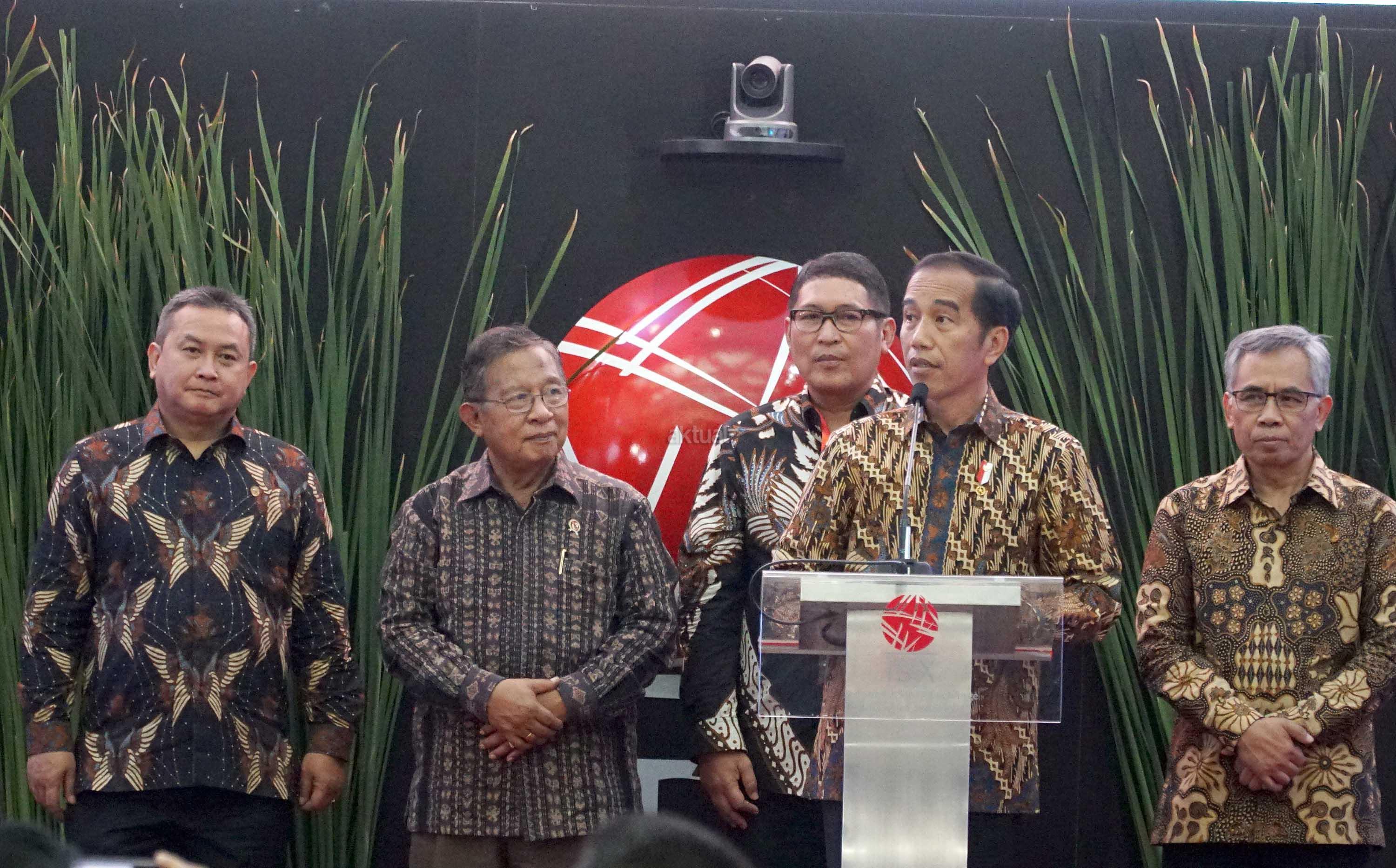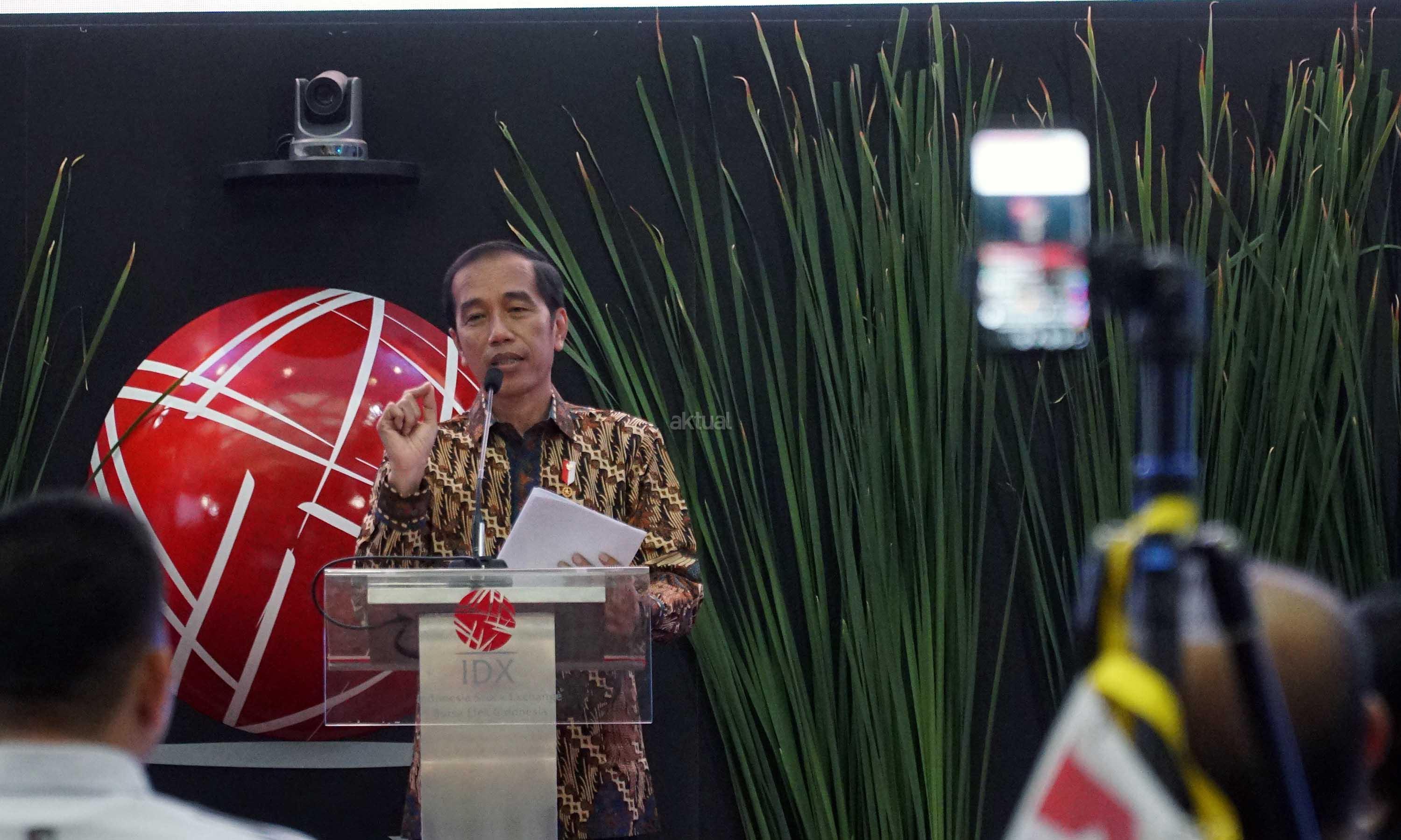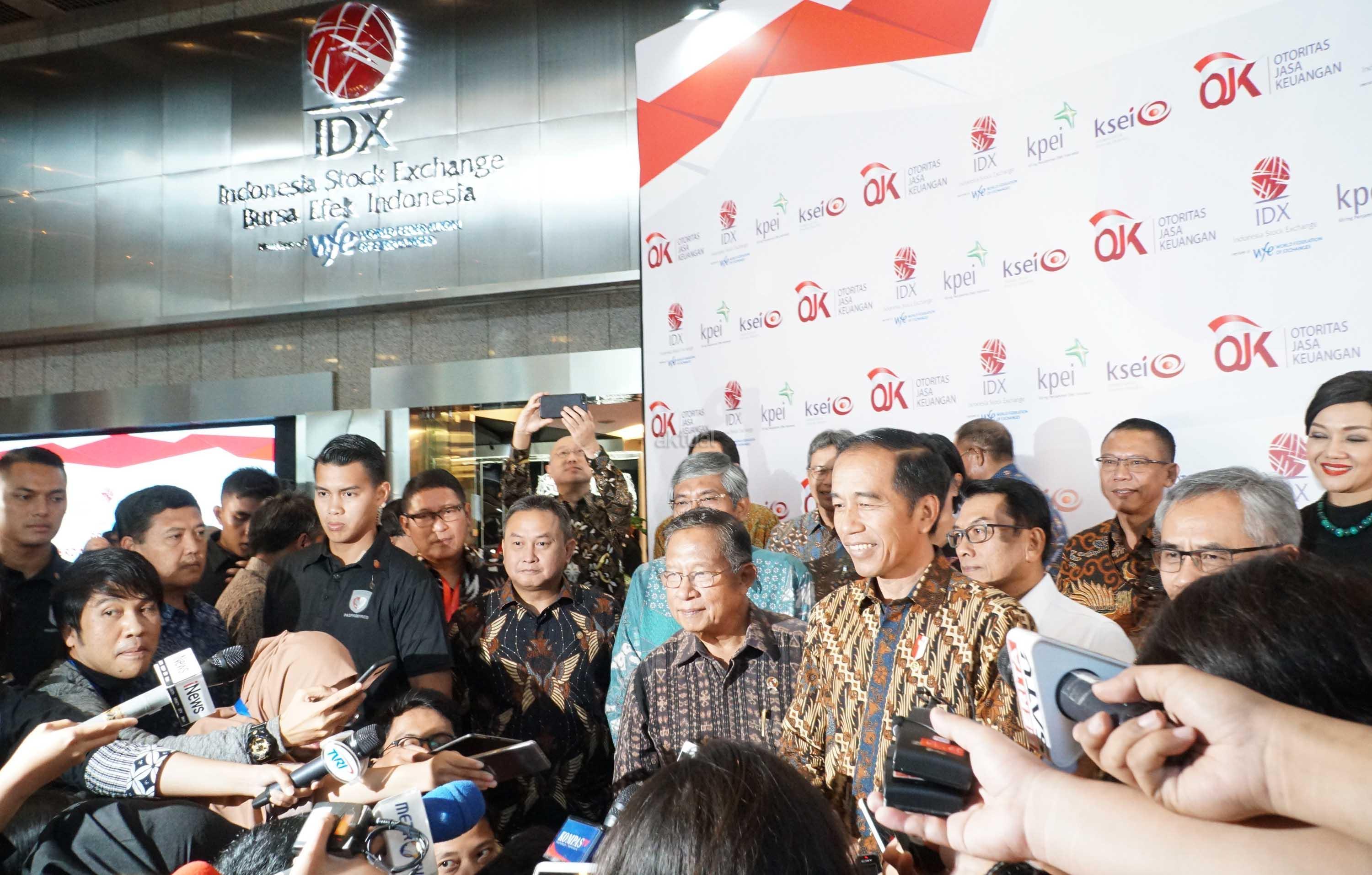 Presiden Joko Widodo didampingi Menko Perekonomian Darmin Nasution, Ketua Dewan Komisioner OJK Wimboh Santoso dan Dirut PT Bursa Efek Indonesia Inarno Djajadi melakukan seremoni penutupan Indeks Harga Saham Gabungan (IHSG) 2018 di kantor Bursa Efek Indonesia, Jakarta, Jumat (28/12/2018). Perdagangan IHSG 2018 resmi ditutup dengan menguat sebesar 0,06 persen atau 3,86 poin ke level 6.194,50. AKTUAL/Eko S Hilman