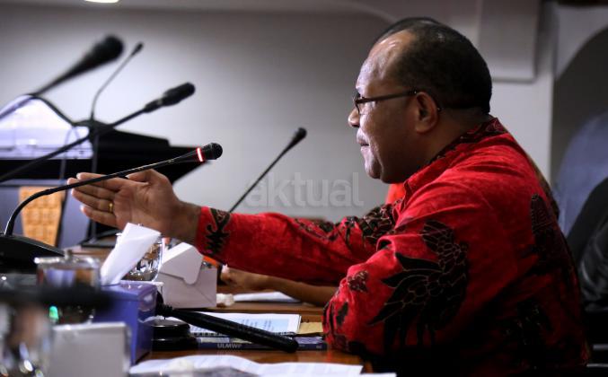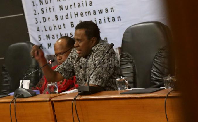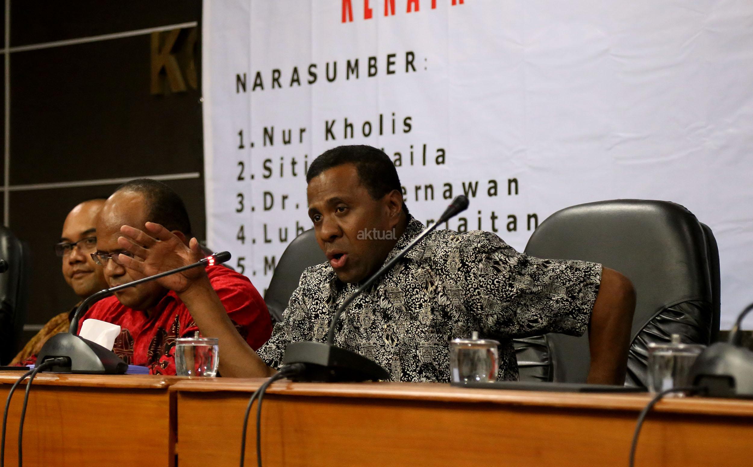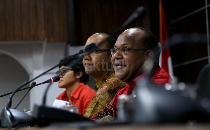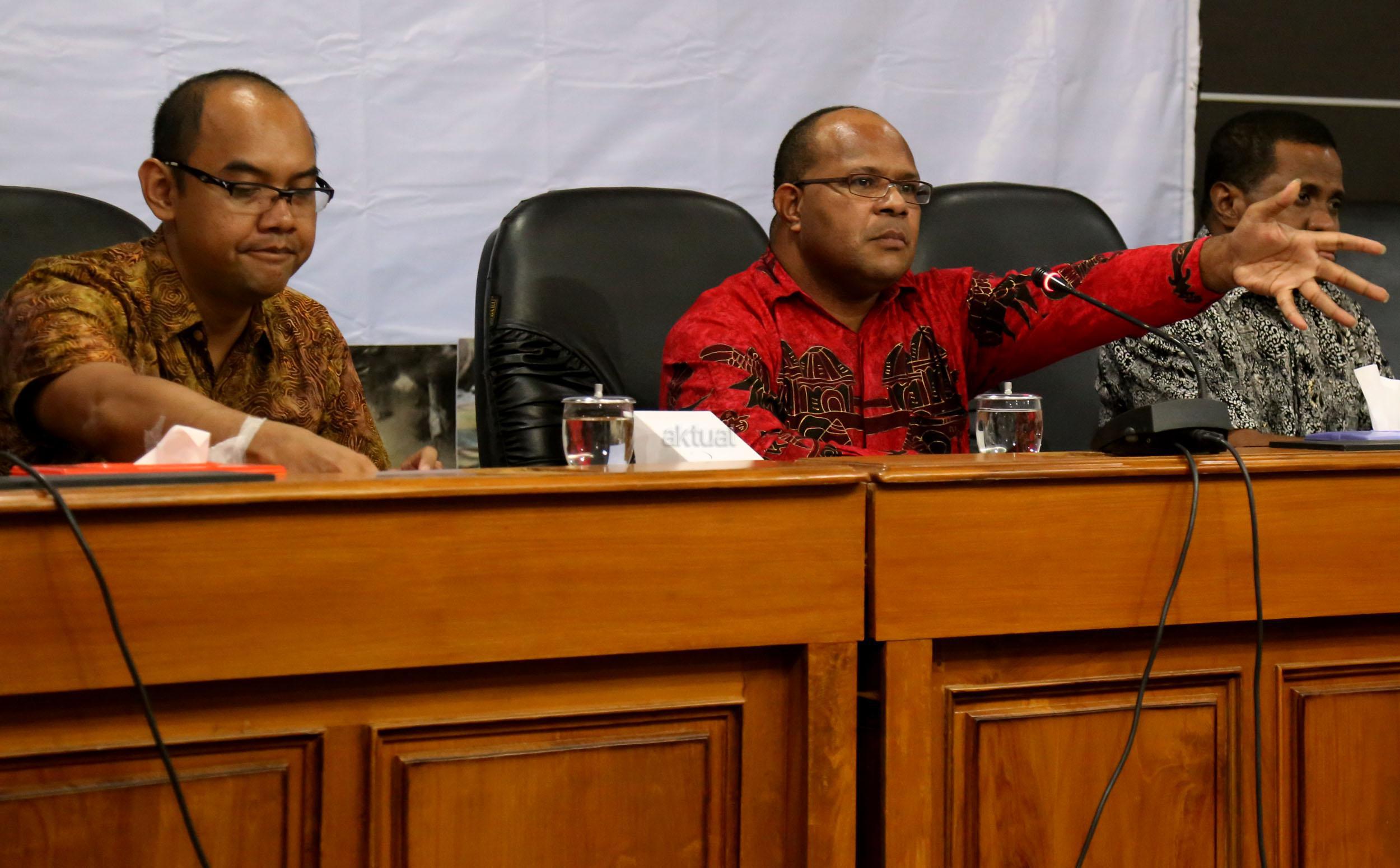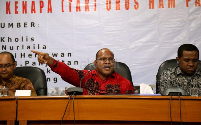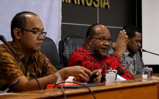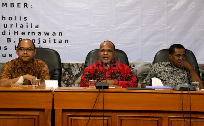 Kiri-kanan ;Peneliti Elsam dan Abdurrahman Wahid Center UI Budi Hernawan, Anggota Tim Kerja United Liberation Movement for West Papua (ULMWP) Markus Haluk, Pengamat Hukum Universitas Cenderawasih Marinus Yaung menghadiri diskusi yang bertema "Jokowi, Kenapa Tak Urus HAM Papua" di kantor Komnas HAM, Jakarta, Jumat (4/3/2016). Diskusi tersebut untuk mengingatkan kembali Pemerintahan Joko Widodo agar memprioritaskan masalah HAM dan kemanusian serta perdamaian di Papua.