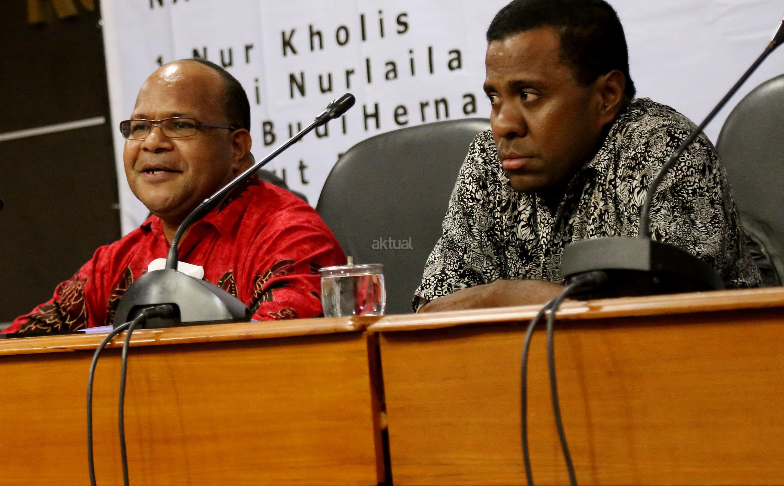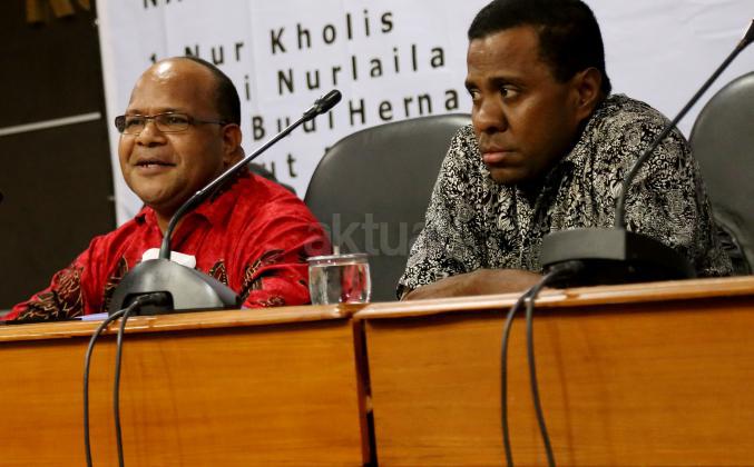Pengamat Hukum Universitas Cenderawasih Marinus Yaung (kanan) bersama Anggota Tim Kerja United Liberation Movement for West Papua (ULMWP) Markus Haluk (kiri) menghadiri diskusi yang bertema "Jokowi, Kenapa Tak Urus HAM Papua" di kantor Komnas HAM, Jakarta, Jumat (4/3/2016). Diskusi tersebut untuk mengingatkan kembali Pemerintahan Joko Widodo agar memprioritaskan masalah HAM dan kemanusian serta perdamaian di Papua.