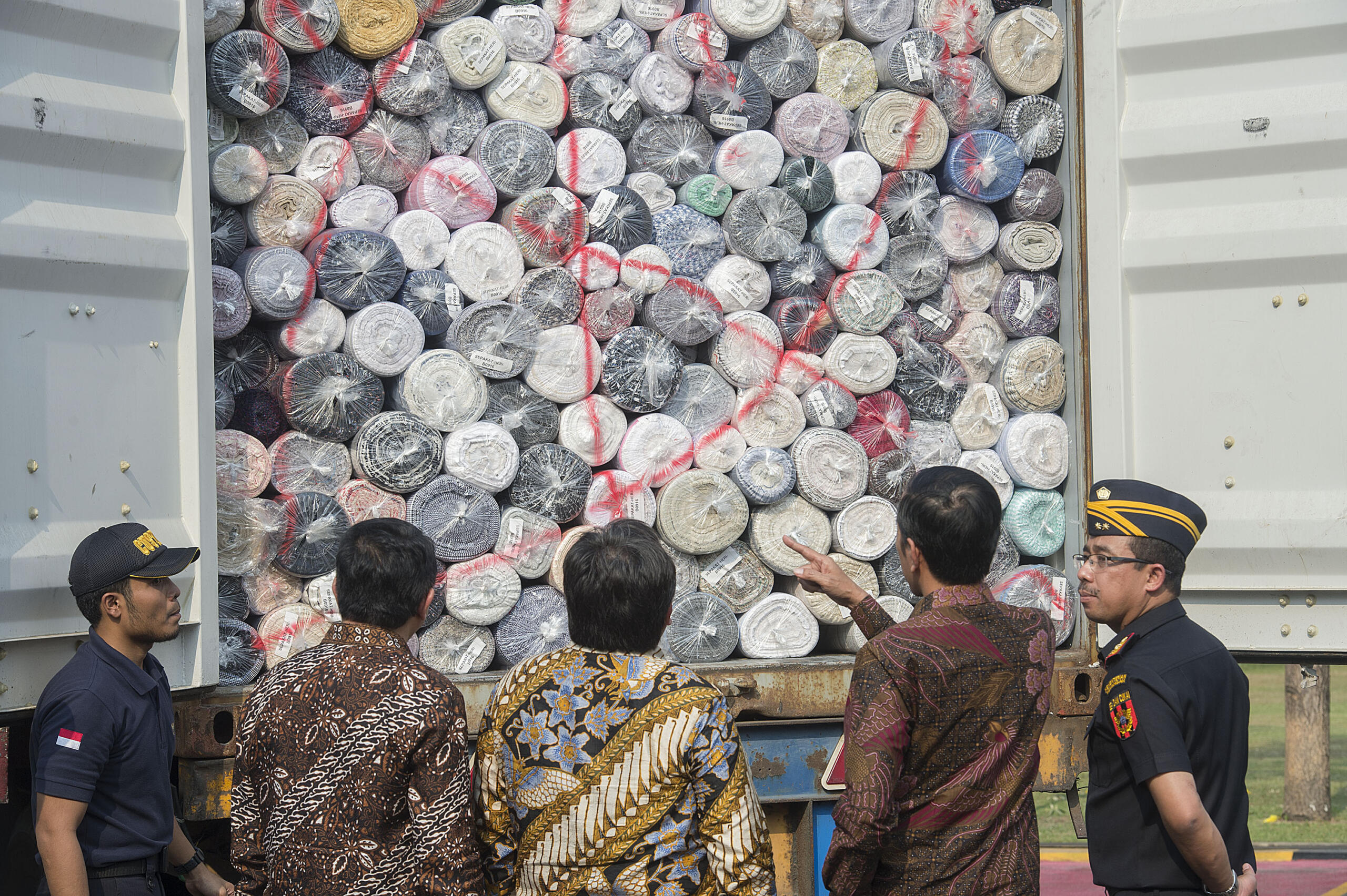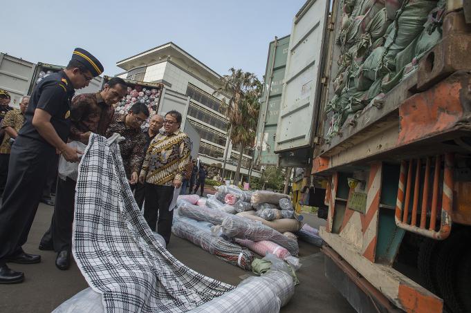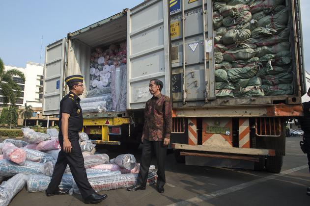 Presiden Joko Widodo (kanan) didampingi Dirjen Bea Cukai Heru Pambudi (kiri) melihat hasil penindakan impor tekstil ilegal dari Tiongkok di halaman Kantor Pusat Bea Cukai, Jakarta, Jumat (16/10). Ditjen Bea Cukai berhasil menindak empat kontainer berisi tekstil impor ilegal atau selundupan dari Tiongkok senilai Rp14 miliar yang telah merugikan negara sekitar Rp 2,3 miliar karena tidak membayar bea masuk dan merusak industri tekstil nasional. ANTARA FOTO/Widodo S. Jusuf/aww/15.