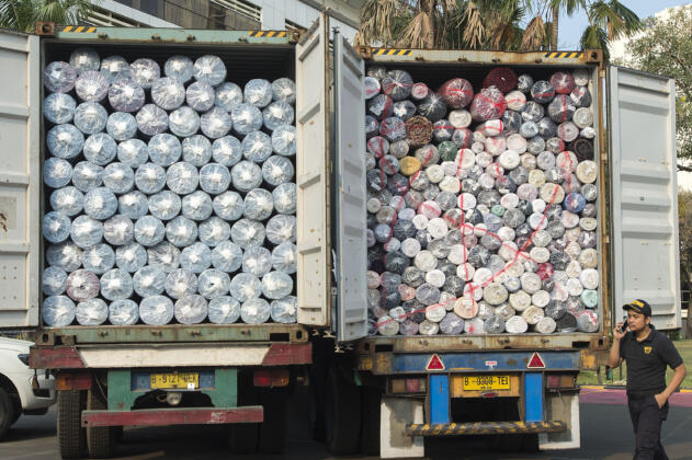 Petugas Ditjen Bea Cukai berdiri di dekat kontainer berisi impor tekstil ilegal dari Tiongkok di halaman Kantor Pusat Bea Cukai, Jakarta, Jumat (16/10). Ditjen Bea Cukai berhasil menindak empat kontainer berisi tekstil impor ilegal atau selundupan dari Tiongkok senilai Rp14 miliar yang telah merugikan negara sekitar Rp 2,3 miliar karena tidak membayar bea masuk dan merusak industri tekstil nasional. ANTARA FOTO/Widodo S. Jusuf/aww/15.