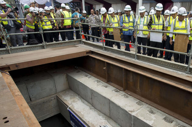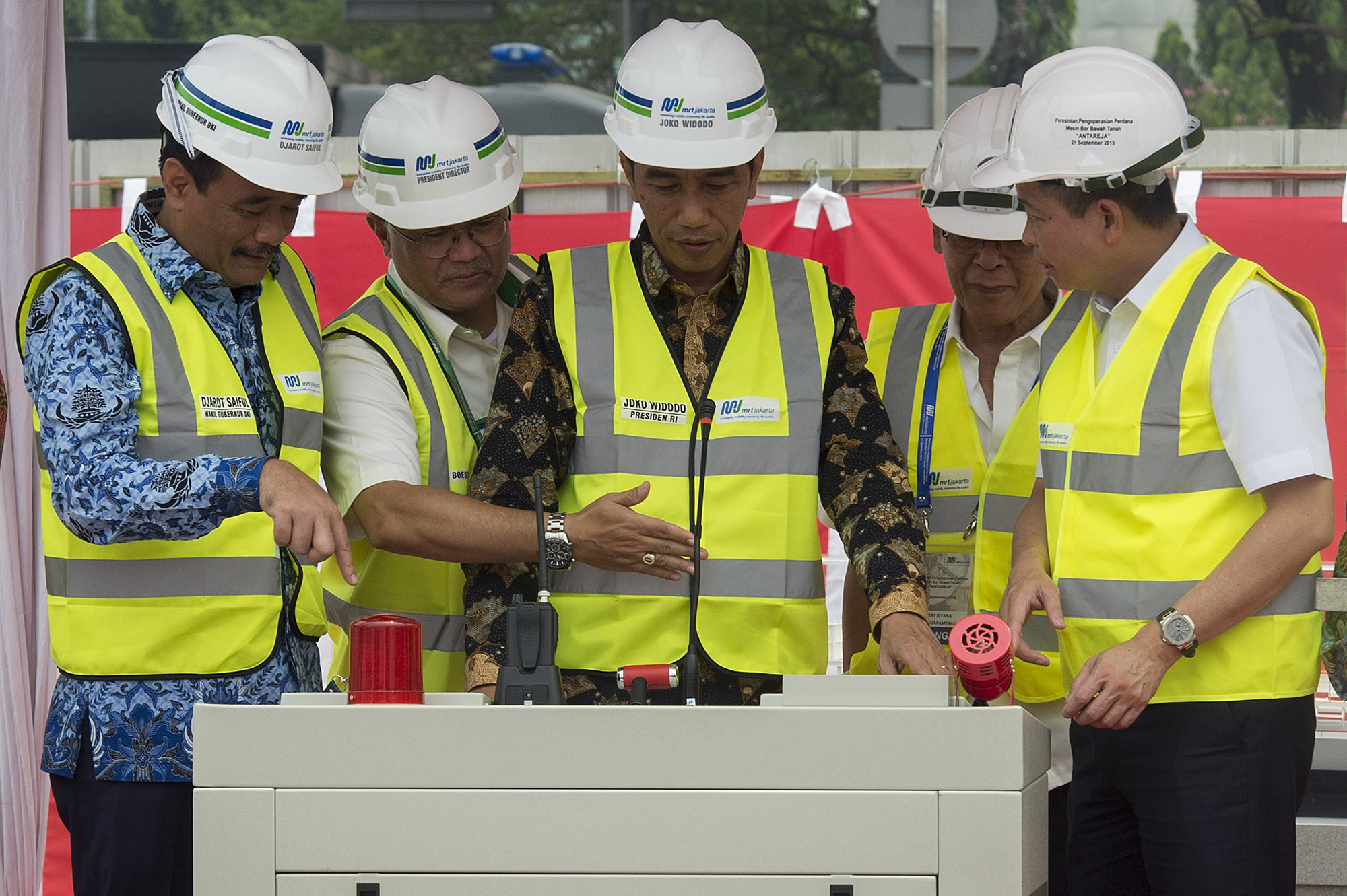 Presiden Joko Widodo (keempat kanan) didampingi Menhub Ignasius Jonan (kedua kanan), Menteri PU dan Pera Basuki Hadimuljono (kanan) dan Dirut PT MRT Jakarta Dono Boestami (kelima kanan) meninjau pengoperasian perdana mesin bor bawah tanah Antareja di titik Proyek MRT Patung Pemuda, Senayan, Jakarta, Senin (21/9). Mesin bor bawah tanah ini memiliki diameter 6,7 meter, total panjang 43 meter dengan bobot mencapai 323 ton tersebut akan mampu melakukan pengeboran terowongan jalur bawah tanah MRT dengan kecepatan delapan meter per hari. ANTARA FOTO/Widodo S. Jusuf/foc/15.