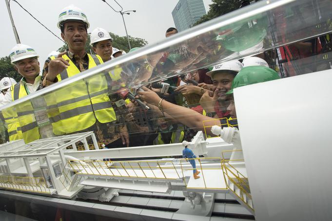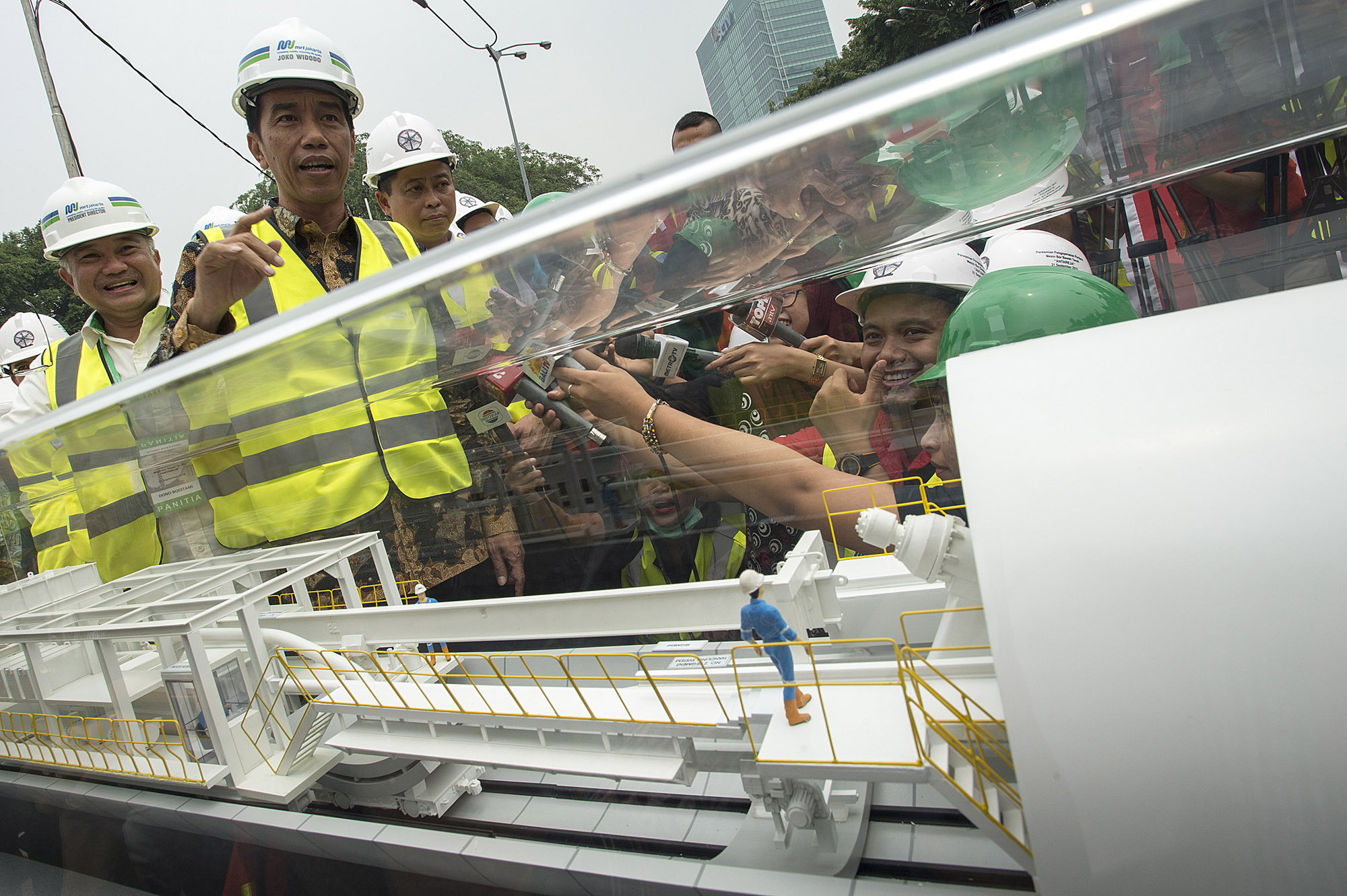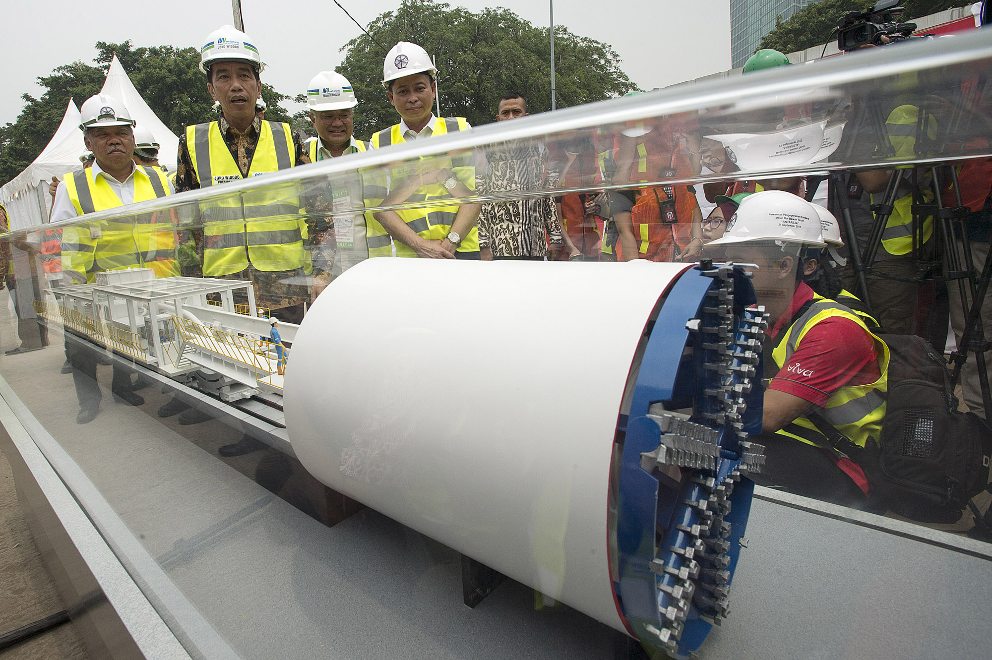 Presiden Joko Widodo (kedua kiri) didampingi Menhub Ignasius Jonan (ketiga kiri) dan Dirut PT MRT Jakarta Dono Boestami (kiri) melihat maket mesin bor bawah tanah Antareja usai meresmikan pengoperasian perdana mesin tersebut di titik Proyek MRT Patung Pemuda, Senayan, Jakarta, Senin (21/9). Mesin bor bawah tanah ini memiliki diameter 6,7 meter, total panjang 43 meter dengan bobot mencapai 323 ton tersebut akan mampu melakukan pengeboran terowongan jalur bawah tanah MRT dengan kecepatan delapan meter per hari. ANTARA FOTO/Widodo S. Jusuf/foc/15.