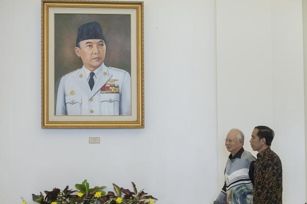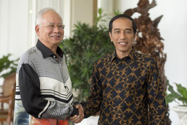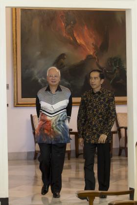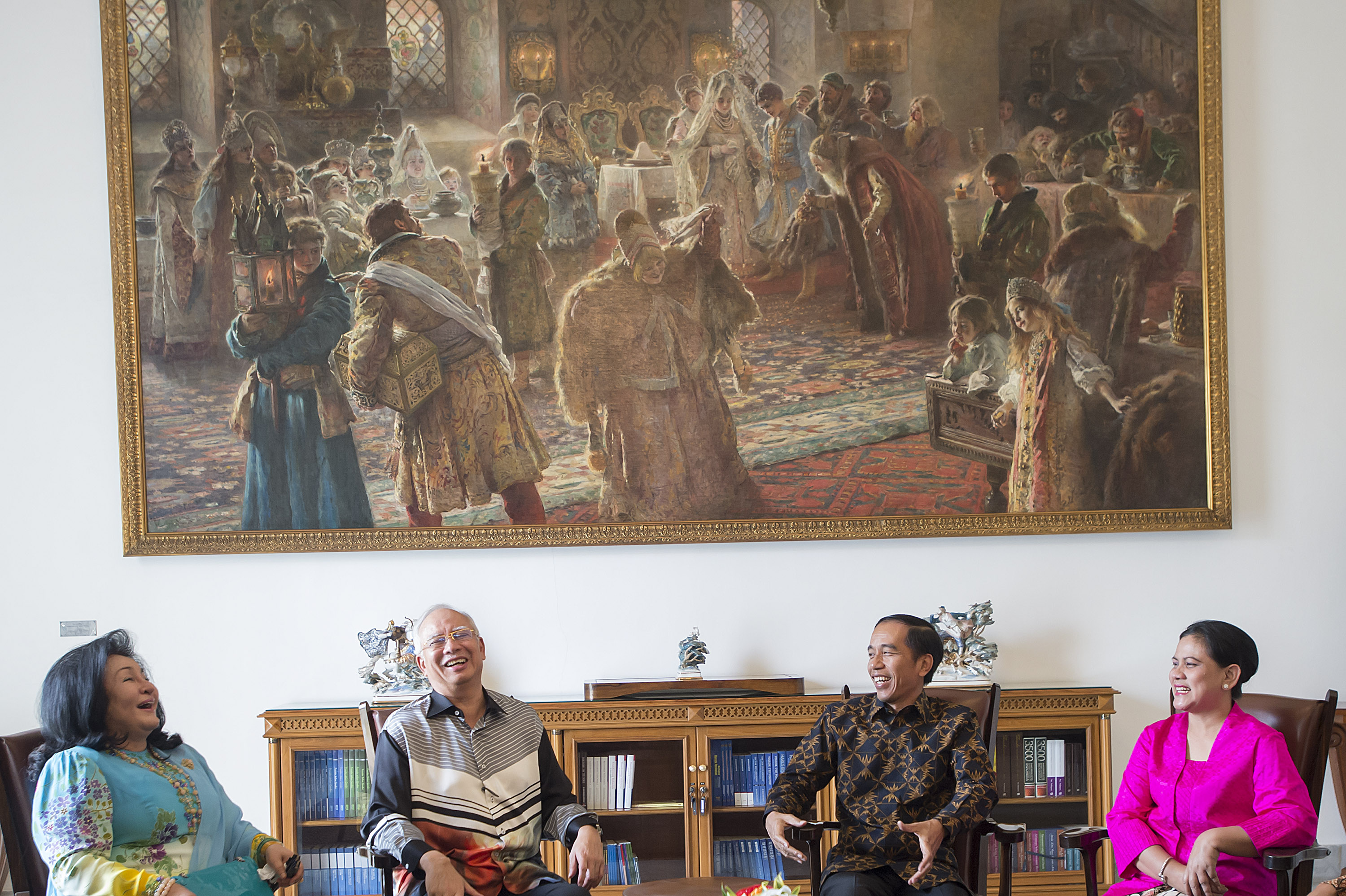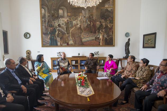 Presiden Joko Widodo (kelima kanan) didampingi Ibu Negara Ny. Iriana Joko Widodo (keempat kanan) serta sejumlah menteri berbincang dengan PM Malaysia Datuk Seri Najib Tun Razak (keempat kiri) dan Isteri Datin Seri Rosmah Mansor (ketiga kiri) serta sejumlah menteri di Istana Kepresidenan, Bogor, Jawa Barat, Minggu (11/10). Kedua pemimpin negara tersebut bertemu untuk menindaklanjuti peningkatan kerjasama bilateral di bidang industri minyak kelapa sawit dan lingkungan hidup. ANTARA FOTO/Widodo S. Jusuf/nz/15.
